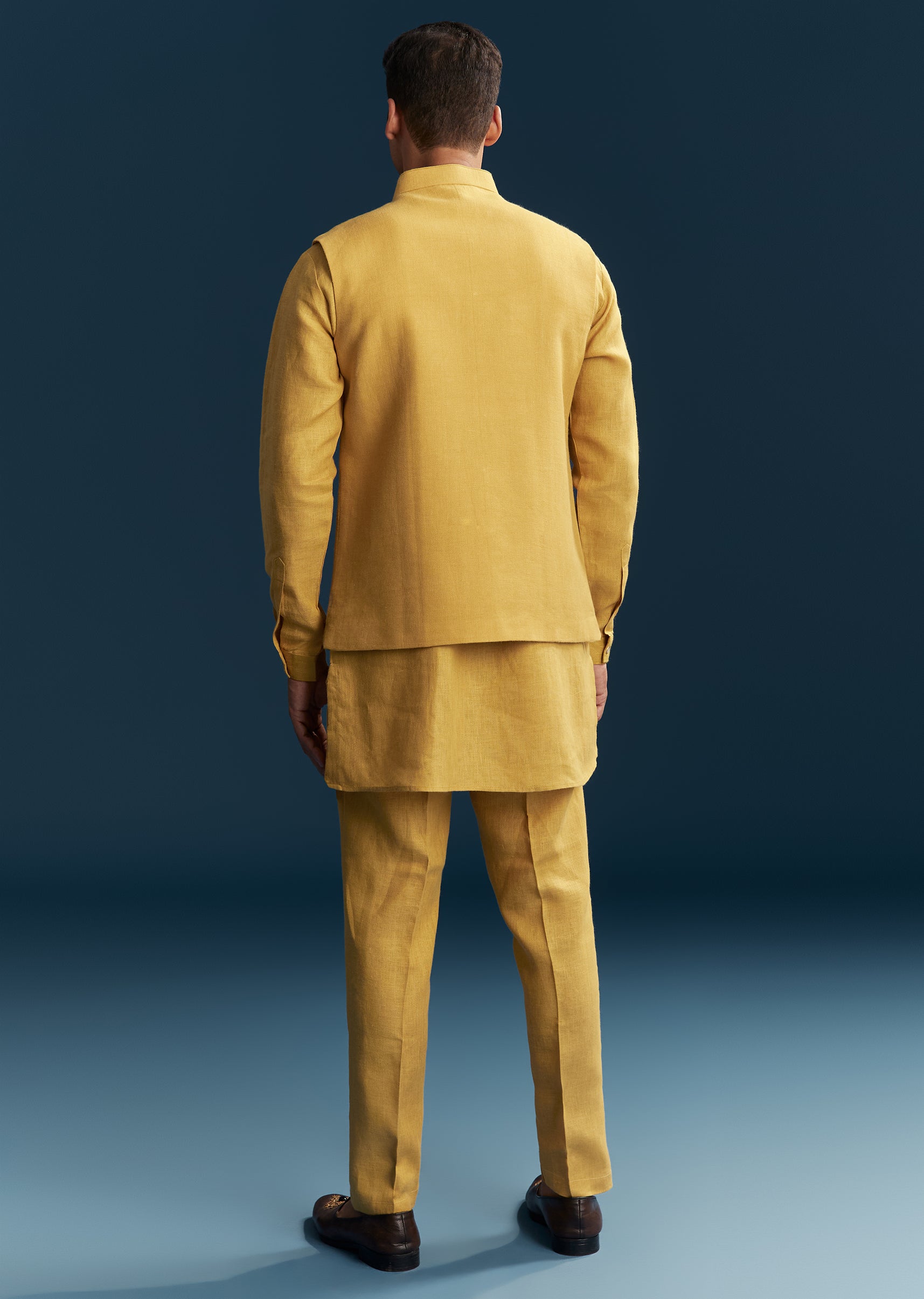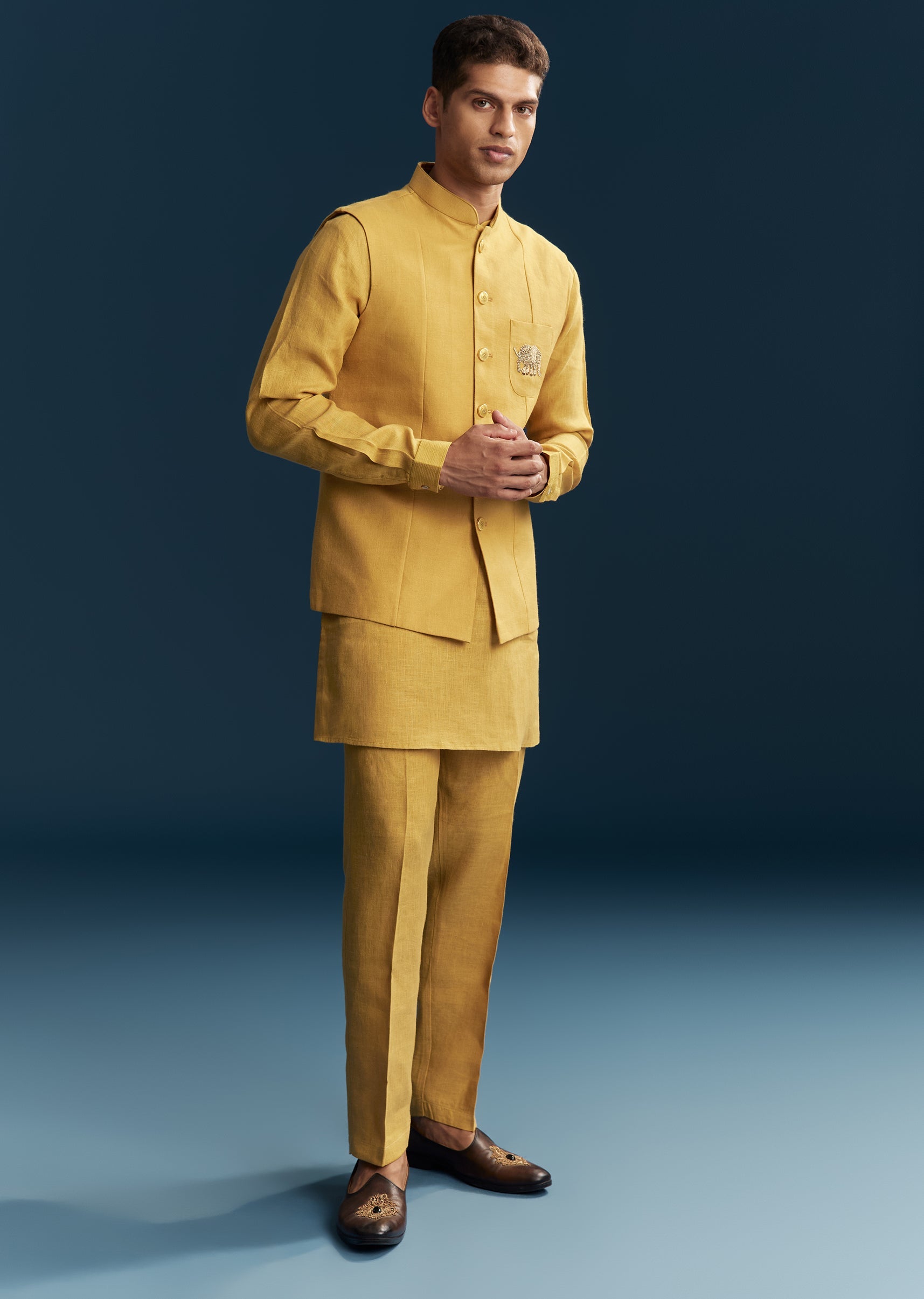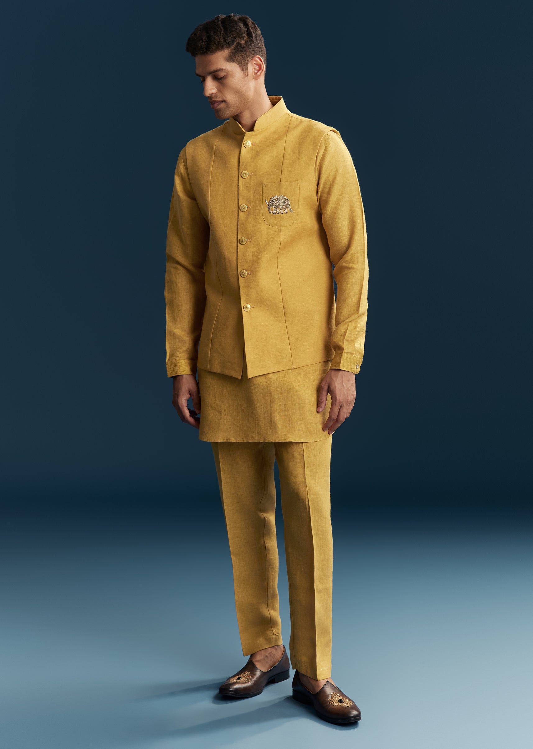 Bright and cheerful, this mustard yellow kurta jacket set is perfect for haldi and festive wedding celebrations. Crafted in smooth silk fabric, it features subtle thread detailing that adds texture and elegance to the vibrant hue. The mandarin collar and full sleeves create a structured and polished silhouette, making it ideal for a wedding guest looking for a stylish yet comfortable outfit. Designed for festive charm and ease of wear, this ensemble ensures a graceful and standout presence. Awarded as the Most Trusted Brand, we're delivering styles you love, just as promised.
