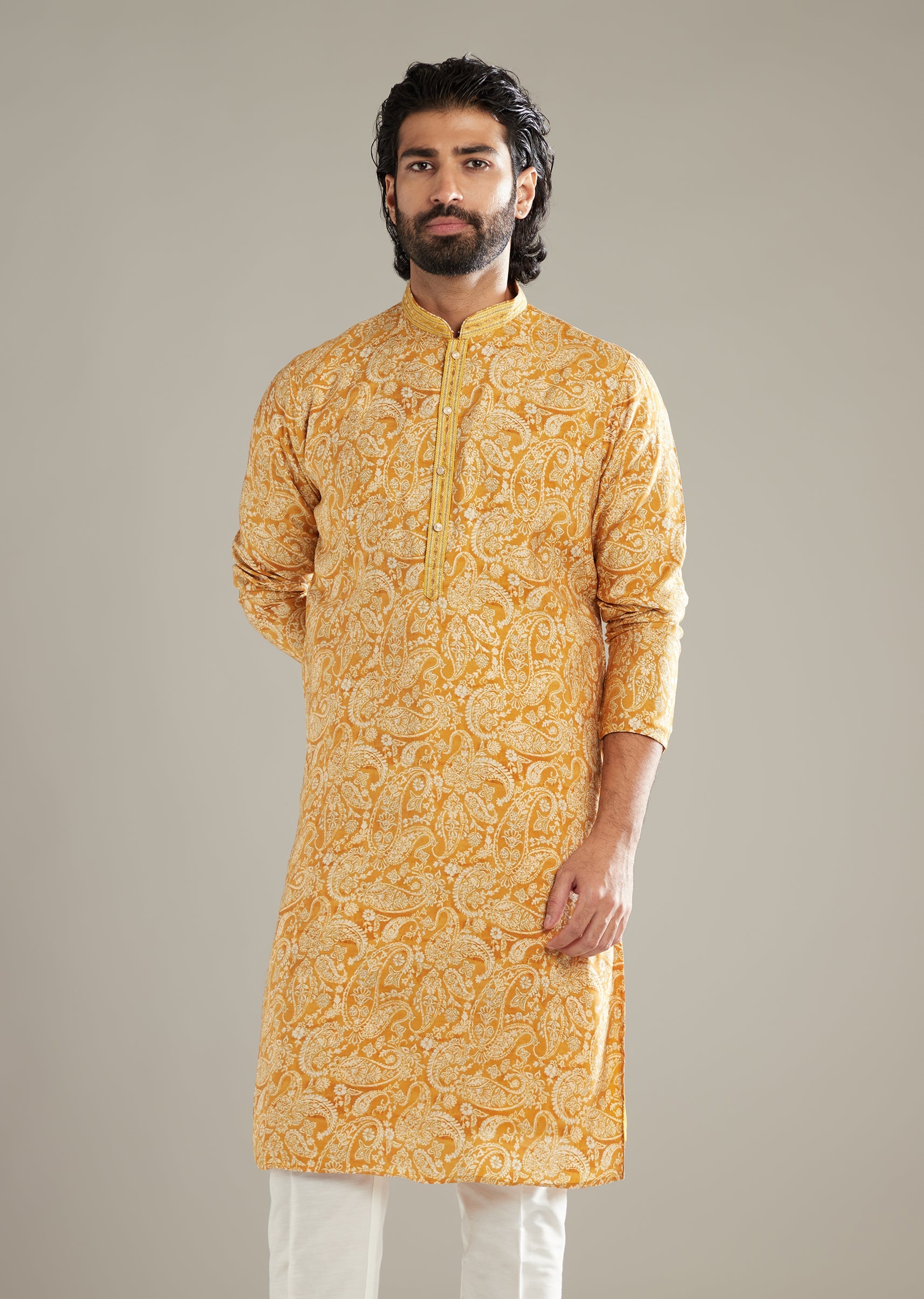 Rich and lively, this mustard yellow art silk men’s kurta set blends paisley with floral cues for a pattern that stands up well in daylight. The base keeps the print... More Product Details