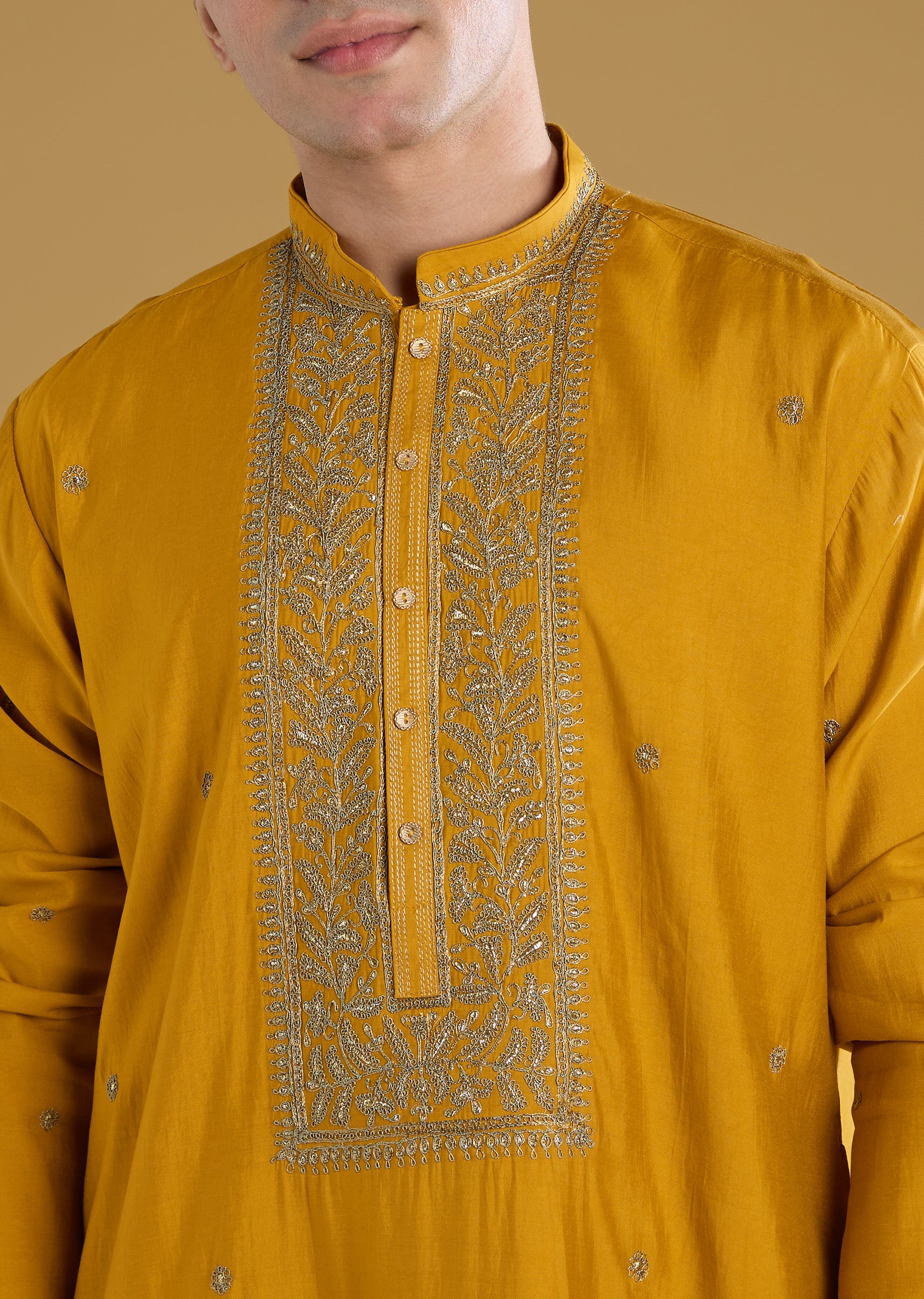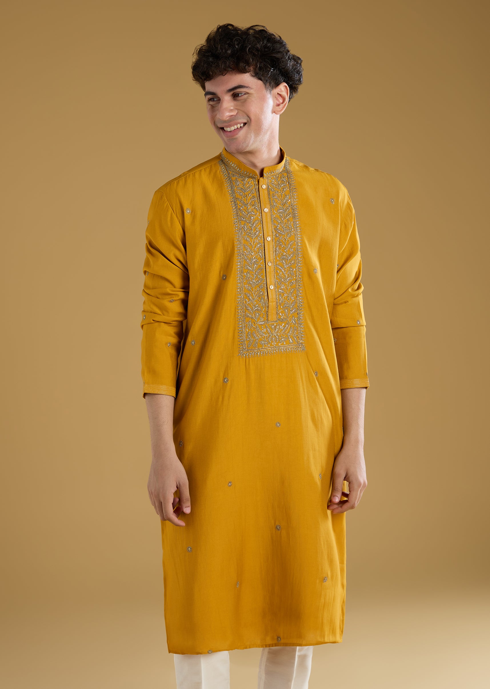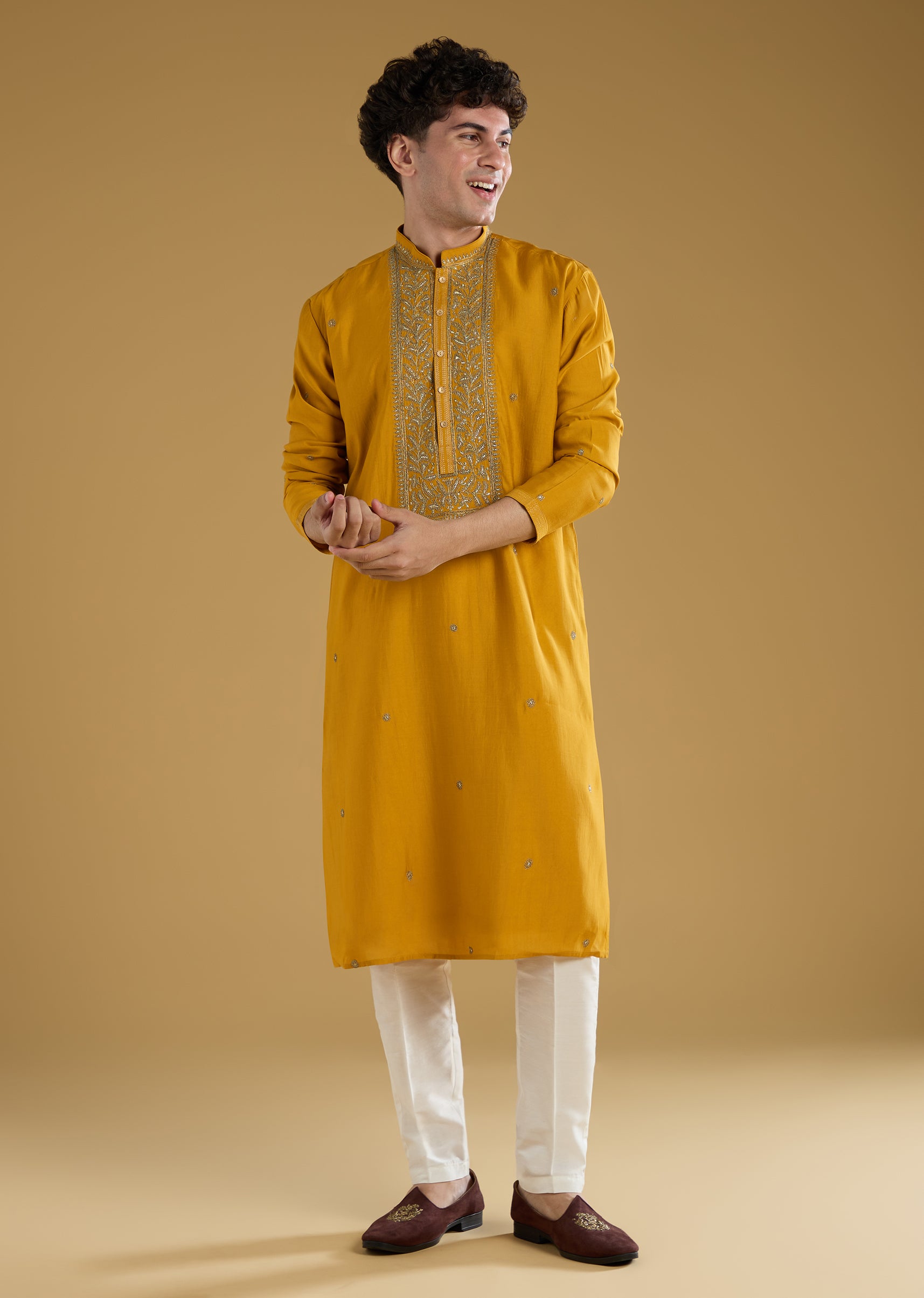 Mustard Yellow Silk Kurta Set With Thread Detail Work
