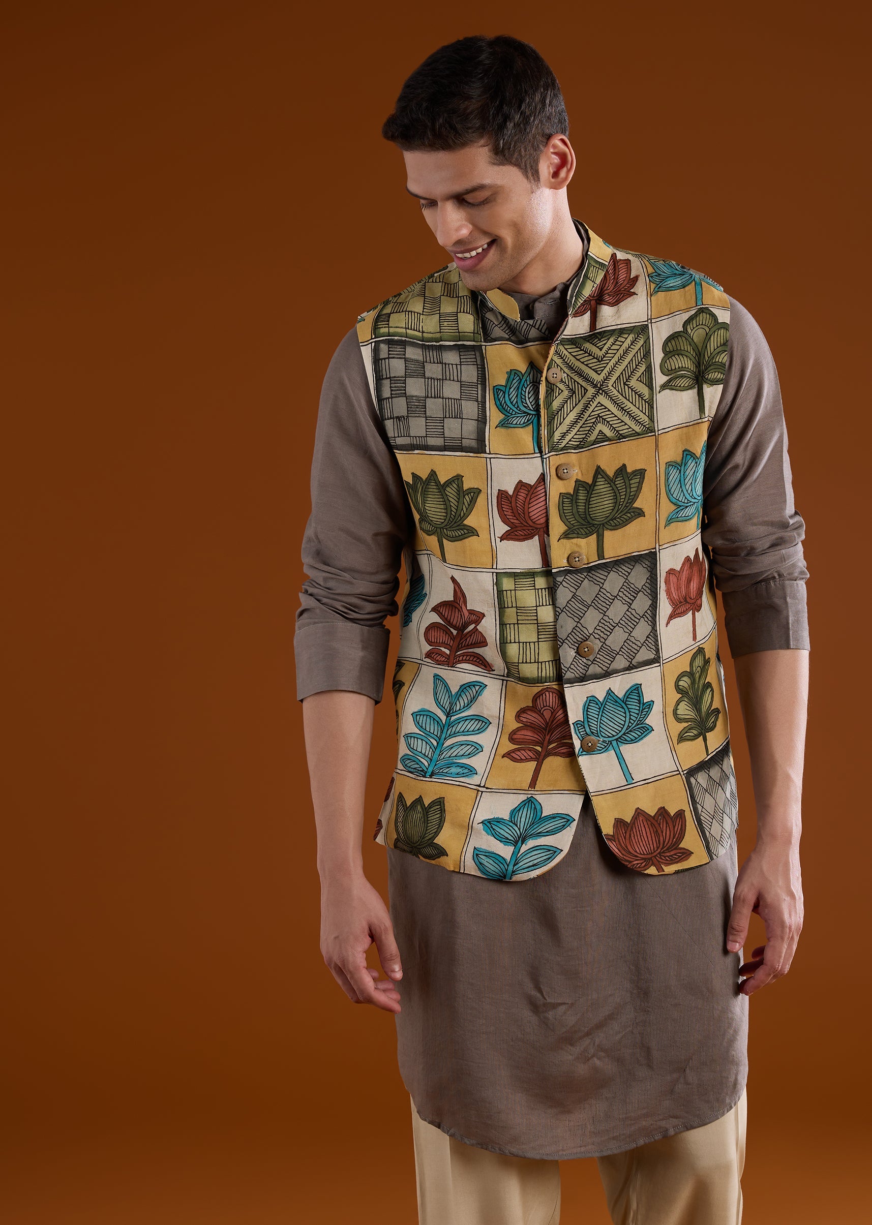 Mustard Yellow Silk Mens Kurta Jacket Set With Hand Painted Kalamkari