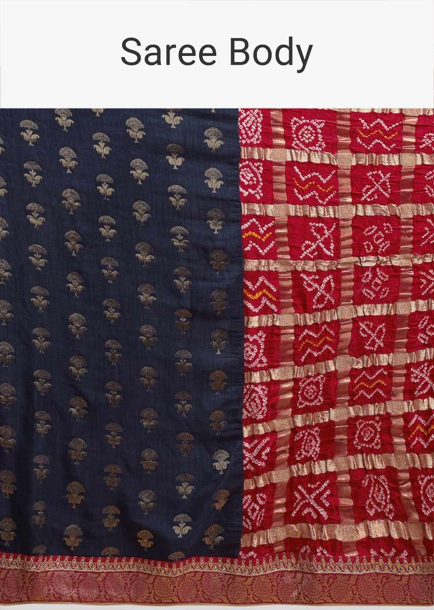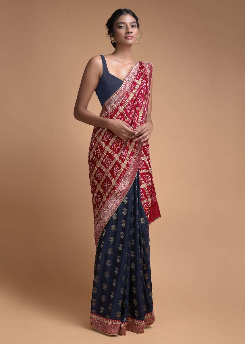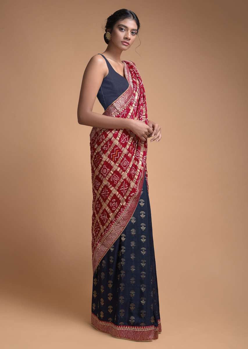 Navy Blue And Red Half And Half Saree In Silk With Bandhani Print And Weaved Floral Buttis Online - Kalki Fashion