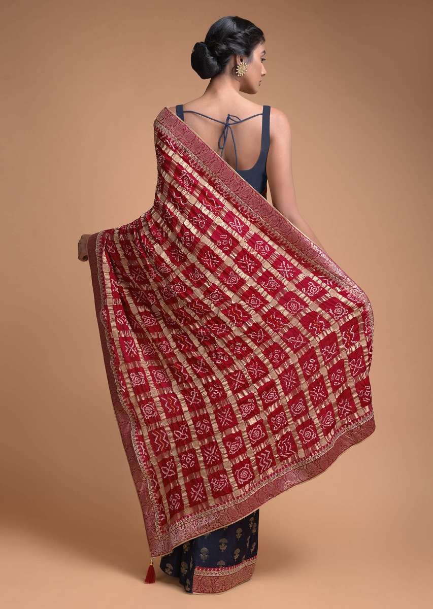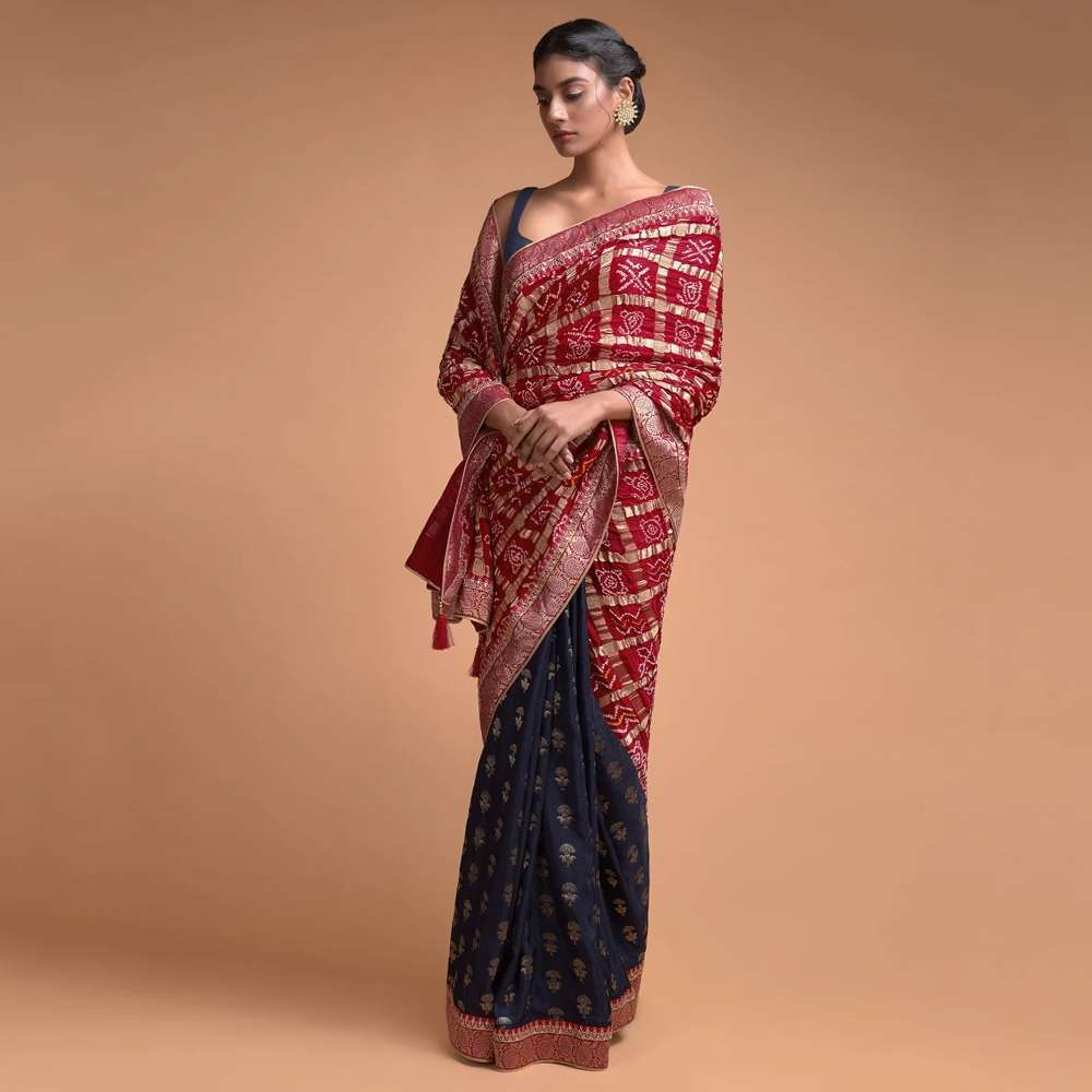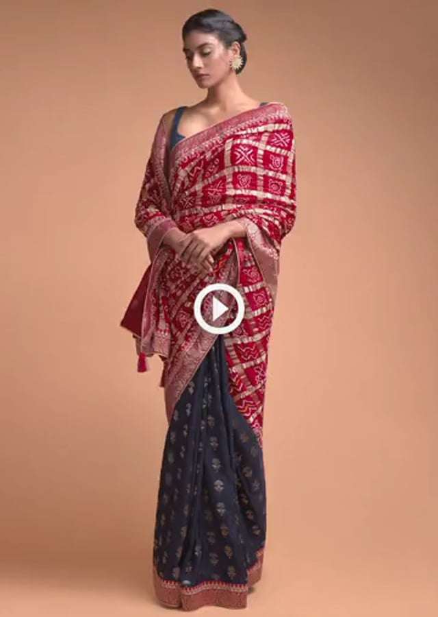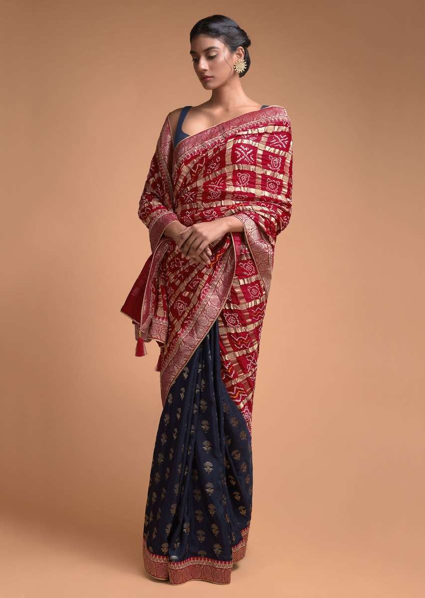 Navy Blue And Red Half And Half Saree In Silk With Bandhani Print And Weaved Floral Buttis Online - Kalki Fashion