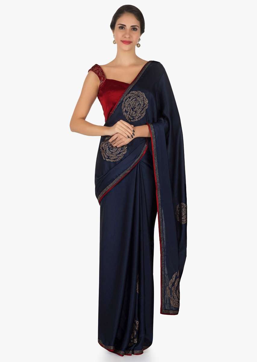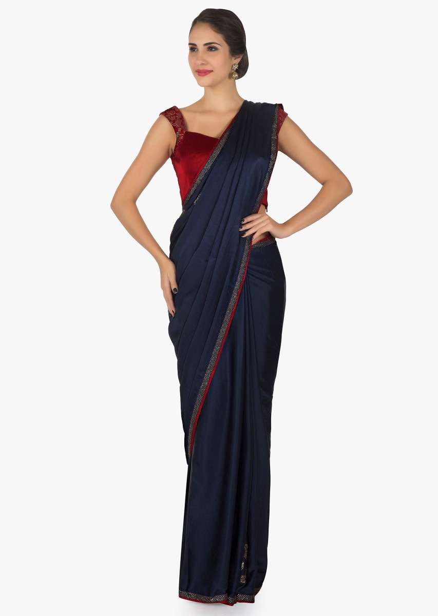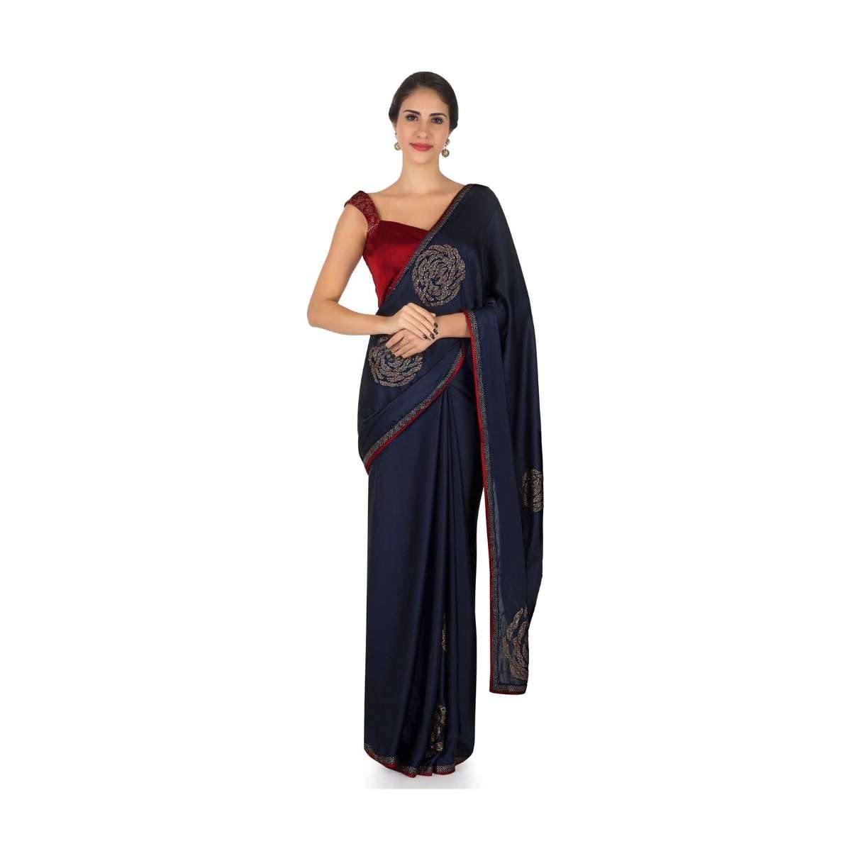 Navy blue and red saree in satin with unstitched blouse crafted in kundan embroidery work only on Kalki