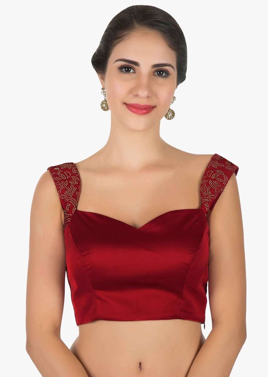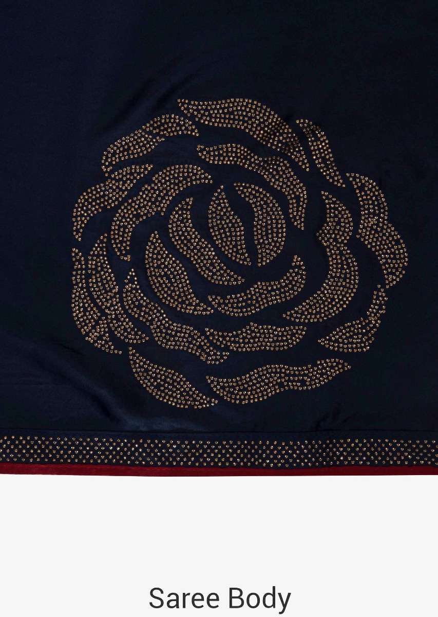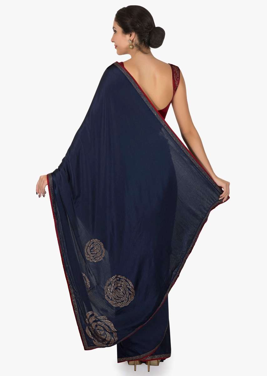 Navy blue and red saree in satin with unstitched blouse crafted in kundan embroidery work only on Kalki