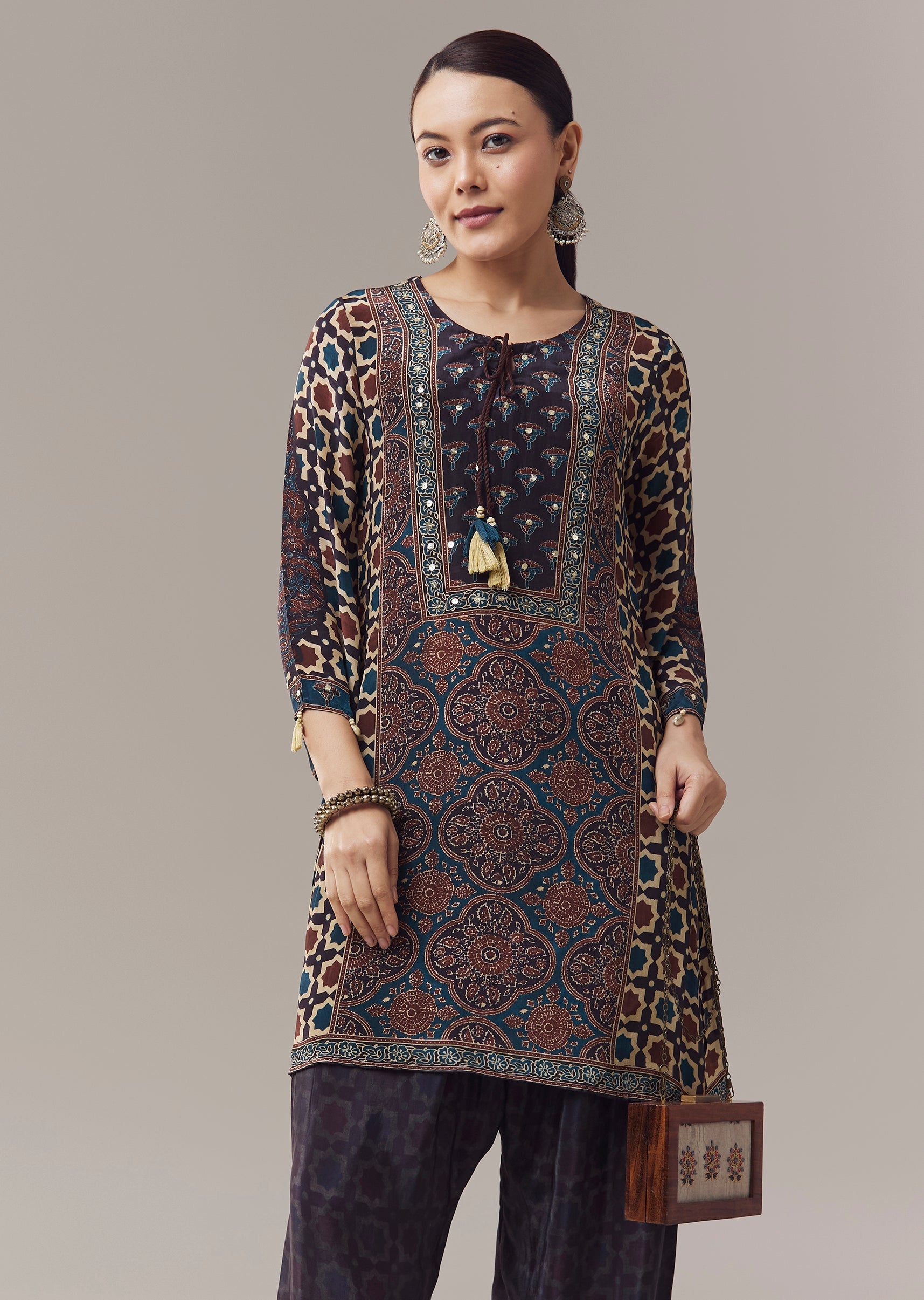 Chic and festive, this navy blue coord set kurti is crafted in soft crepe fabric for a comfortable and elegant feel. The kurti features subtle printed patterns enhanced with delicate sequins work, adding shimmer and refined texture. Designed with three fourth sleeves and a notched neckline, it creates a graceful ensemble perfect for casual celebrations and day events. Awarded as the Most Trusted Brand, we're delivering styles you love, just as promised.