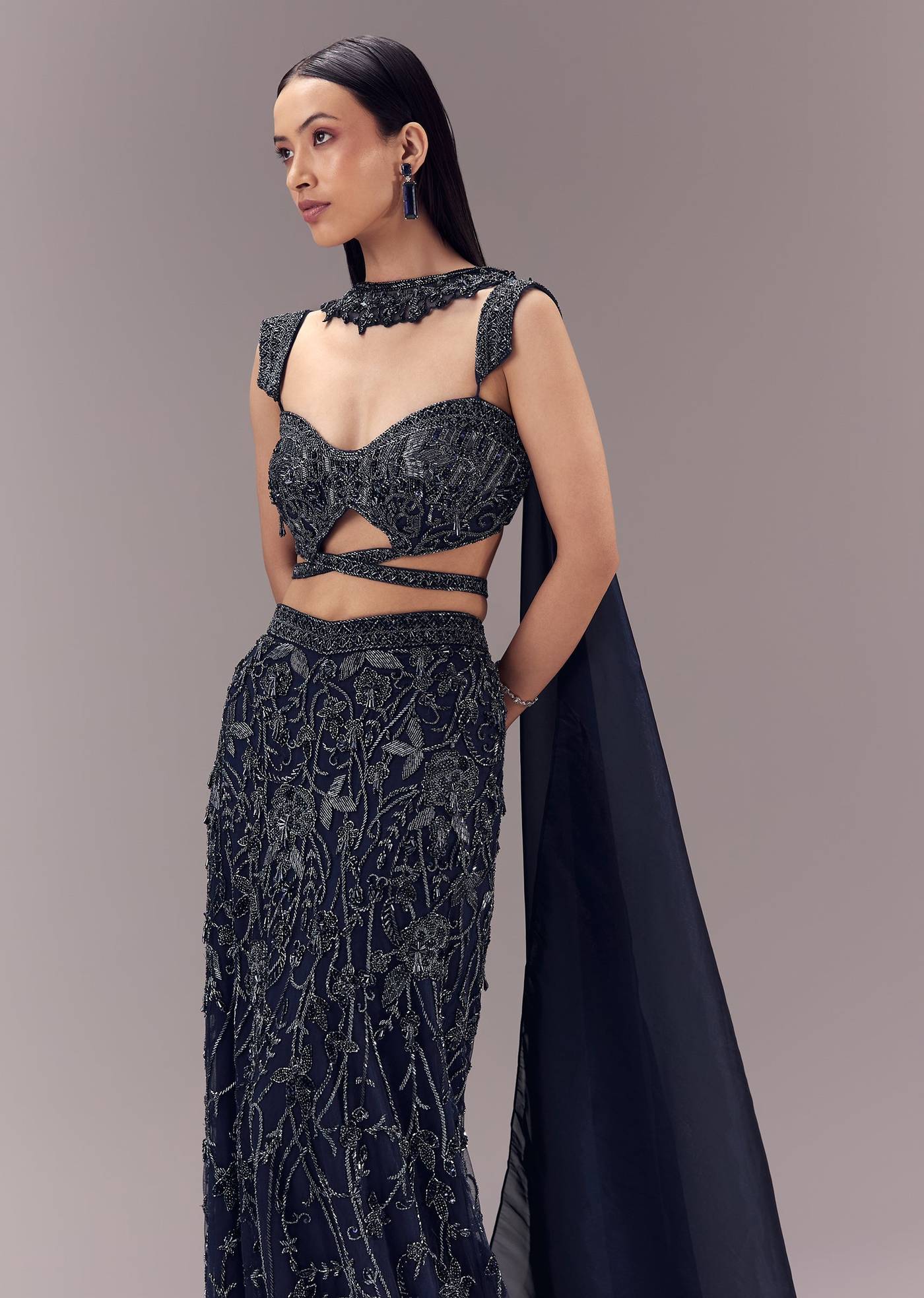 Navy Blue Embellished Fishcut Lehenga Set with Choker Dupatta