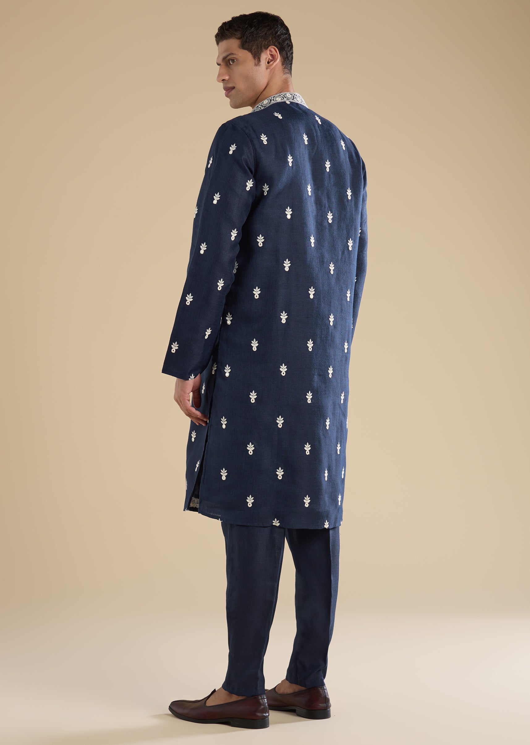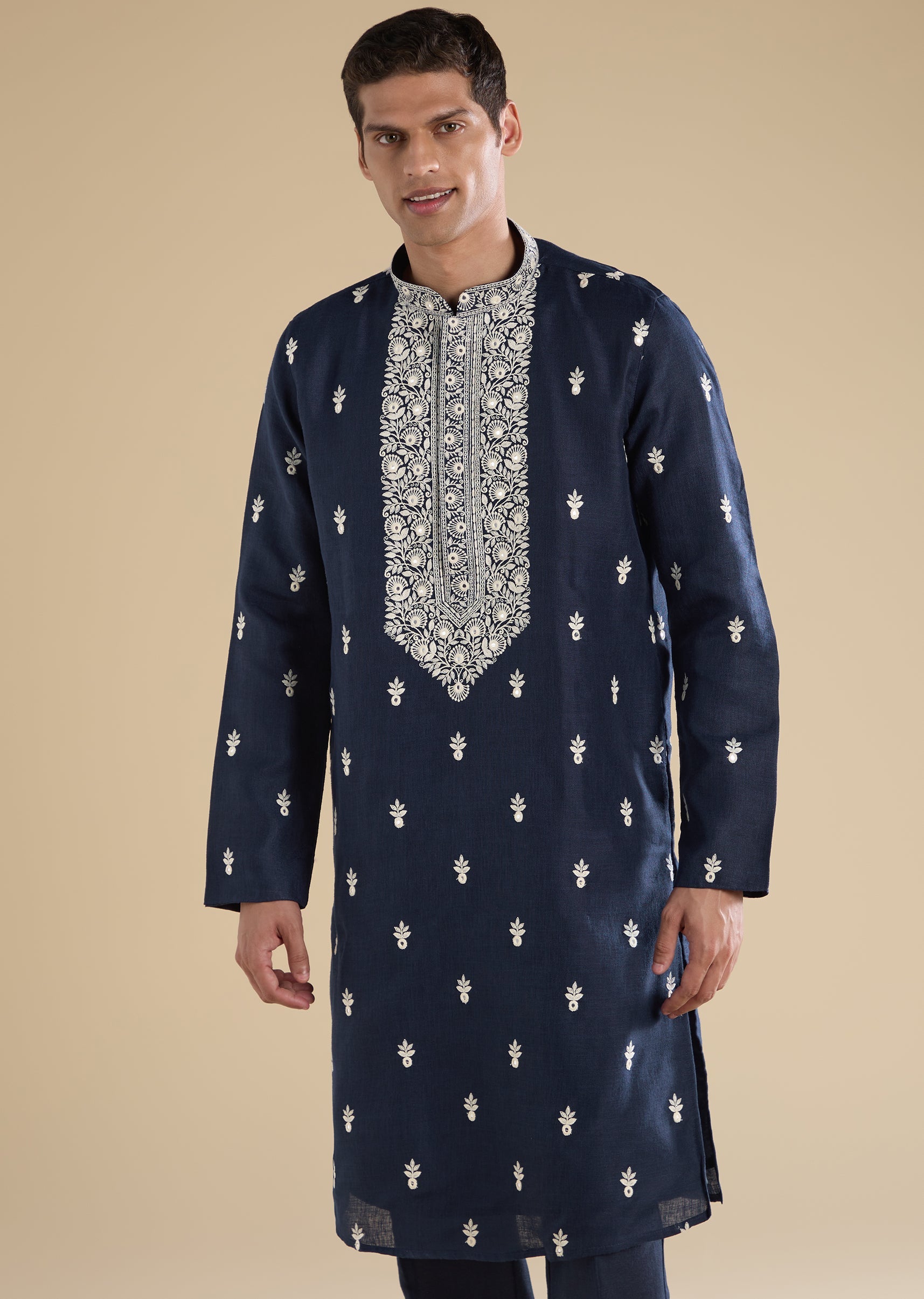 Classic and elegant, this navy blue kurta set is crafted for pooja and traditional occasions. Designed with a mandarin collar, full sleeves, and side slits, it features refined resham thread... More Product Details