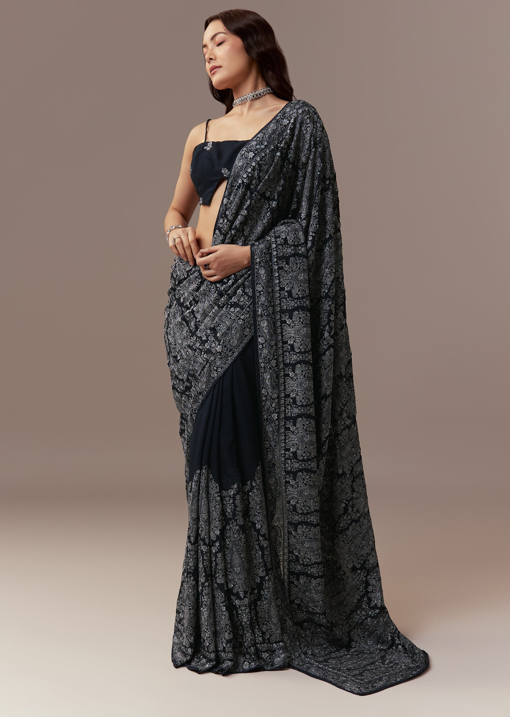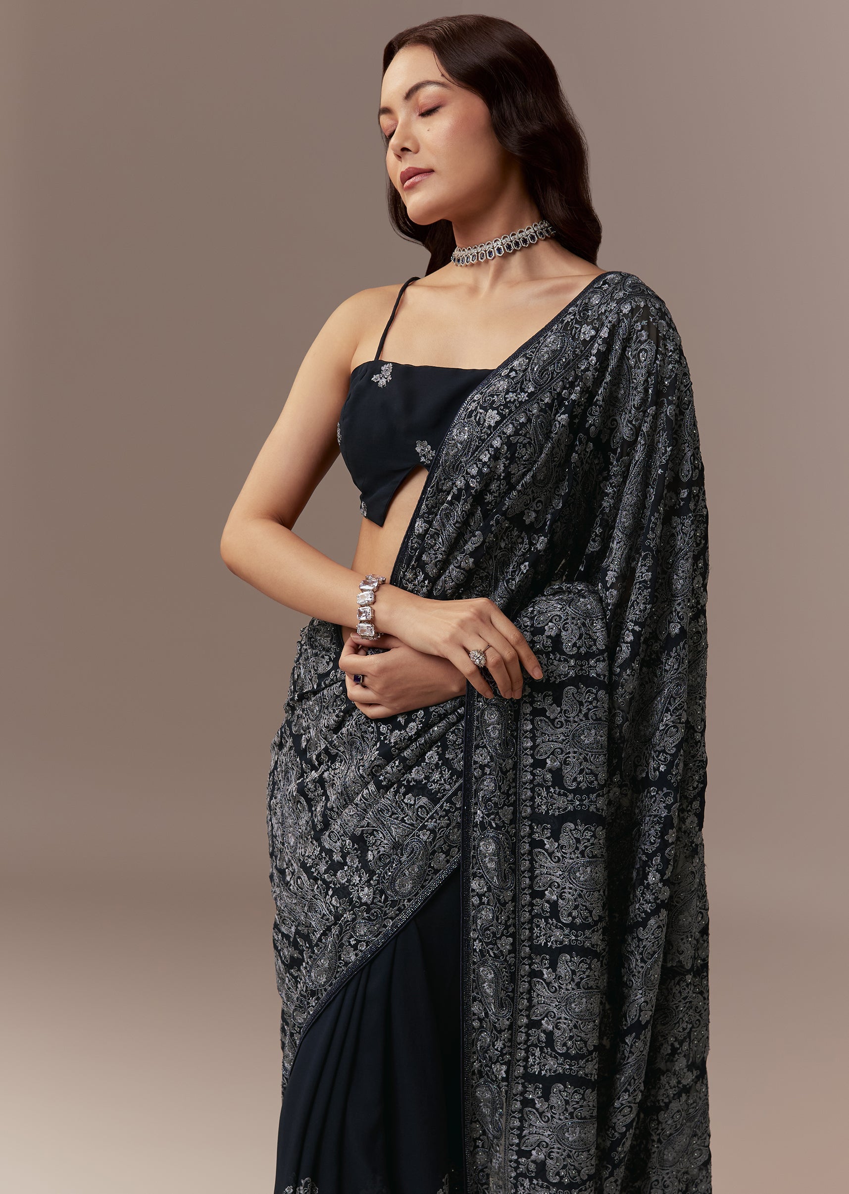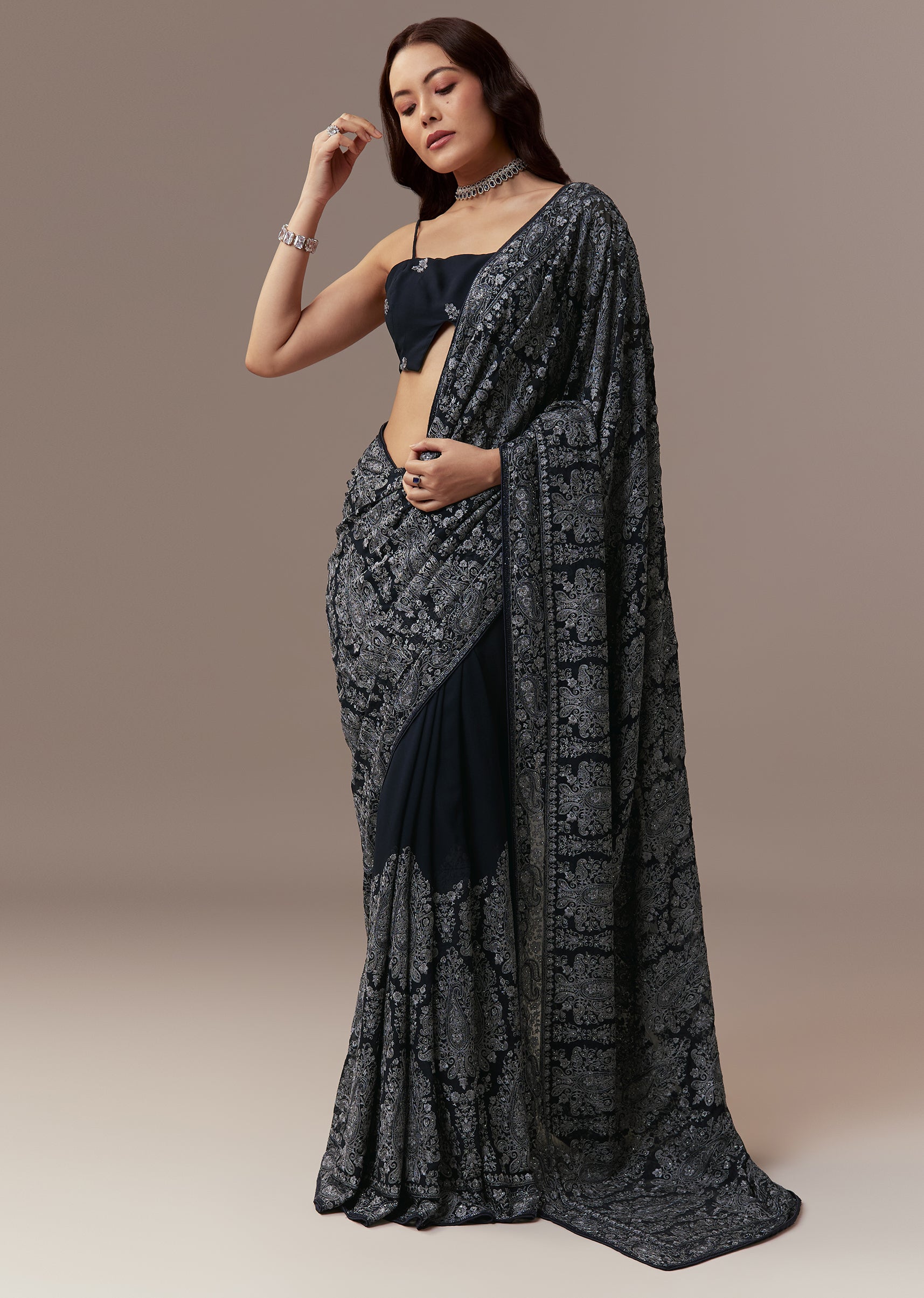 Bold elegant and festive this navy blue georgette saree is perfect for cocktail and sangeet celebrations as a bridesmaid or wedding guest. The saree features heavy kashmiri Kashida embroidery all... More Product Details