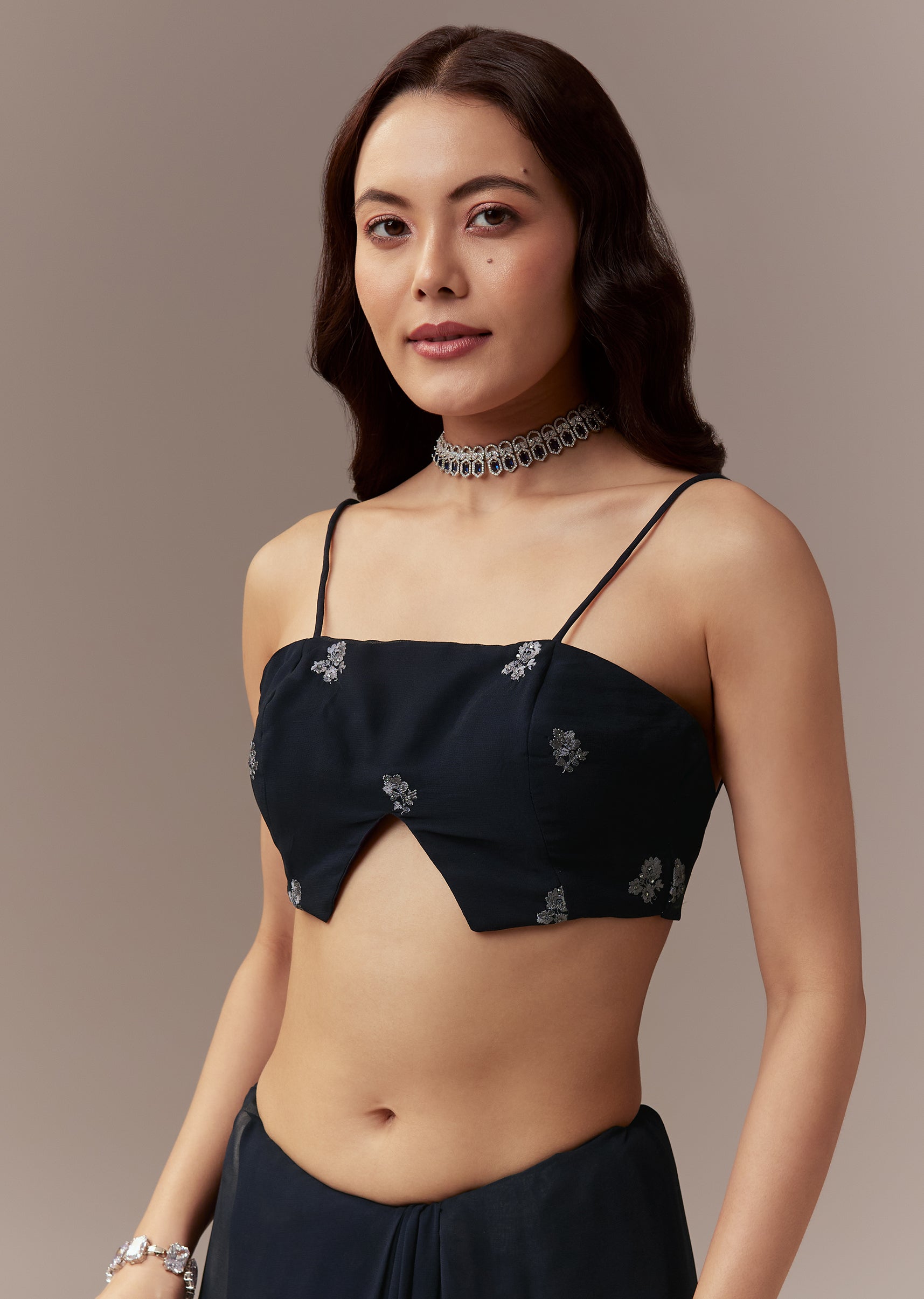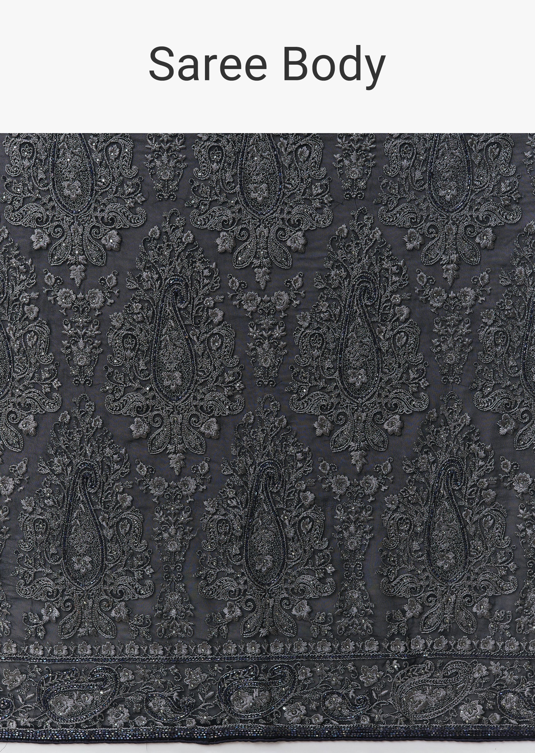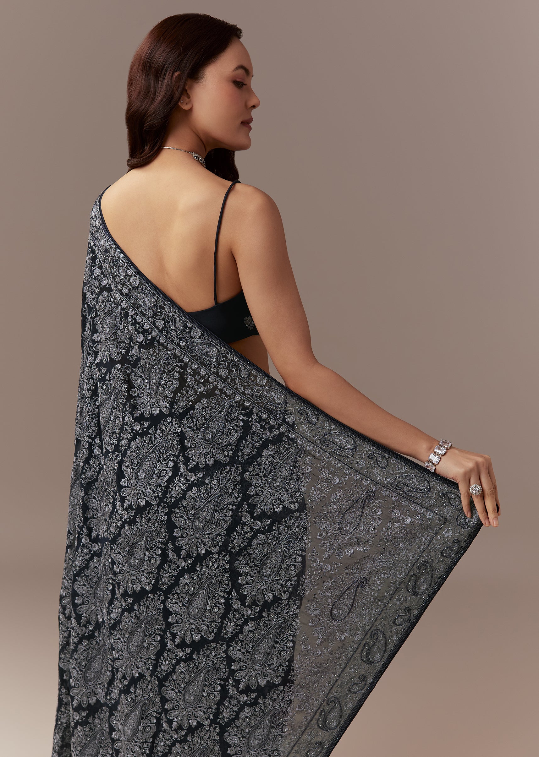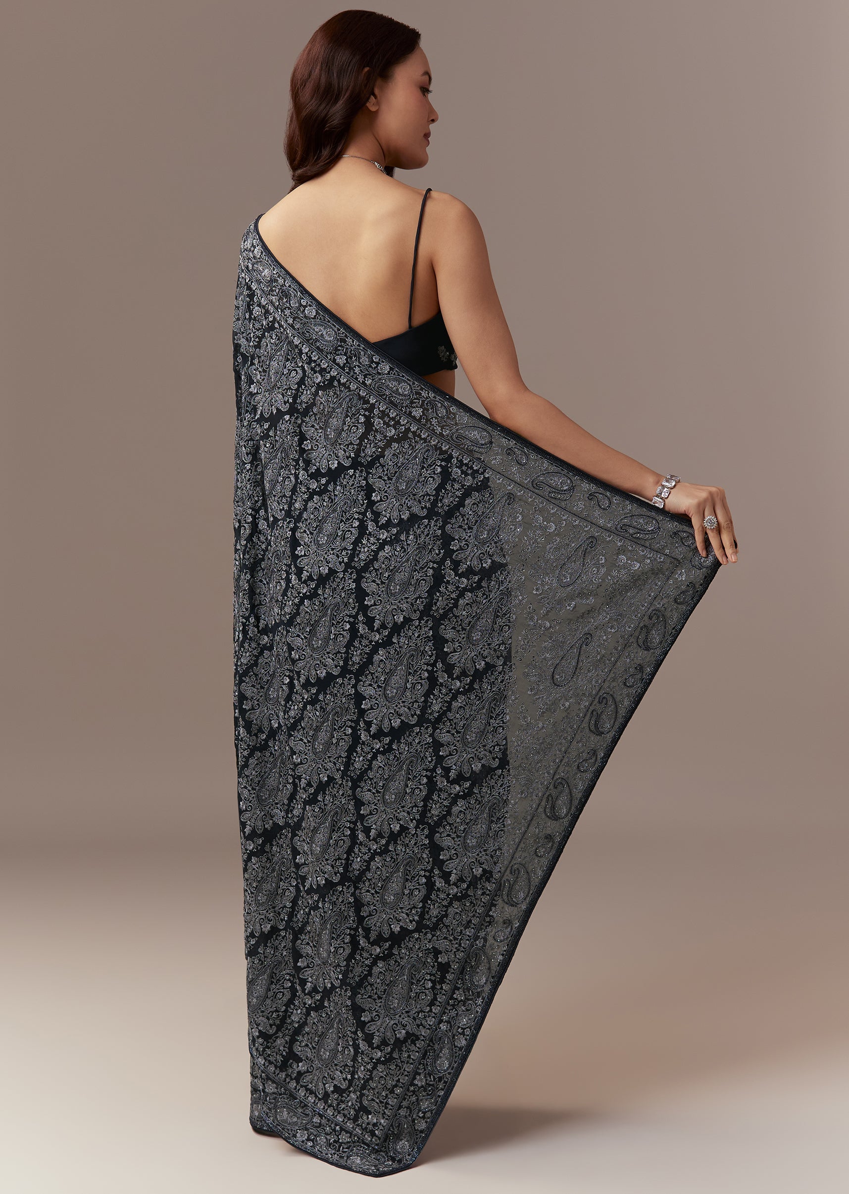 Bold elegant and festive this navy blue georgette saree is perfect for cocktail and sangeet celebrations as a bridesmaid or wedding guest. The saree features heavy kashmiri Kashida embroidery all... More Product Details