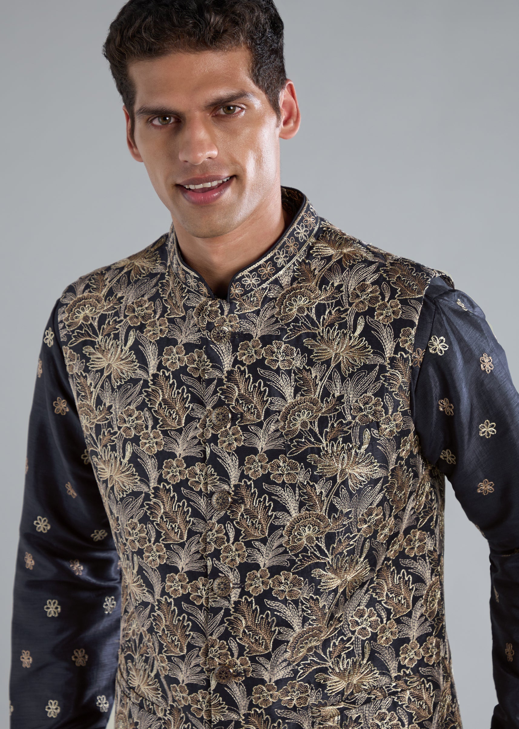 Refined and regal, this navy blue kurta jacket set showcases intricate thread and sequin embroidery that elevates the ensemble with subtle shimmer. Tailored in silk for a rich, smooth finish,... More Product Details