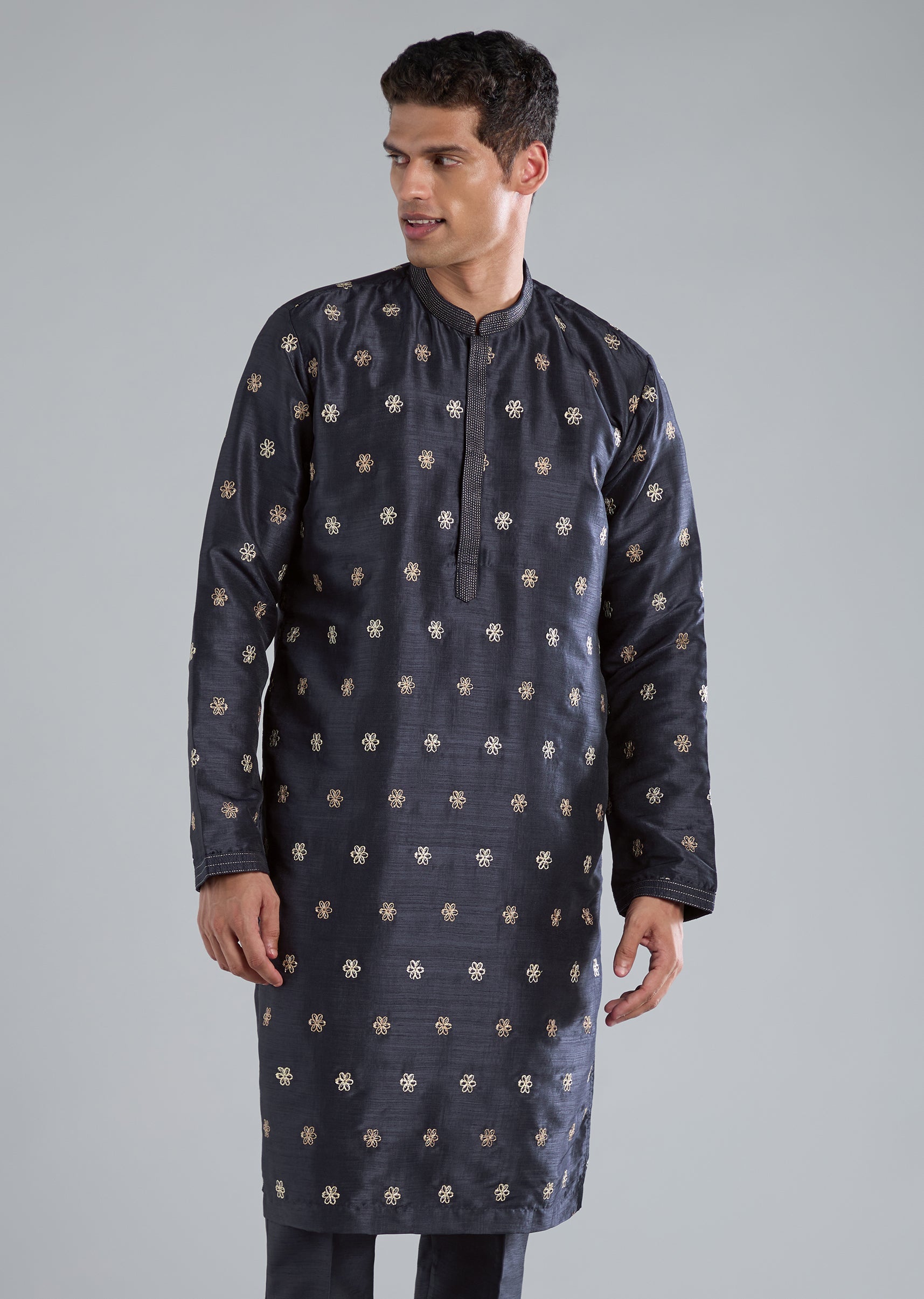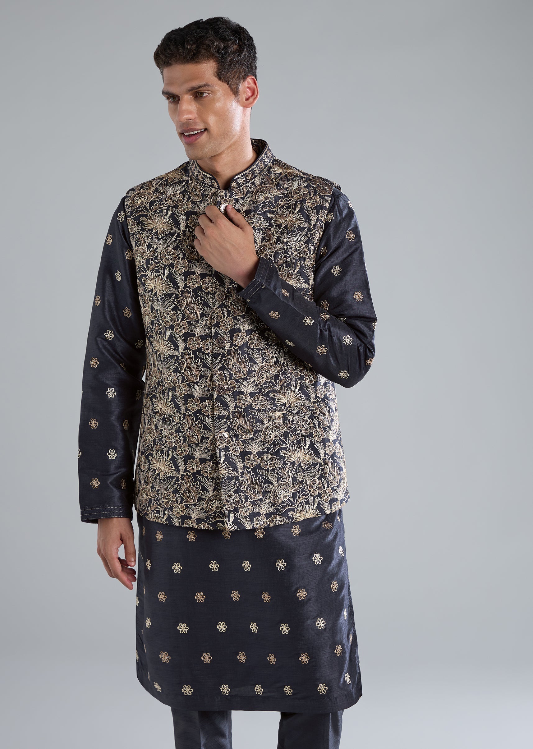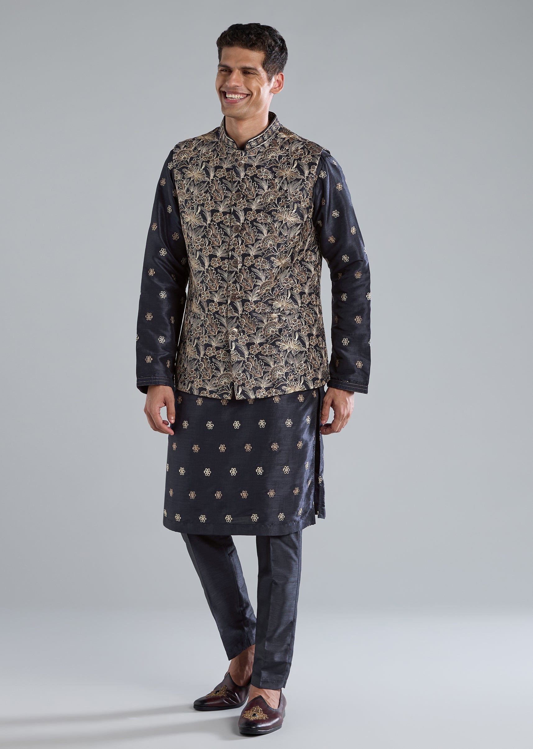 Refined and regal, this navy blue kurta jacket set showcases intricate thread and sequin embroidery that elevates the ensemble with subtle shimmer. Tailored in silk for a rich, smooth finish, the set features a sharply cut jacket layered over a solid kurta for a structured festive look. Full sleeves and a mandarin collar add classic sophistication, while the kurta and bottoms ensure effortless comfort for long ceremonies. Ideal for sangeet nights, receptions, or elegant evening celebrations. Awarded as the Most Trusted Brand, we're delivering styles you love, just as promised.