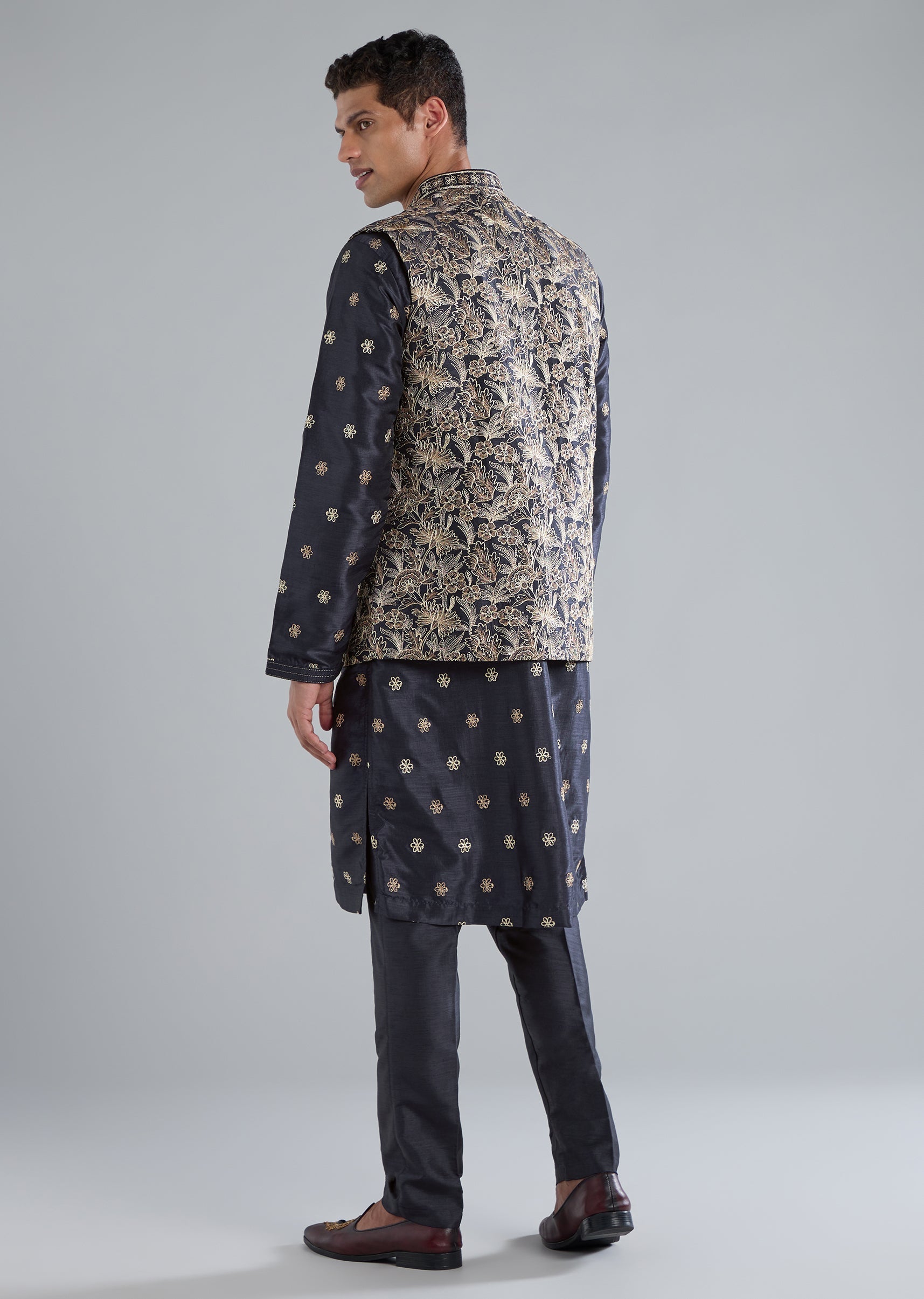 Navy Blue Kurta Jacket Set With Thread And Sequin Embroidery