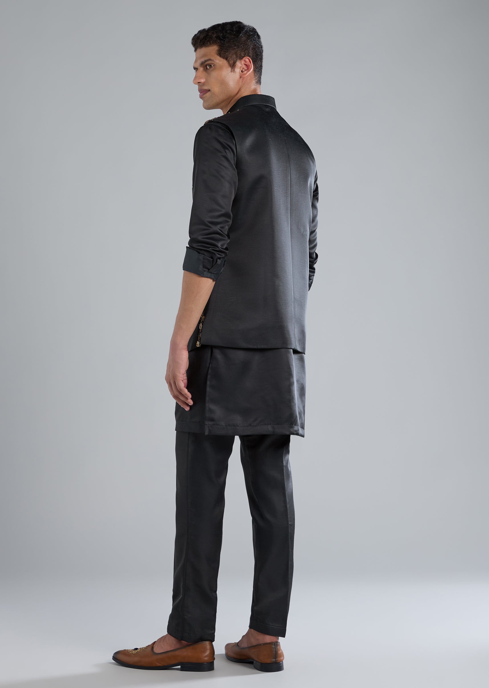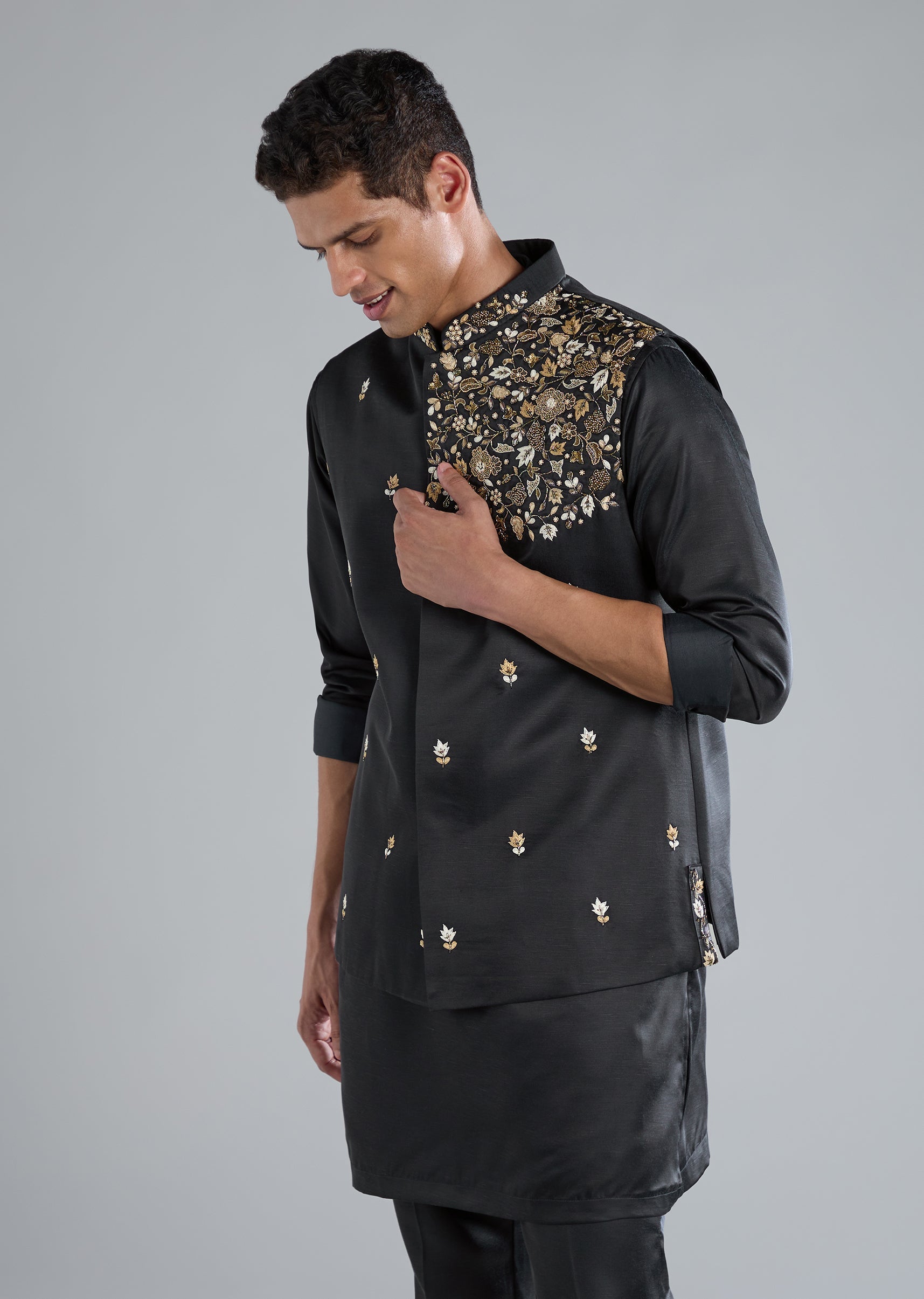 Rich and refined, this navy blue kurta jacket set blends linen as the primary fabric with satin as the secondary base for a smooth and elevated finish. The ensemble is... More Product Details