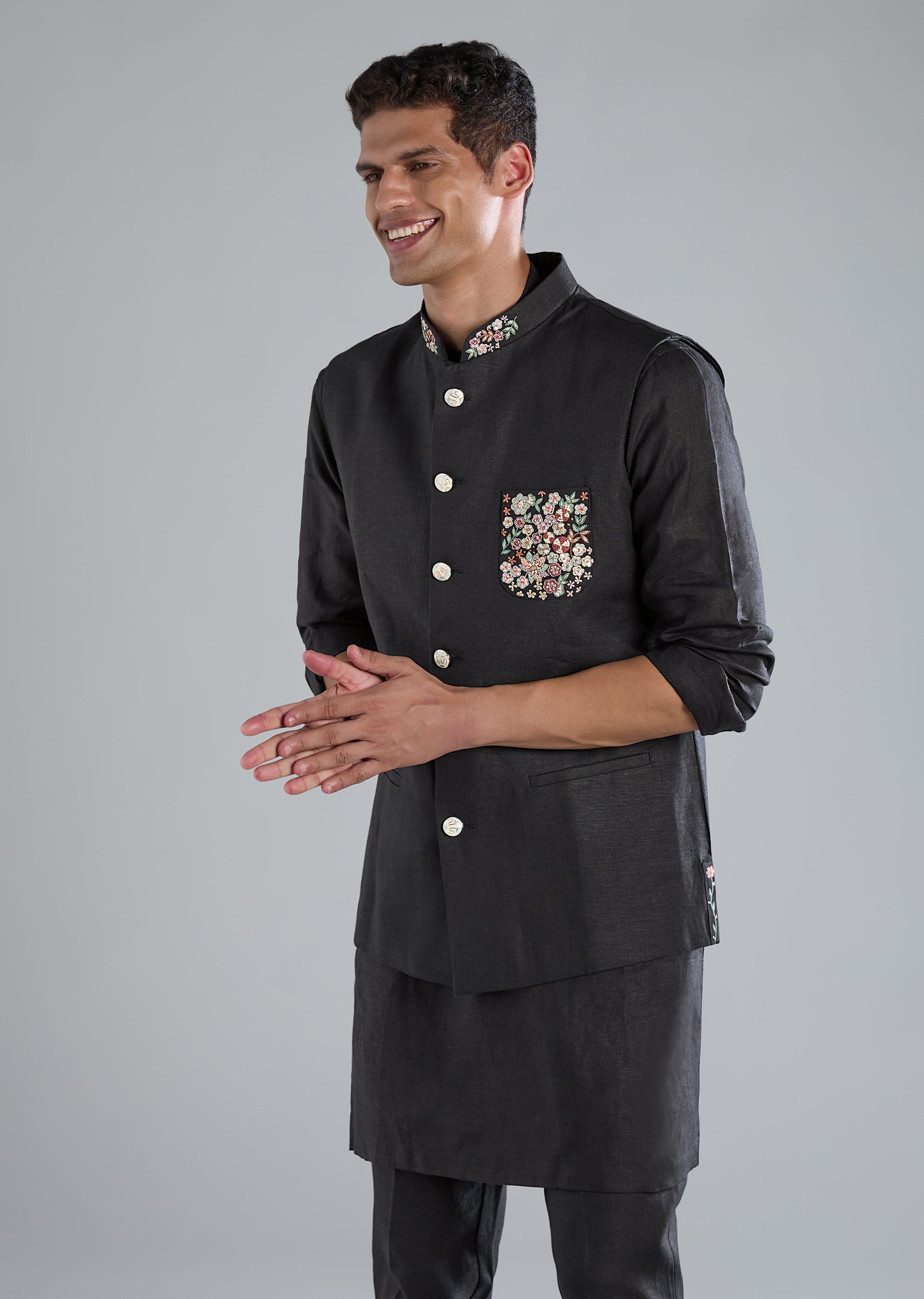 This navy blue kurta jacket set is crafted in breathable linen and highlighted with intricate thread resham work, making it perfect for mehendi and festive celebrations. It features full sleeves, a mandarin collar, a front button top closure, and a secure front hook eye bottom closure. The set includes a jacket, kurta, and pants, designed for a clean and elegant traditional look. Awarded as the Most Trusted Brand, we're delivering styles you love, just as promised.