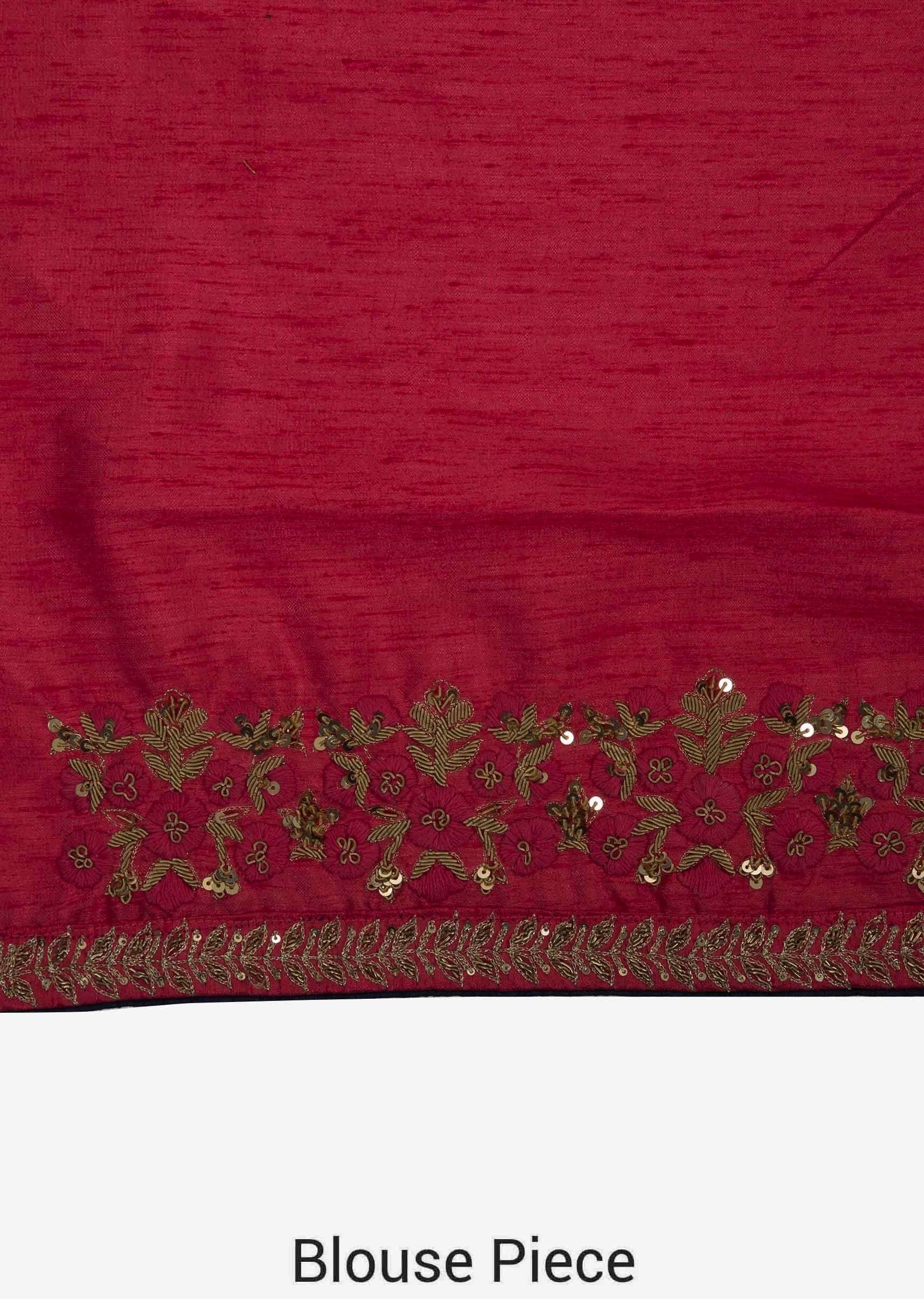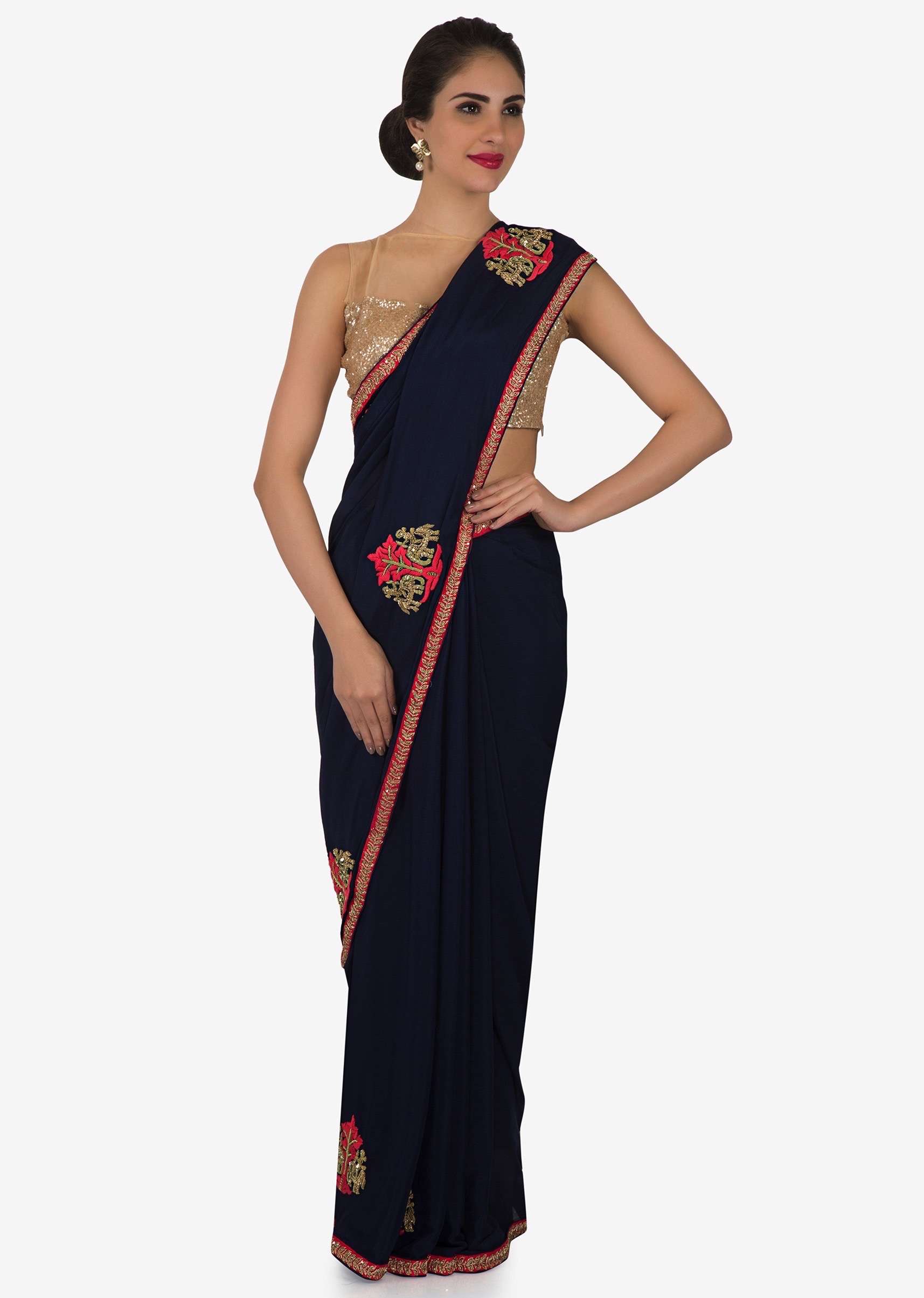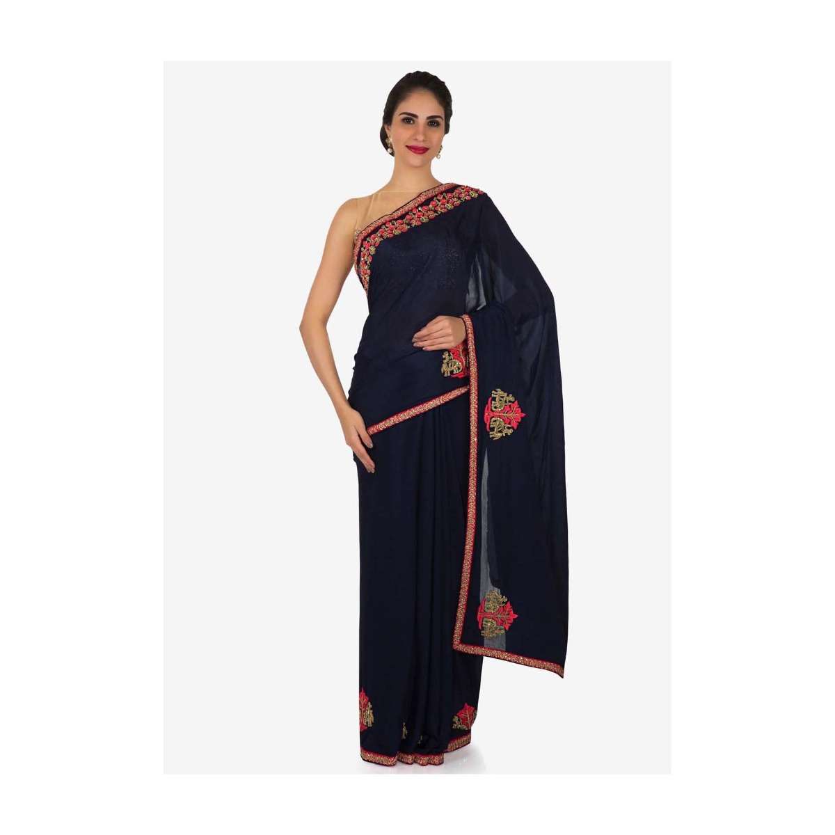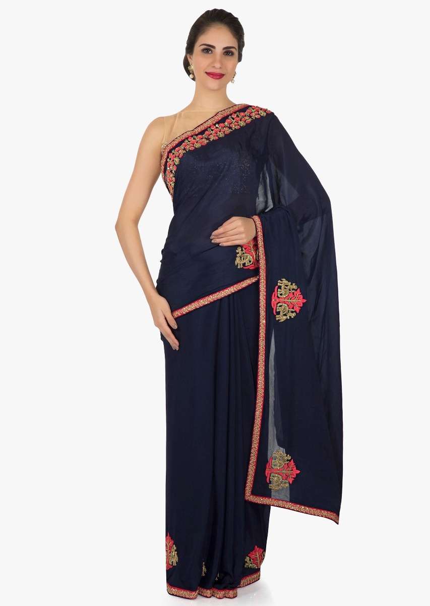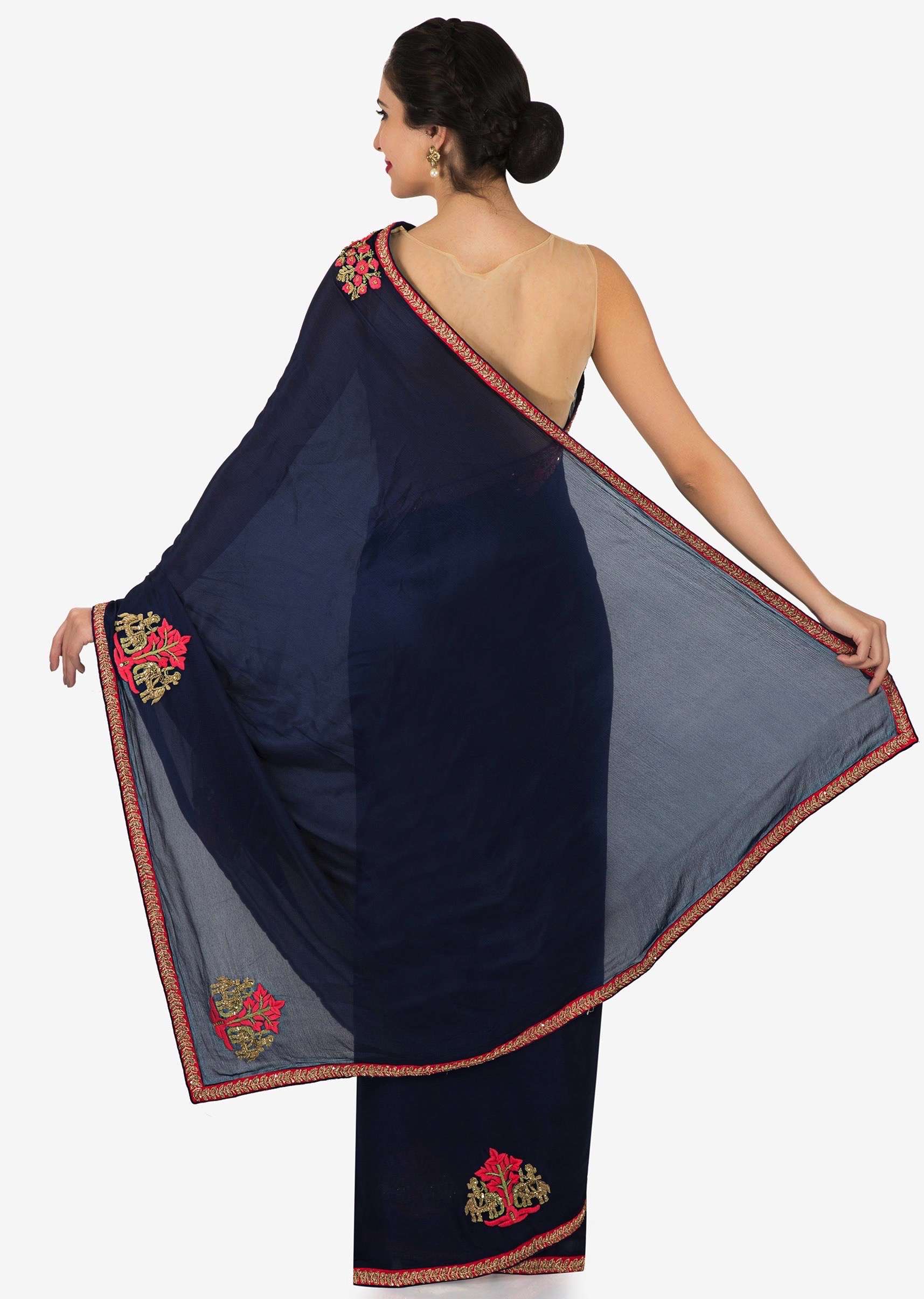 Navy Blue Saree In Chiffon With Unstitched Blouse Embellished In Resham And Zardosi Work Online - Kalki Fashion