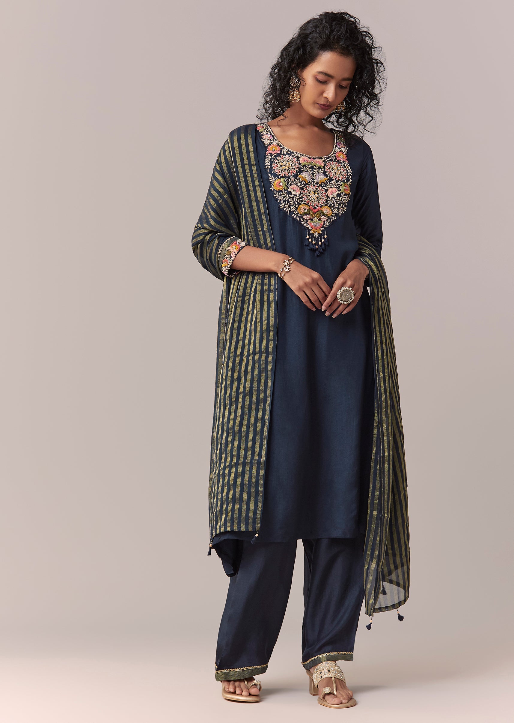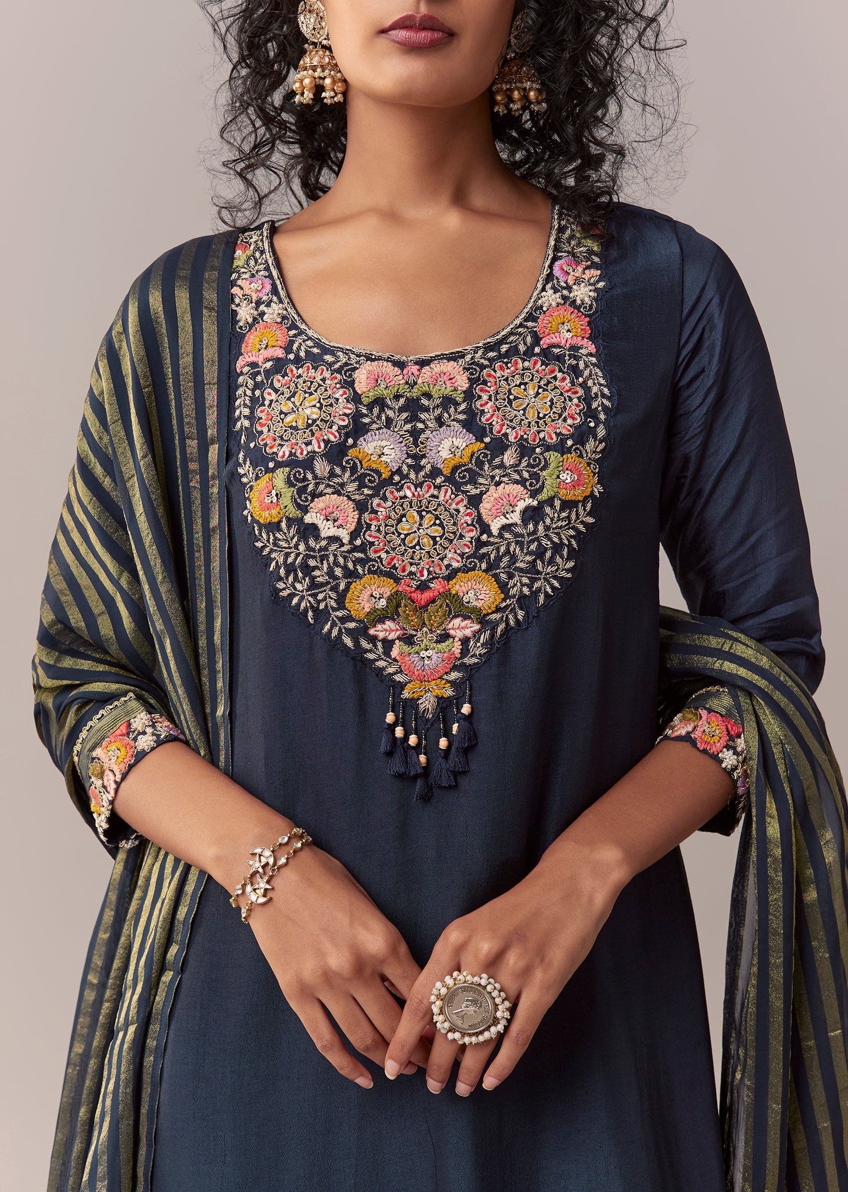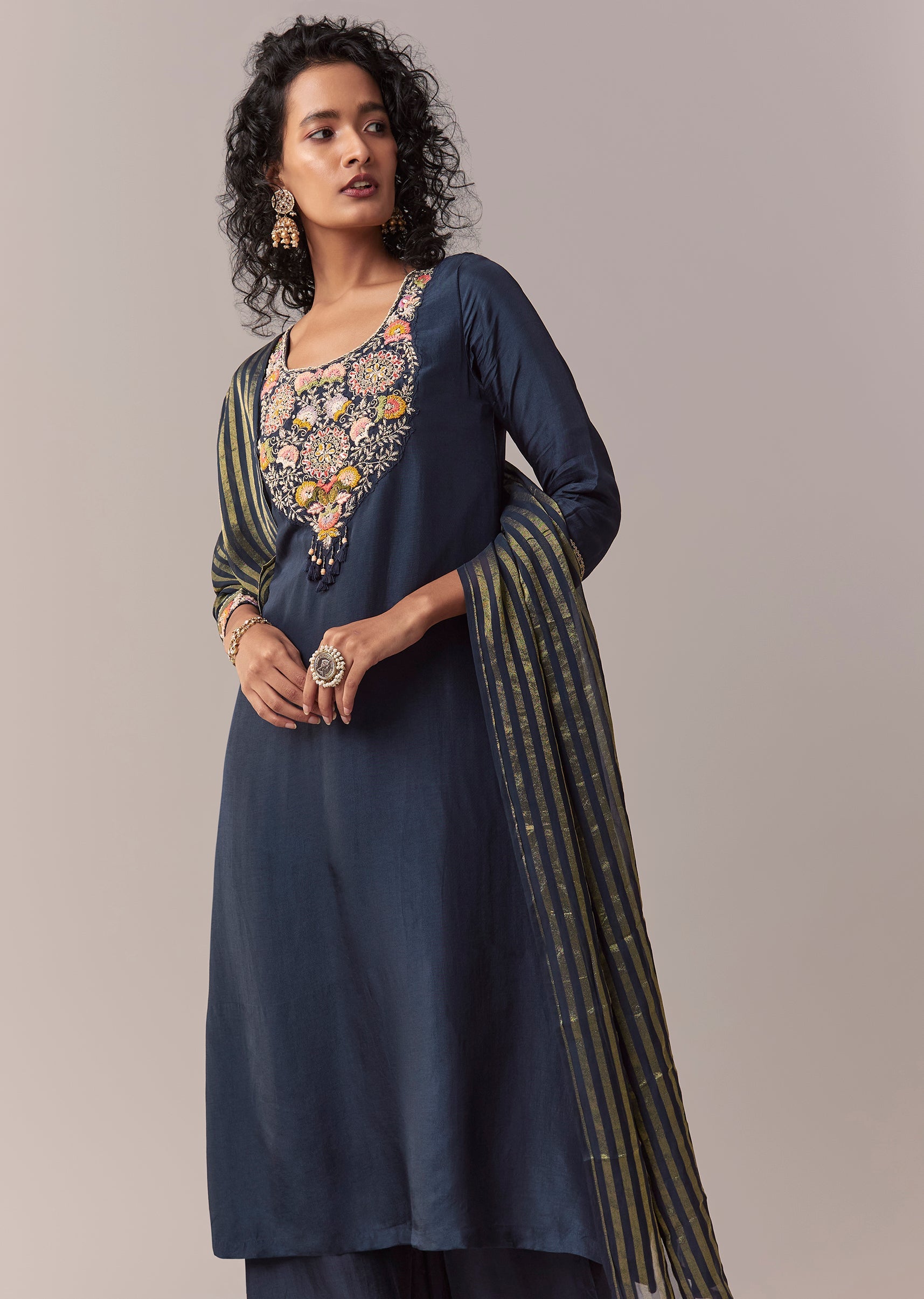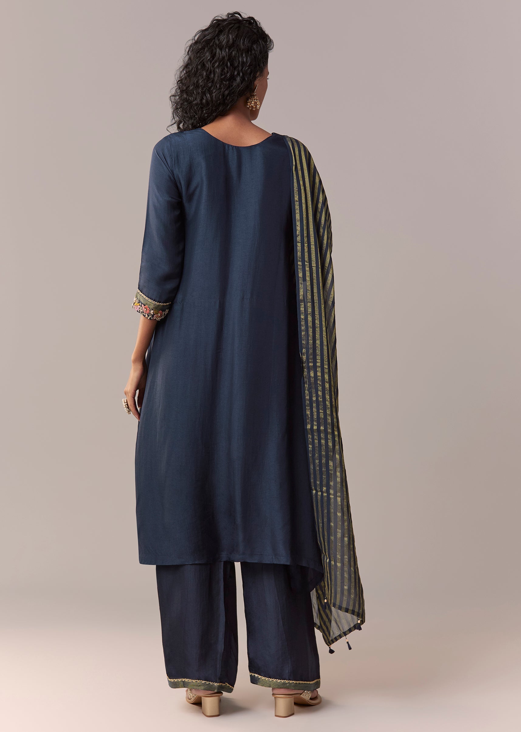Navy Blue Zardosi & Thread Palazzo Set With Dupatta