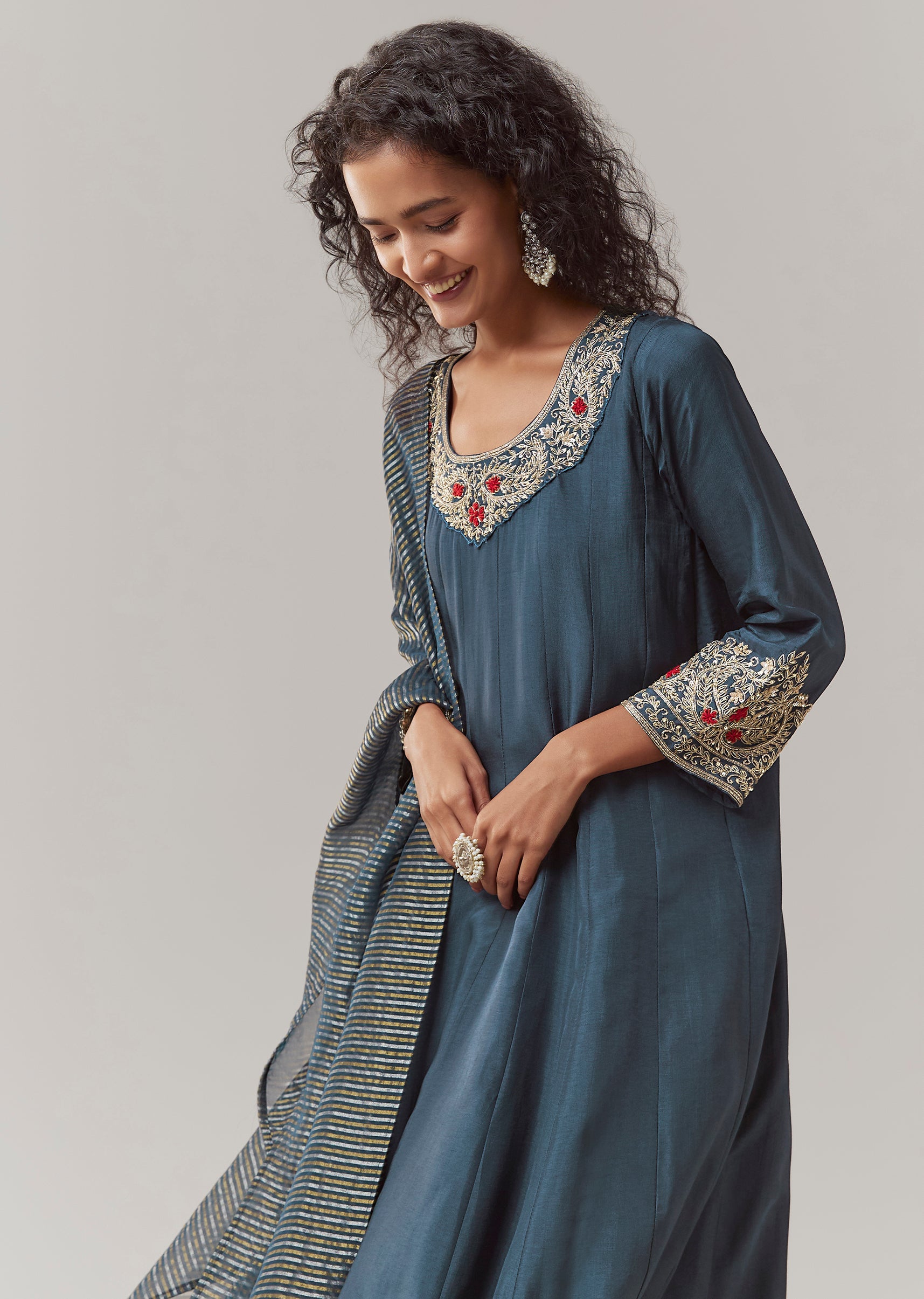Understated yet luxurious, this silk anarkali is adorned with fine zari and cut dana work that lends a soft festive glow. The round neckline and full sleeves create a classic,... More Product Details