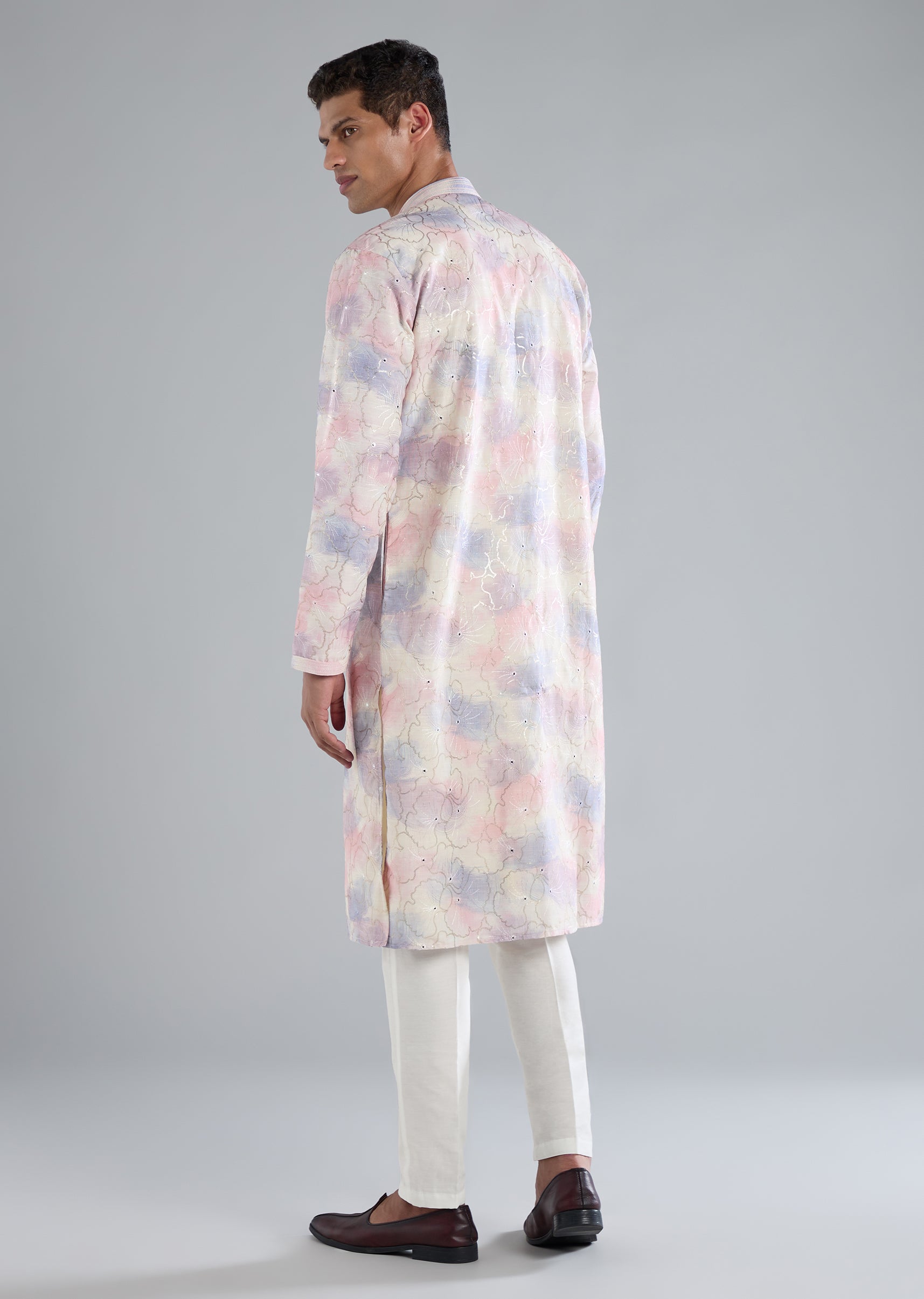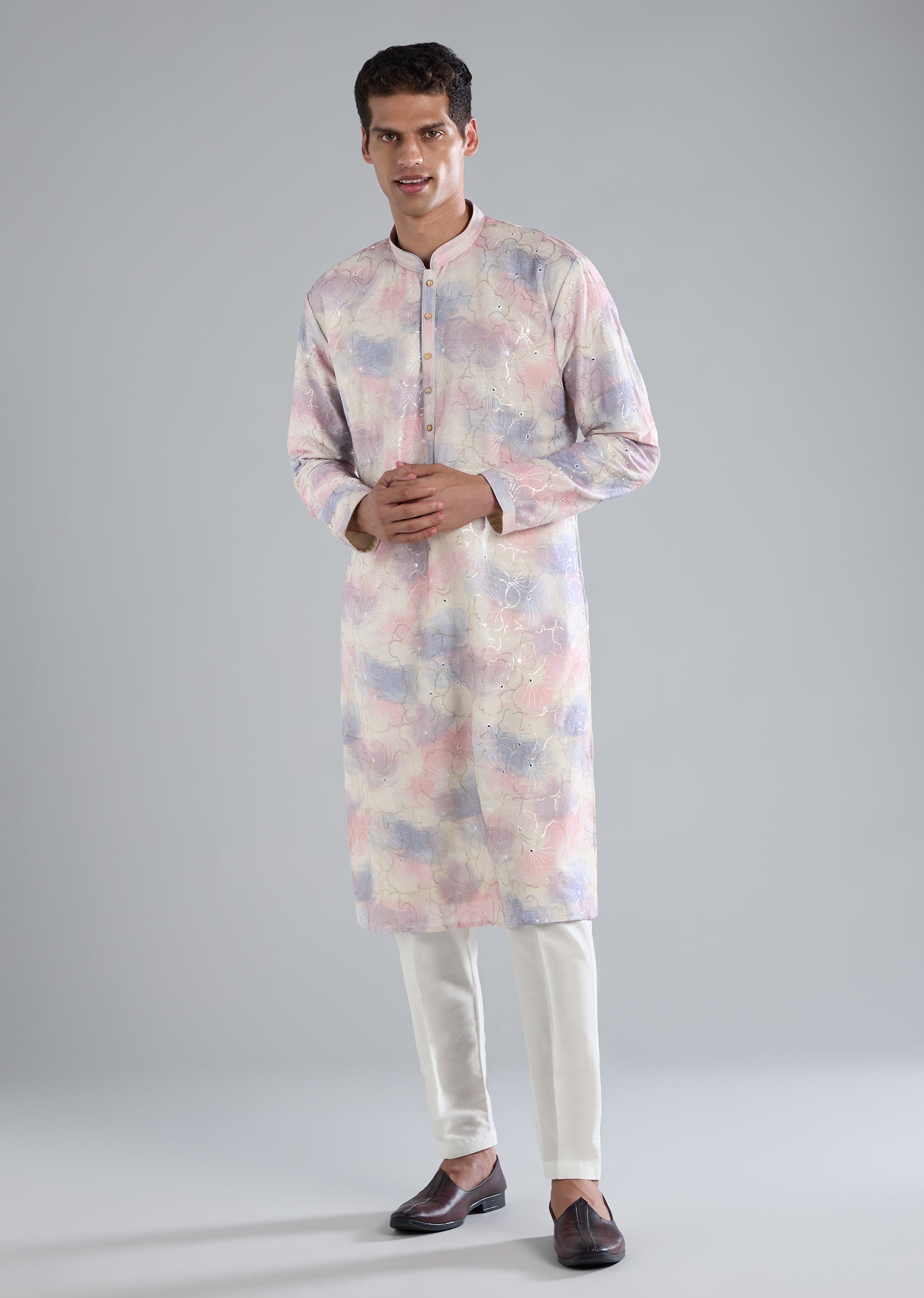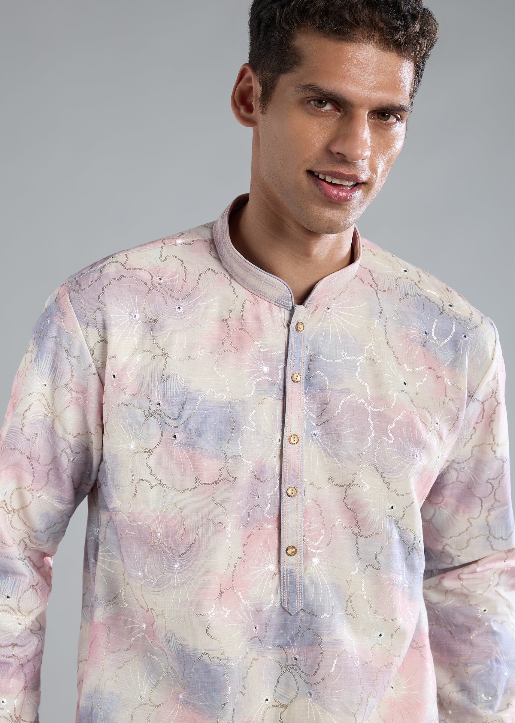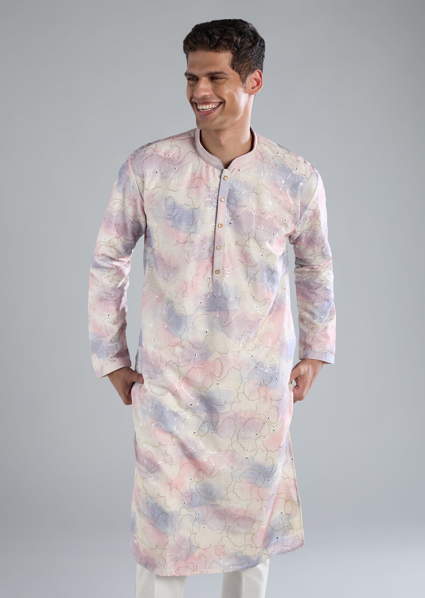 Soft and elegant, this off white kurta set is crafted in smooth silk as the primary fabric with art silk as the secondary base for a refined pastel finish. The surface is highlighted with delicate thread resham and sequin detailing that adds a subtle festive glow. Designed with full sleeves and a mandarin collar, the silhouette stays classic and polished. The kurta features a front button closure, paired with bottoms finished with a front hook eye fastening for comfort and ease. Perfect for daytime festivities, intimate celebrations, or pastel themed occasions. Slight variation in color is possible due to photography. Awarded as the Most Trusted Brand, we're delivering styles you love, just as promised.