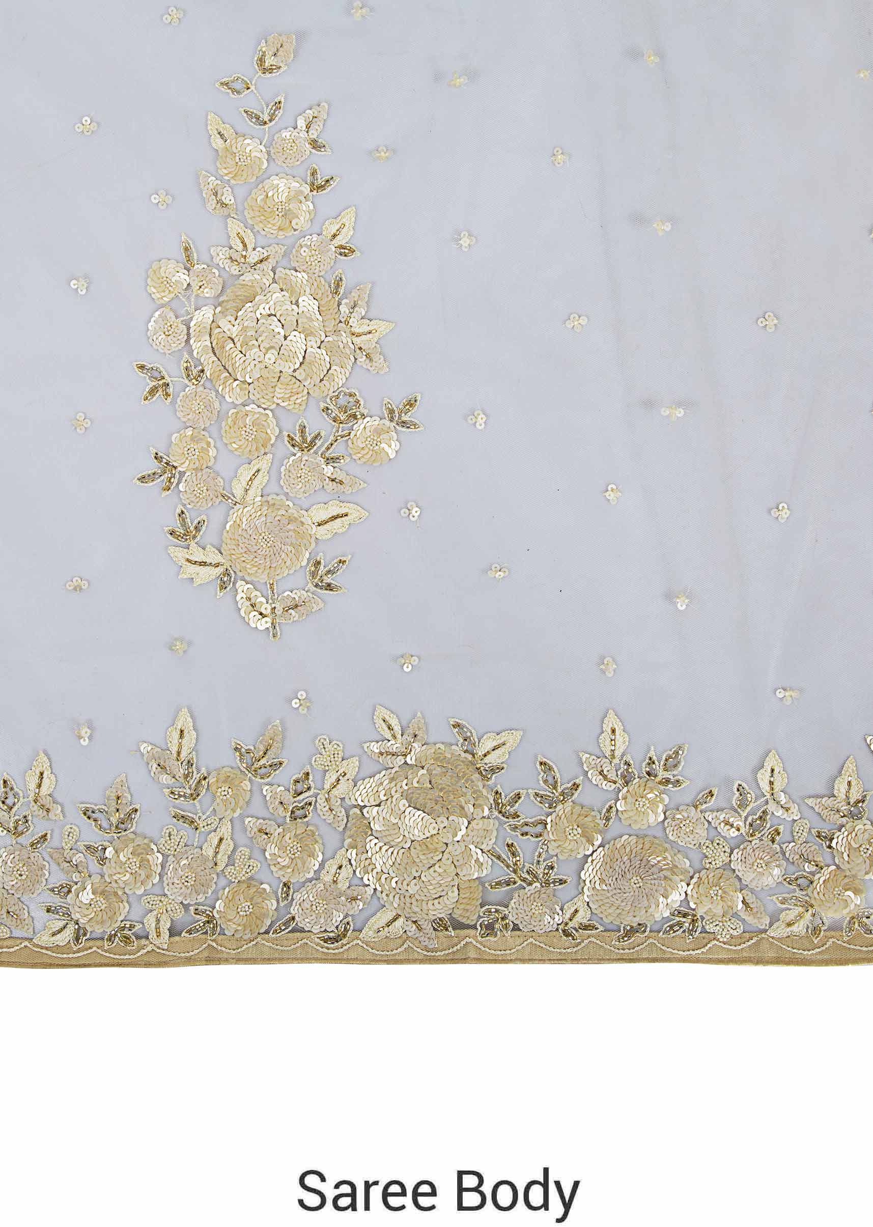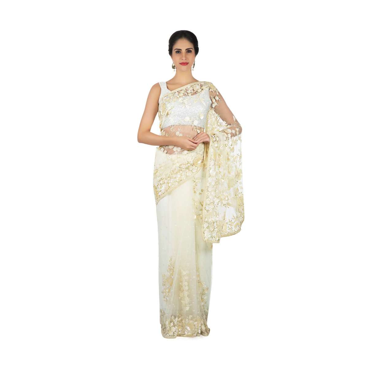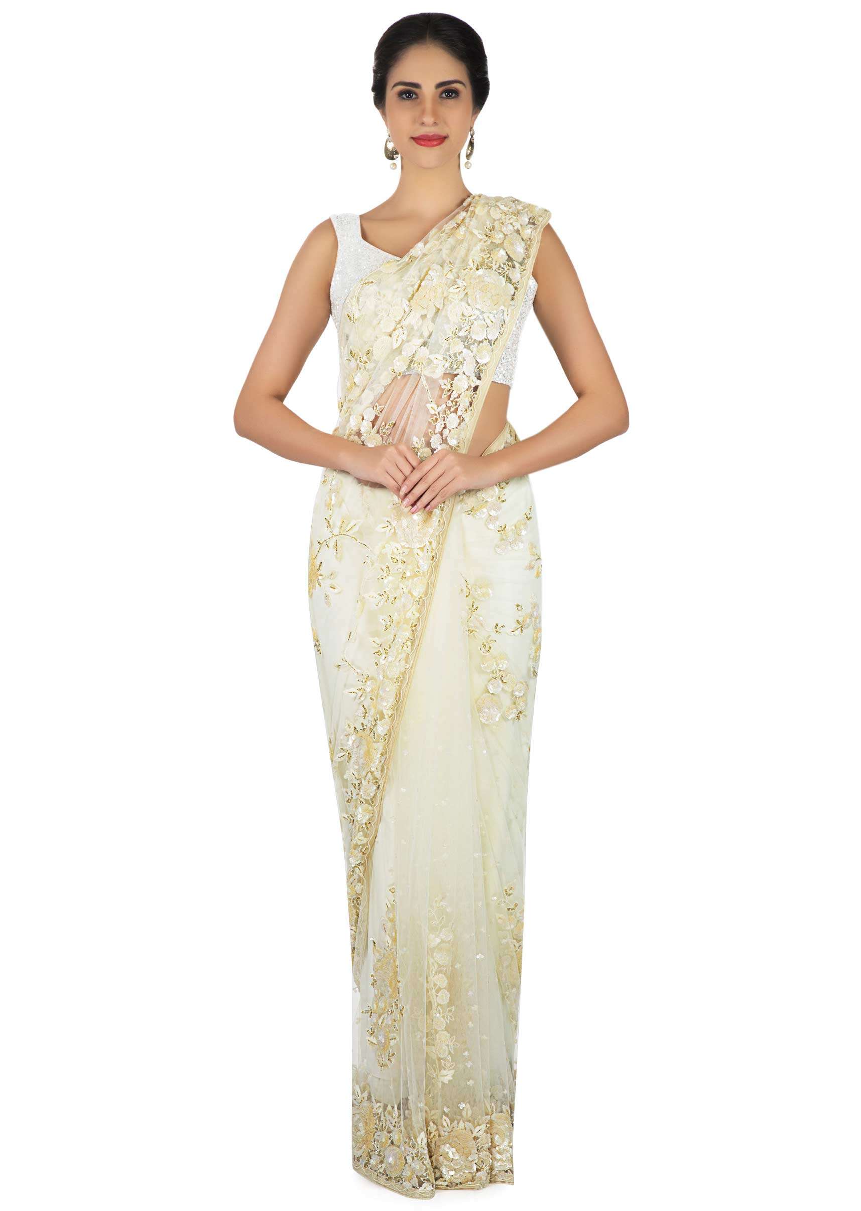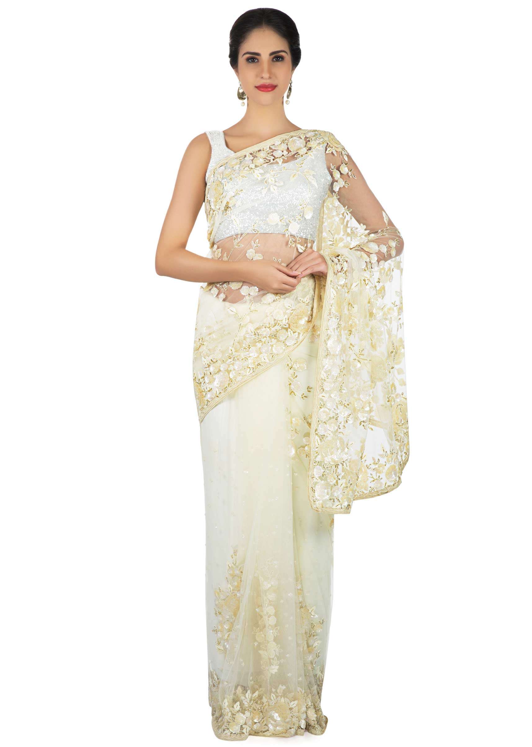 Off white saree in net with self color sequin and cut dana embroidery only on Kalki