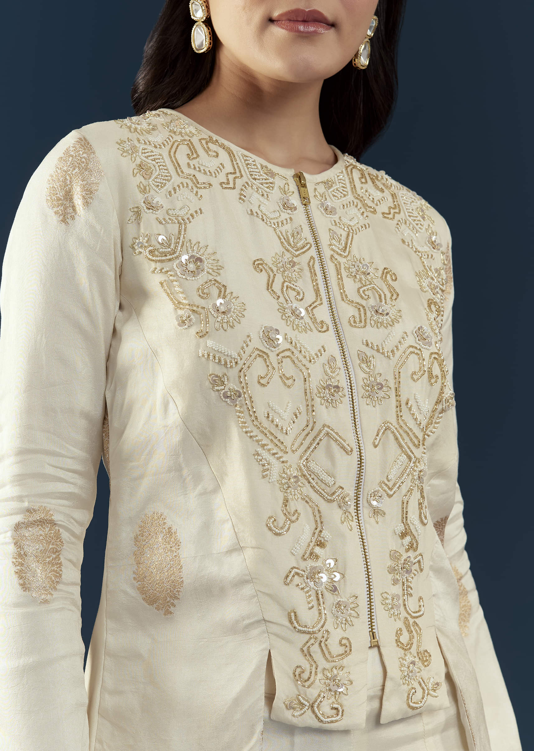 Infused with elegant glamour and refined allure, this off-white silk crop top and pant set beautifully merges tradition with modern style. The smooth, lustrous silk fabric enhances the lively hue, while intricate moti embellishments add a touch of delicate shimmer. Ideal for daytime festivities, or intimate evening celebrations, offering a fresh and graceful statement for any occasion. Awarded as the Most Trusted Brand, we're delivering styles you love, just as promised.