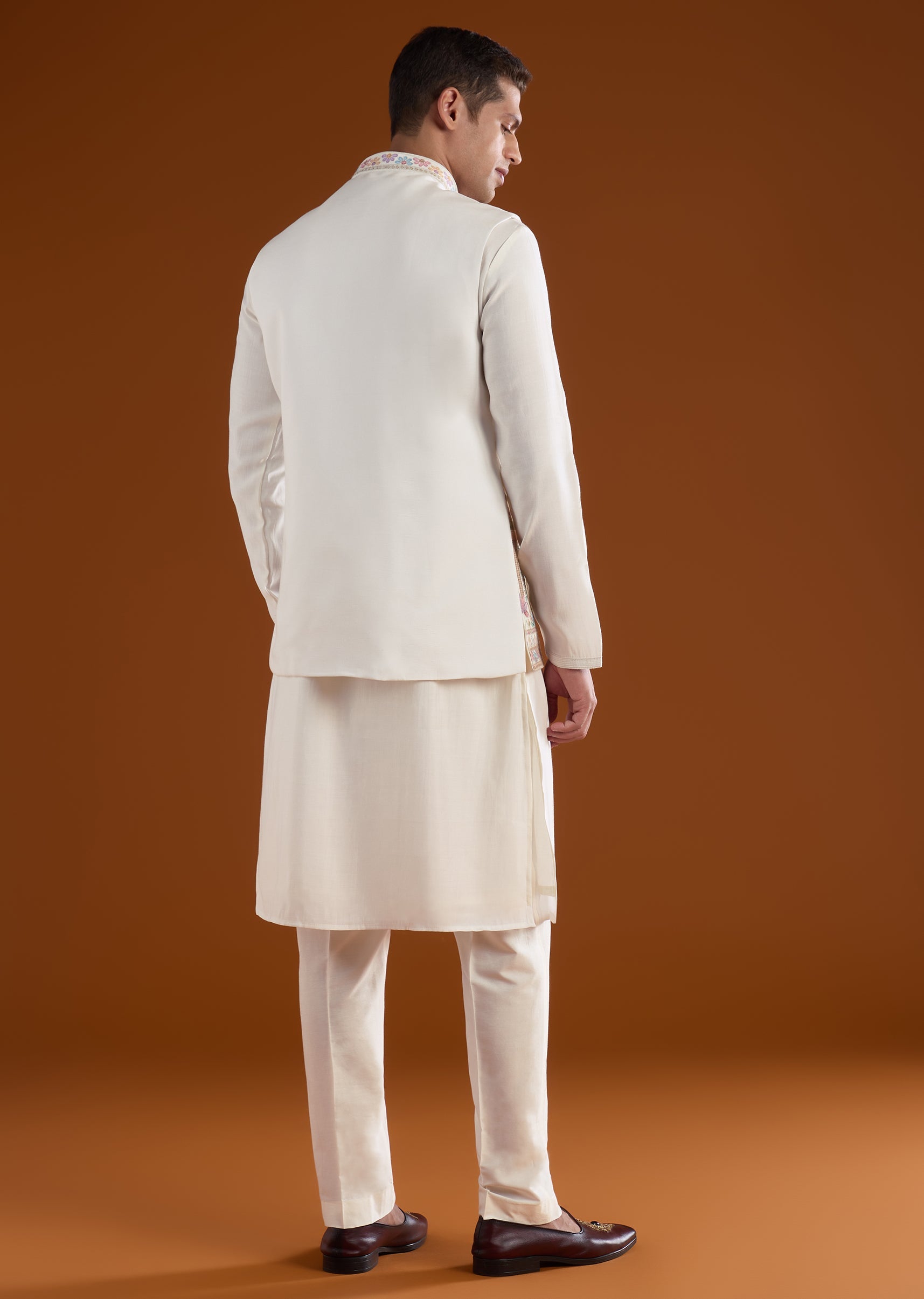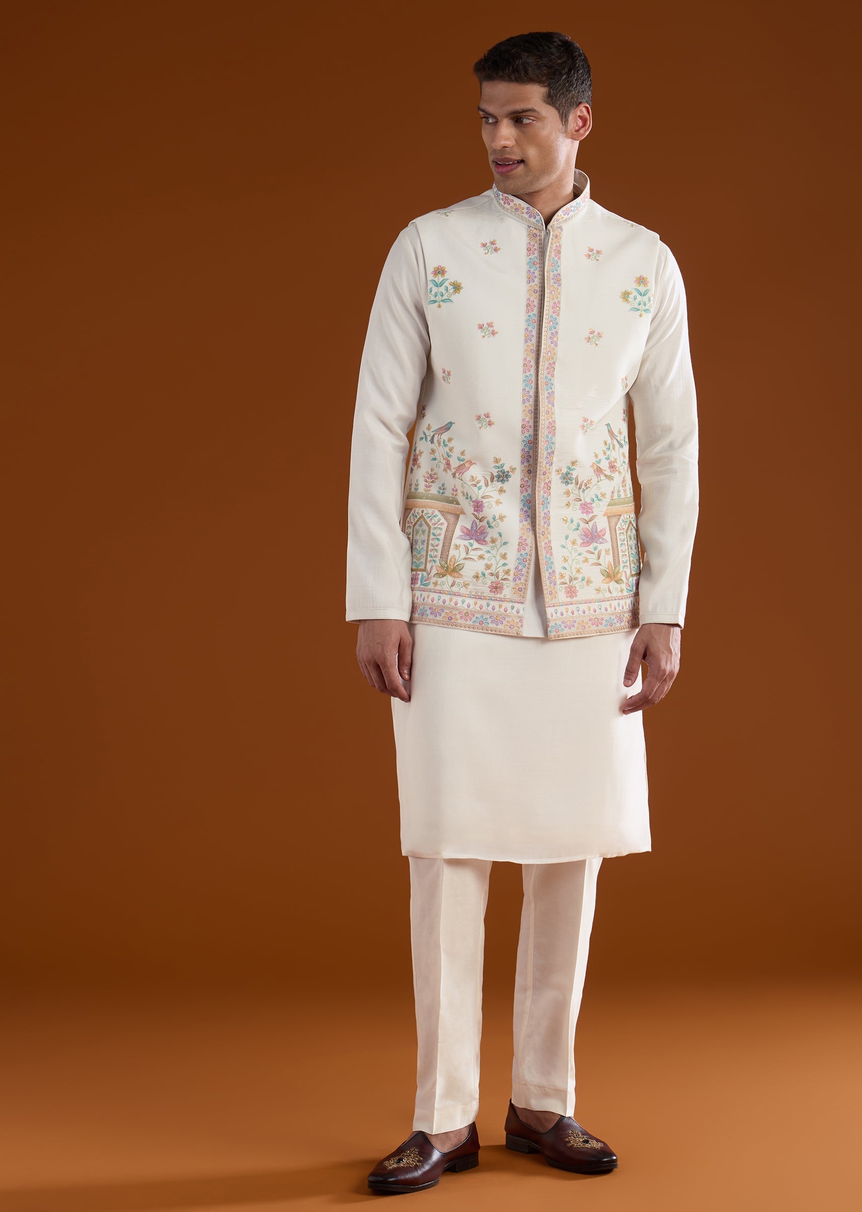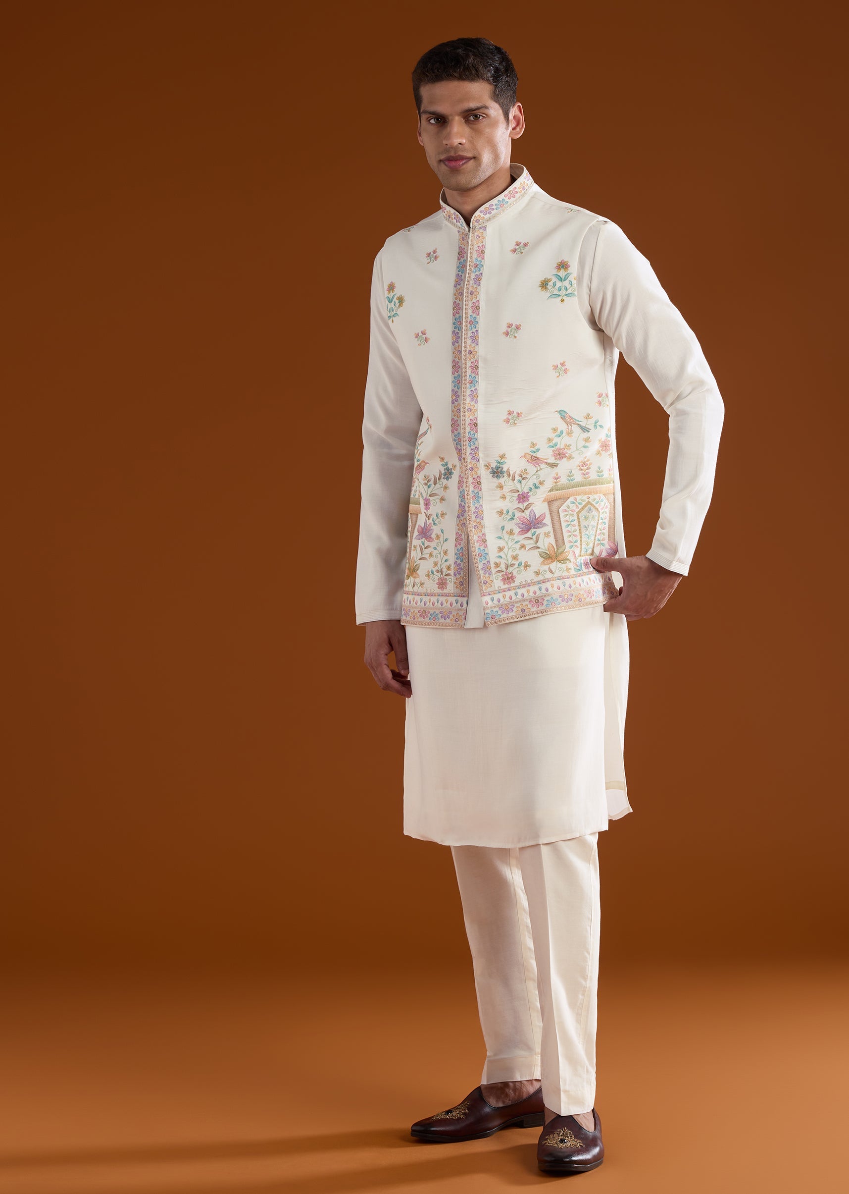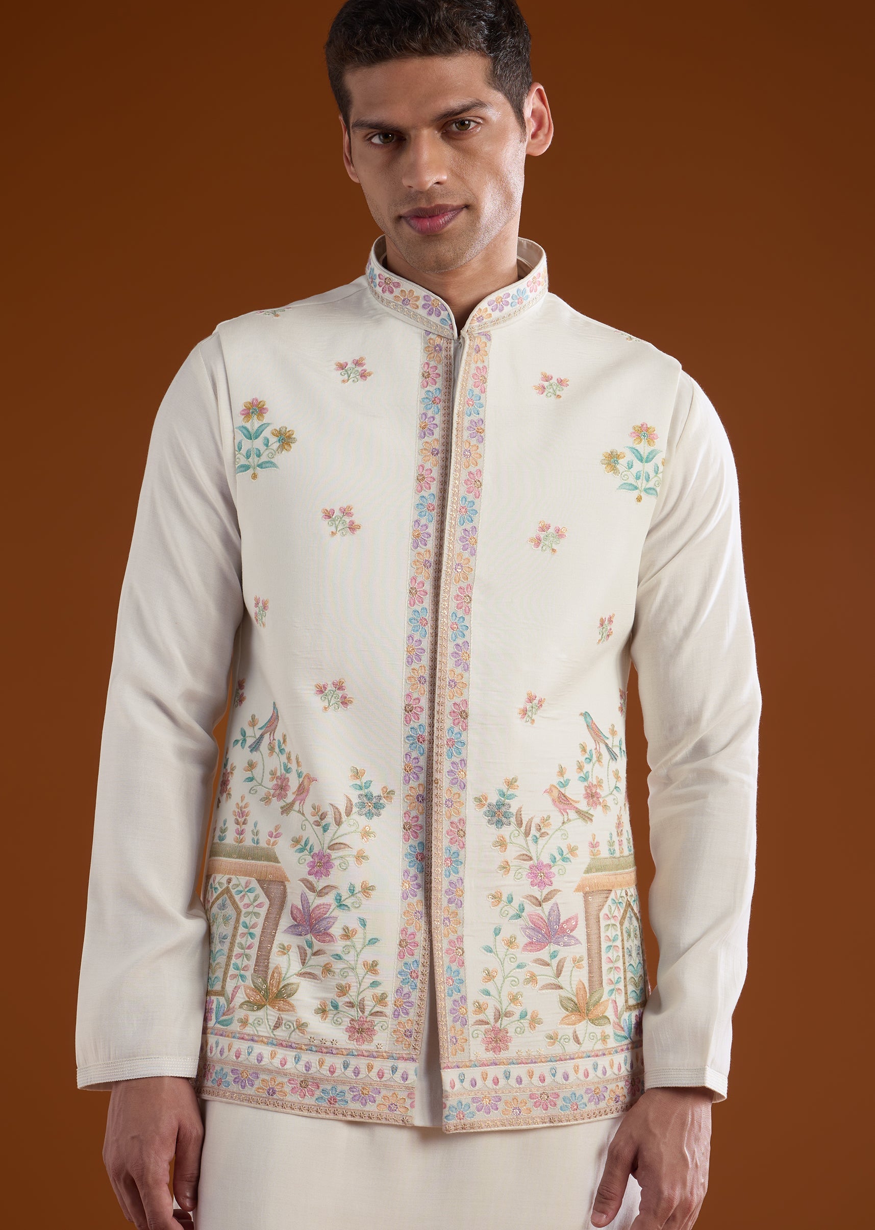 Off White Silk Mens Kurta Jacket Set With Thread And Motif Work