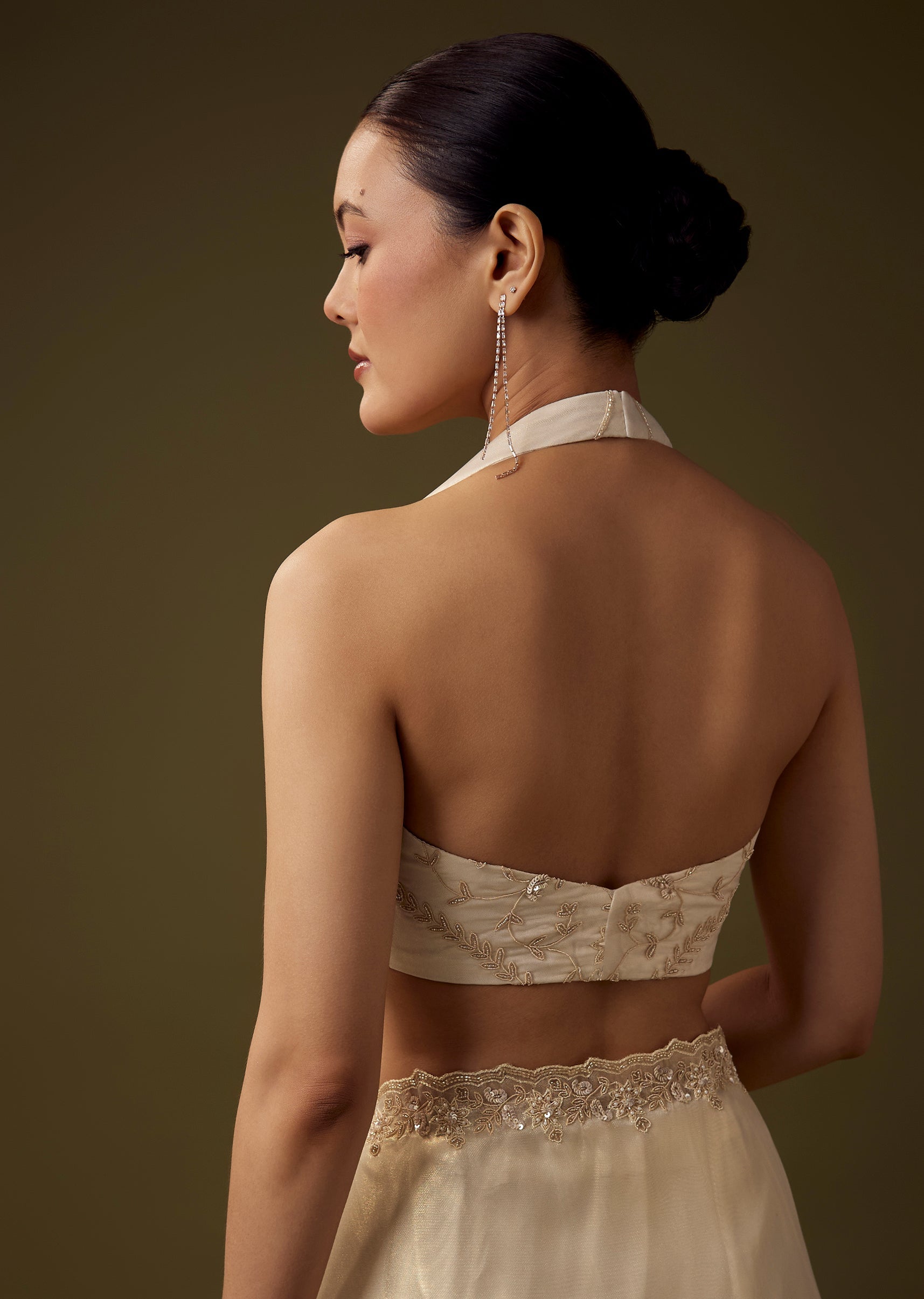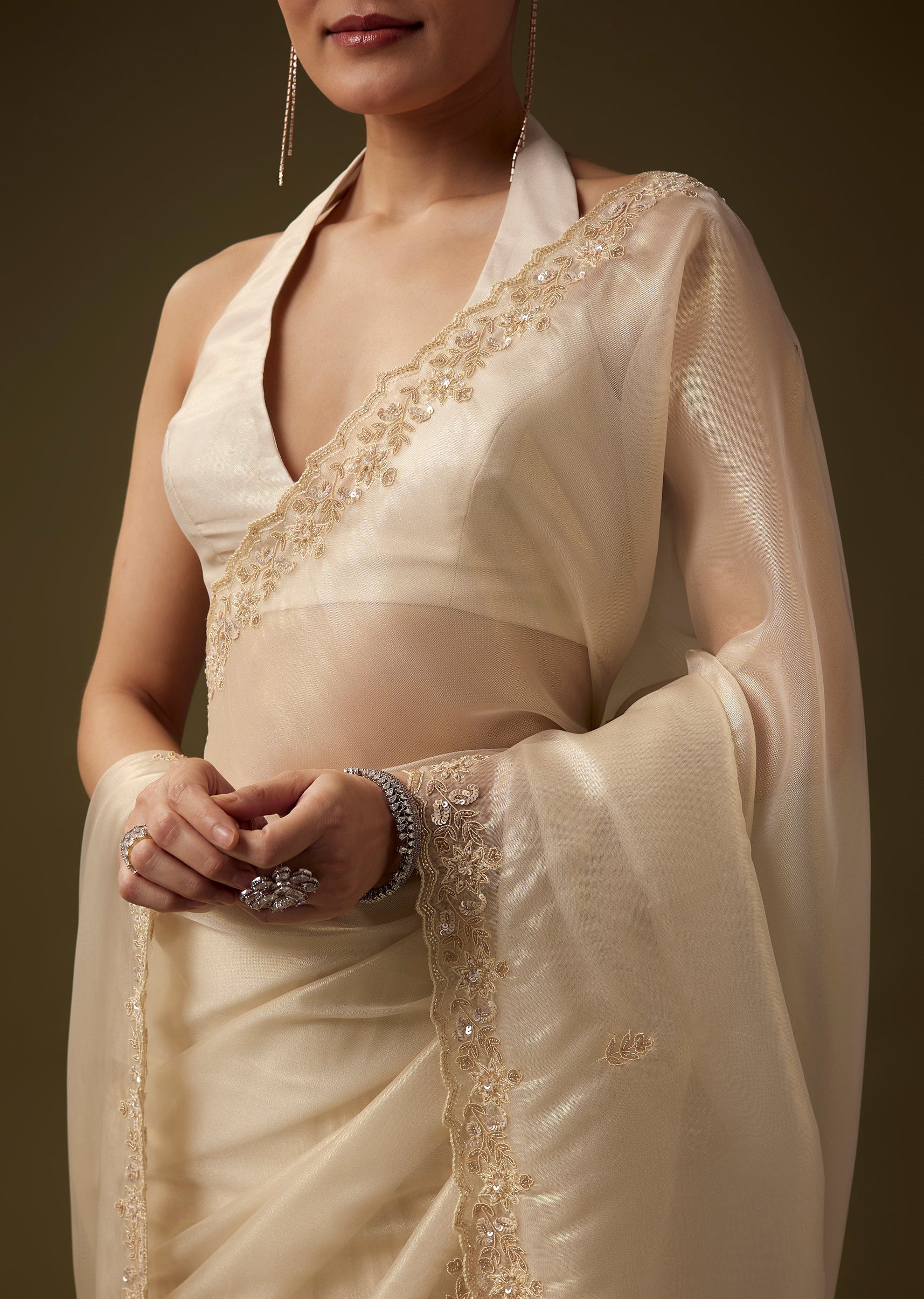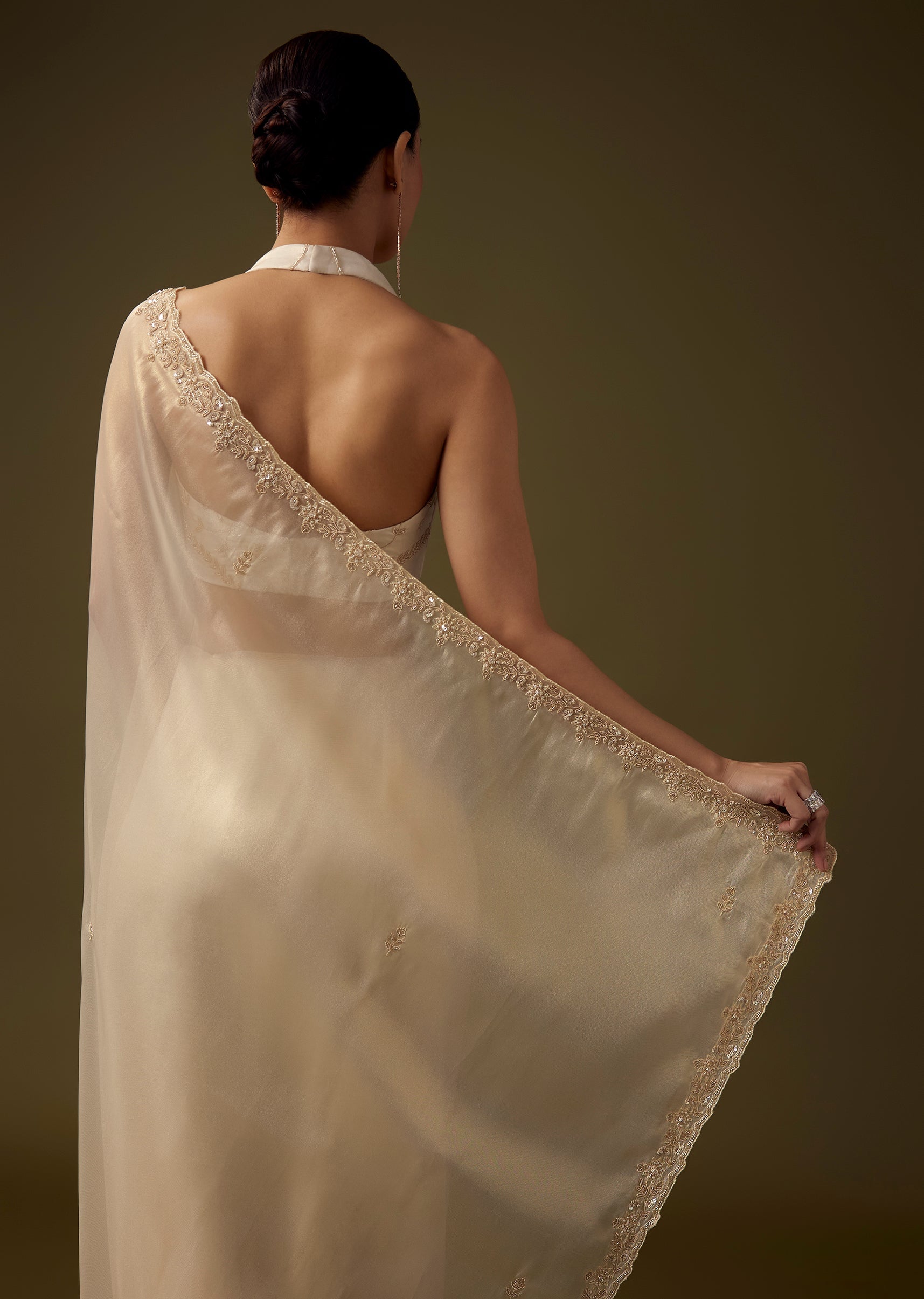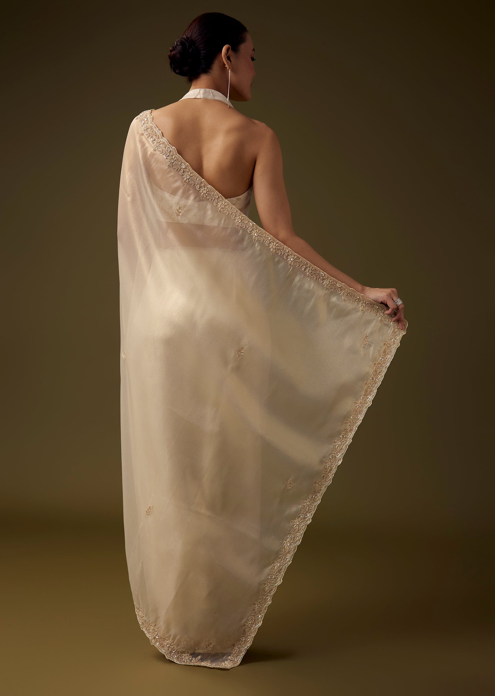 Off White Tissue Embroidered Saree with Unstitched Blouse