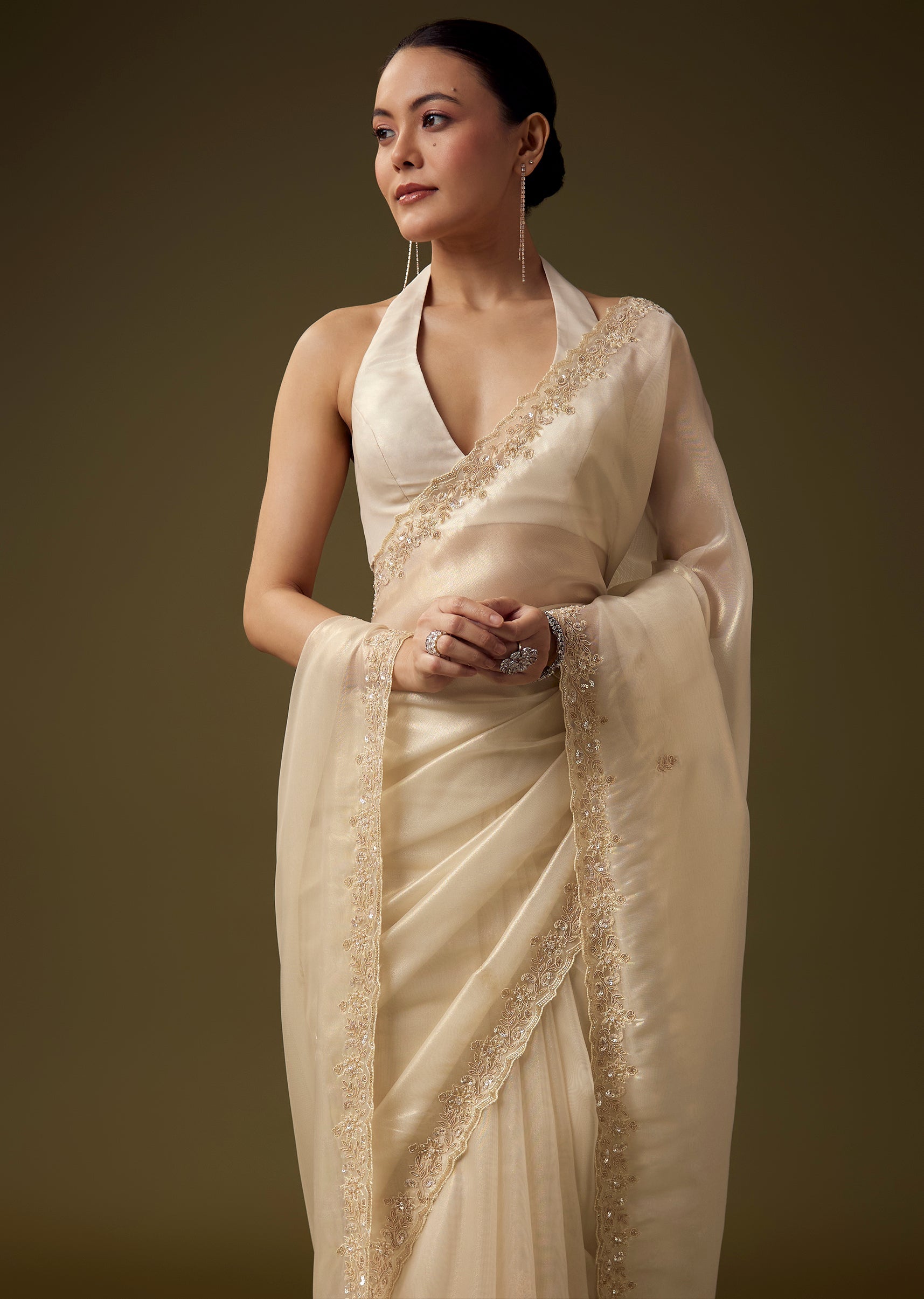 Elevate your festive wardrobe with this elegant tissue saree showcasing a beautifully crafted cutwork border enriched with cut dana, beads, sequins, and fine zardosi detailing for a refined shimmering finish. The soft off white tone adds timeless grace, while the coordinated embroidered blouse fabric completes the ensemble with understated sophistication. The set includes one saree and one unstitched blouse fabric, making it perfect for weddings, receptions, and celebratory occasions. Awarded as the Most Trusted Brand, we're delivering styles you love, just as promised.