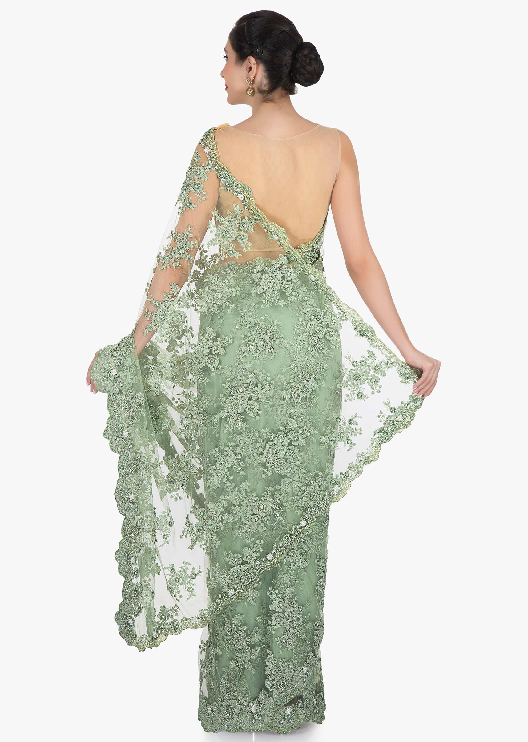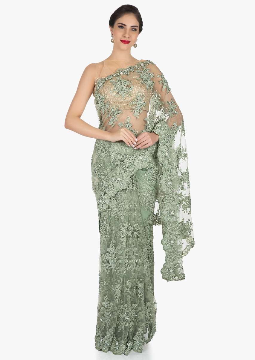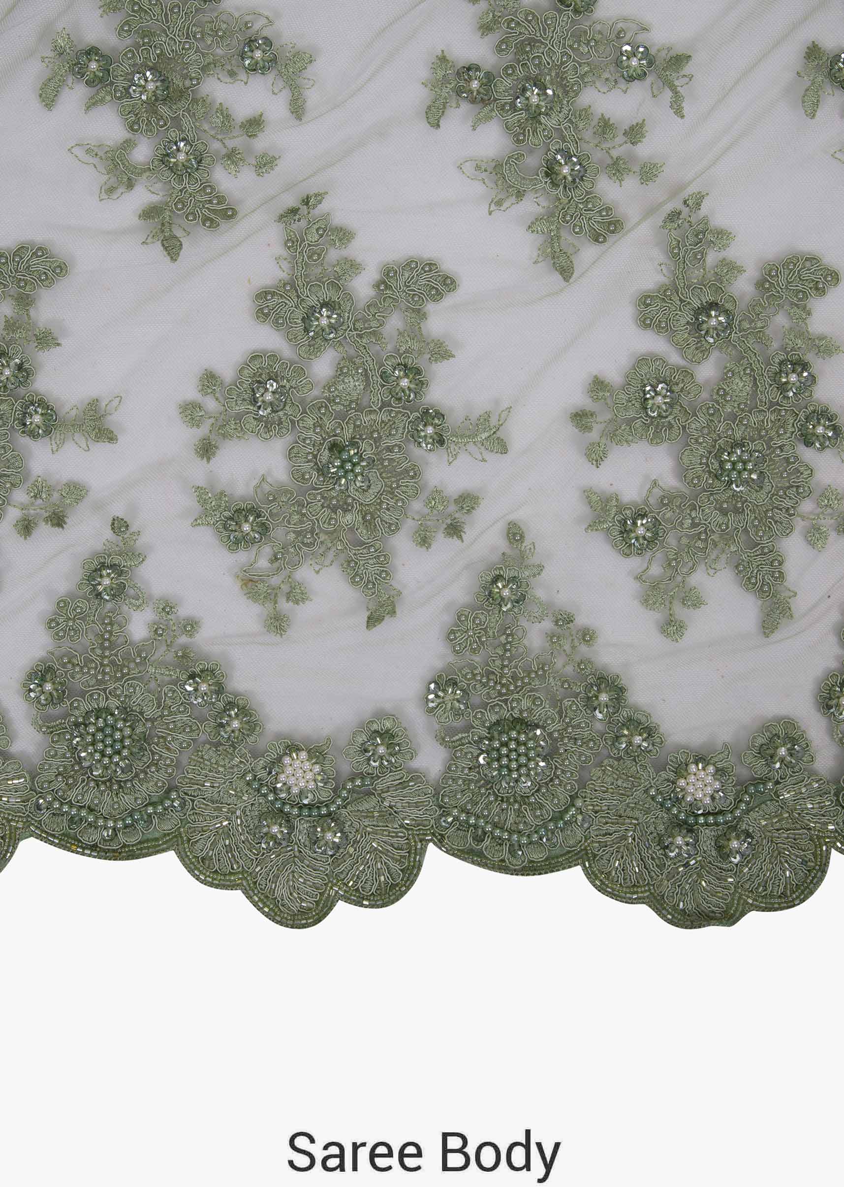 Olive green in embroidered net embellished with resham and moti work only on Kalki