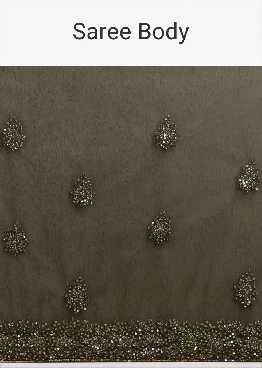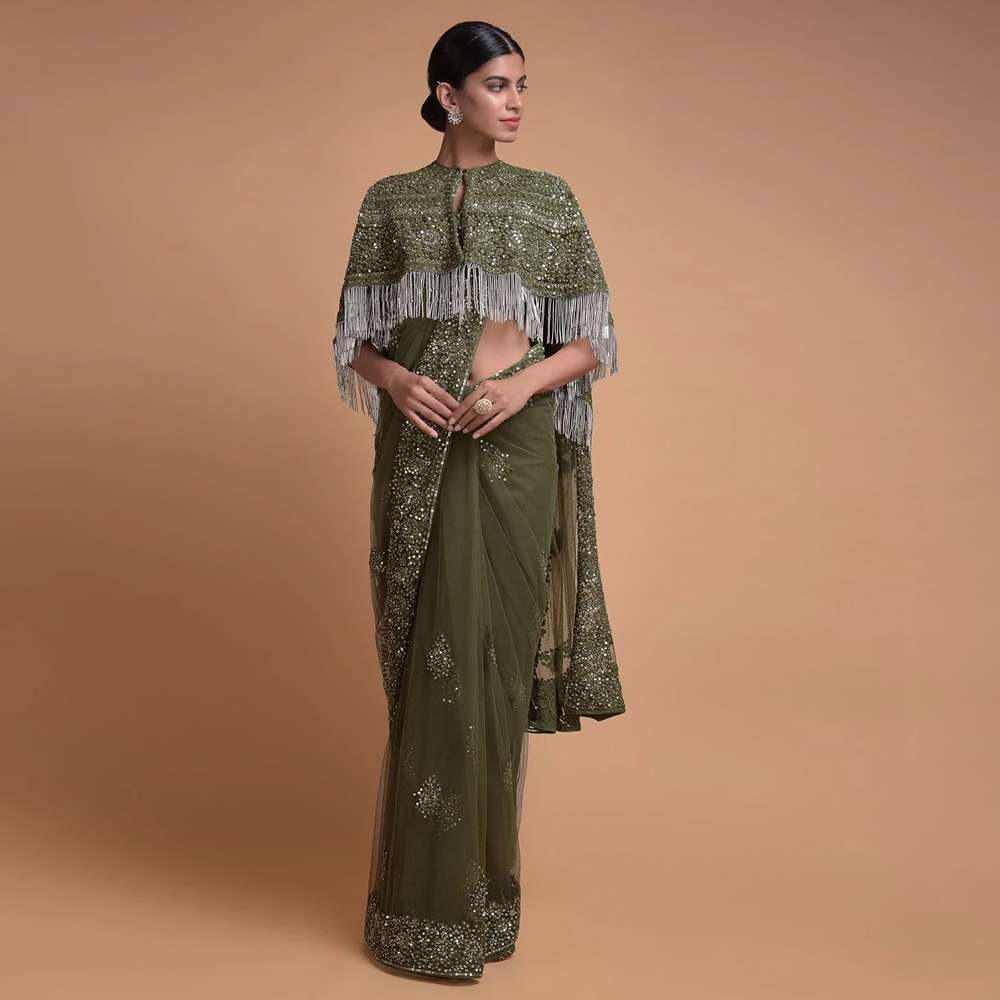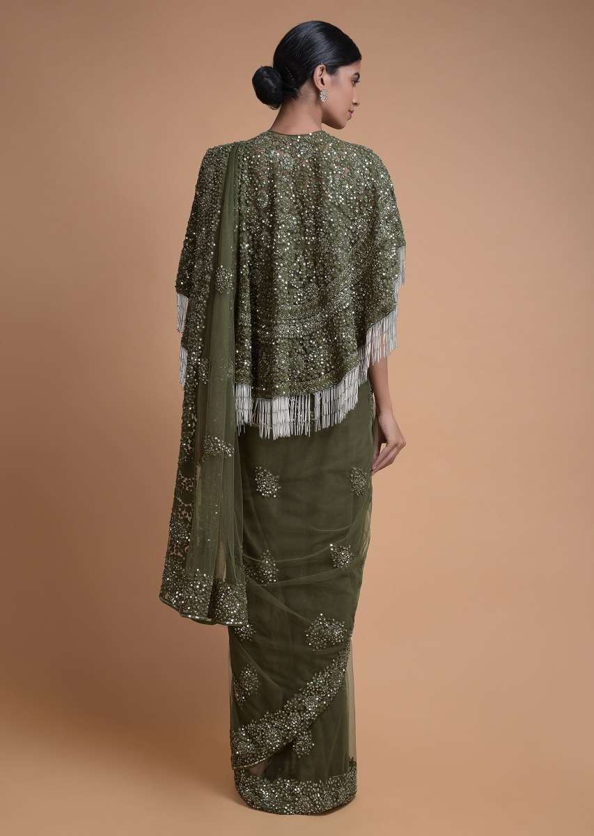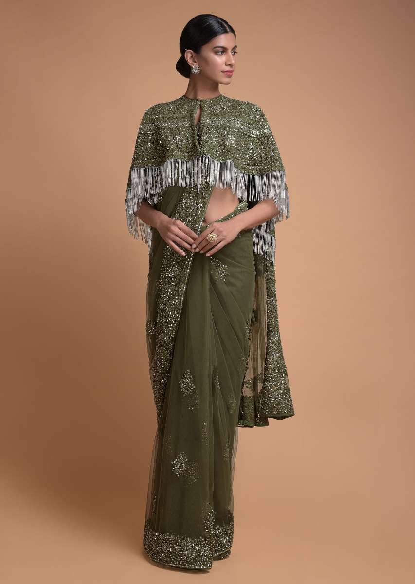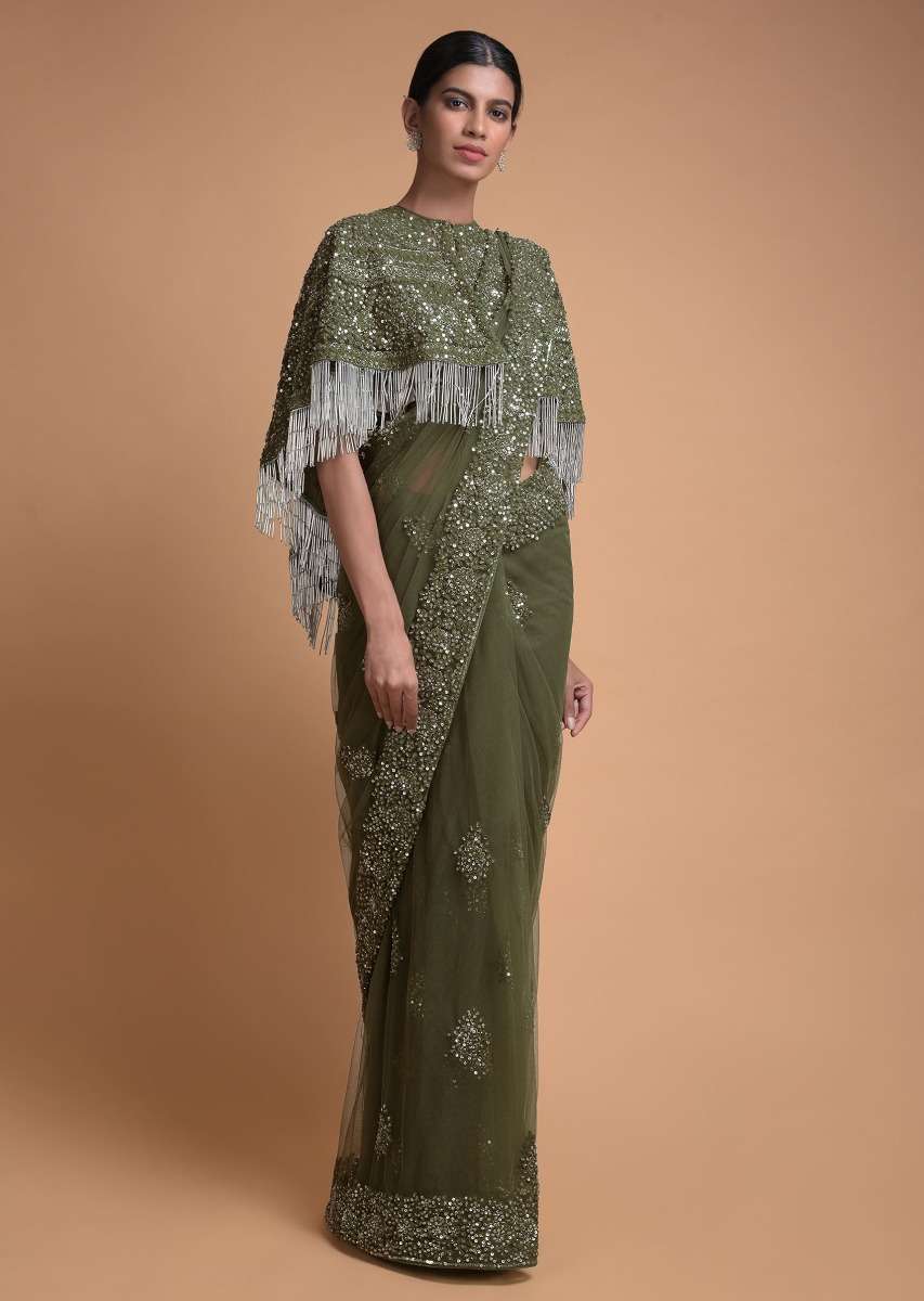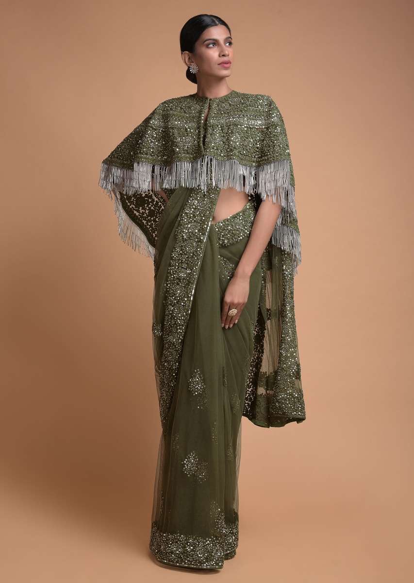 Olive Green Saree In Net With Matching Cape Having Floral Jaal Embroidery Online - Kalki Fashion