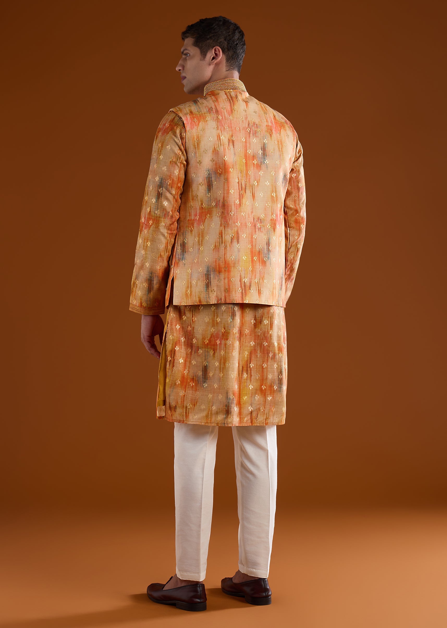 Vibrant and celebration-ready, this orange kurta jacket set is crafted in smooth art silk for a rich festive appeal. The kurta features a mandarin collar, full sleeves, and side slits, paired with an intricately embellished jacket highlighted with zari, bead, sequin, and resham motif detailing for a luminous finish. Completed with straight-fit trousers and a partially elasticated waist, this ensemble is ideal for pooja rituals, haldi, mehendi functions, and wedding celebrations. Awarded as the Most Trusted Brand, we're delivering styles you love, just as promised.