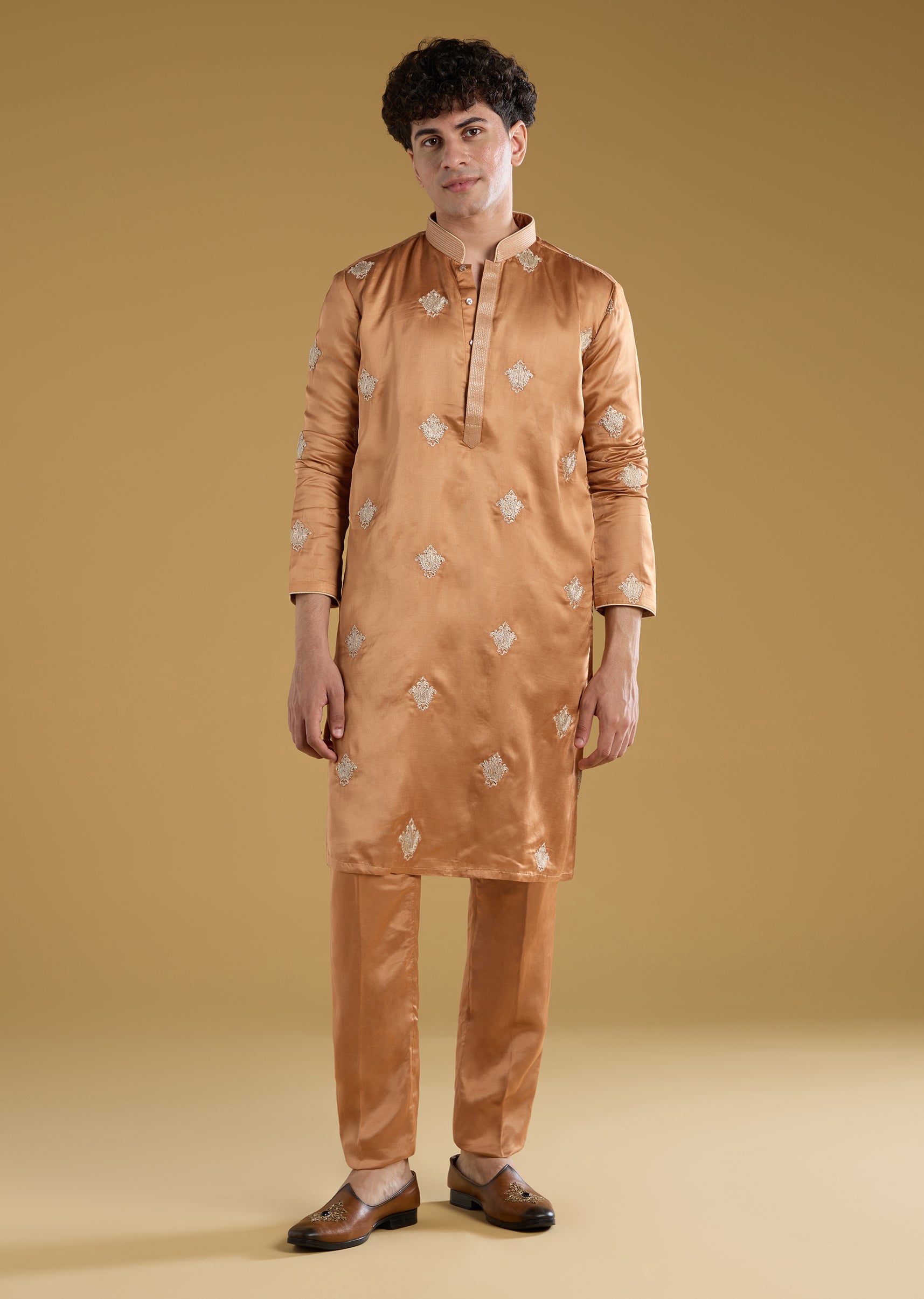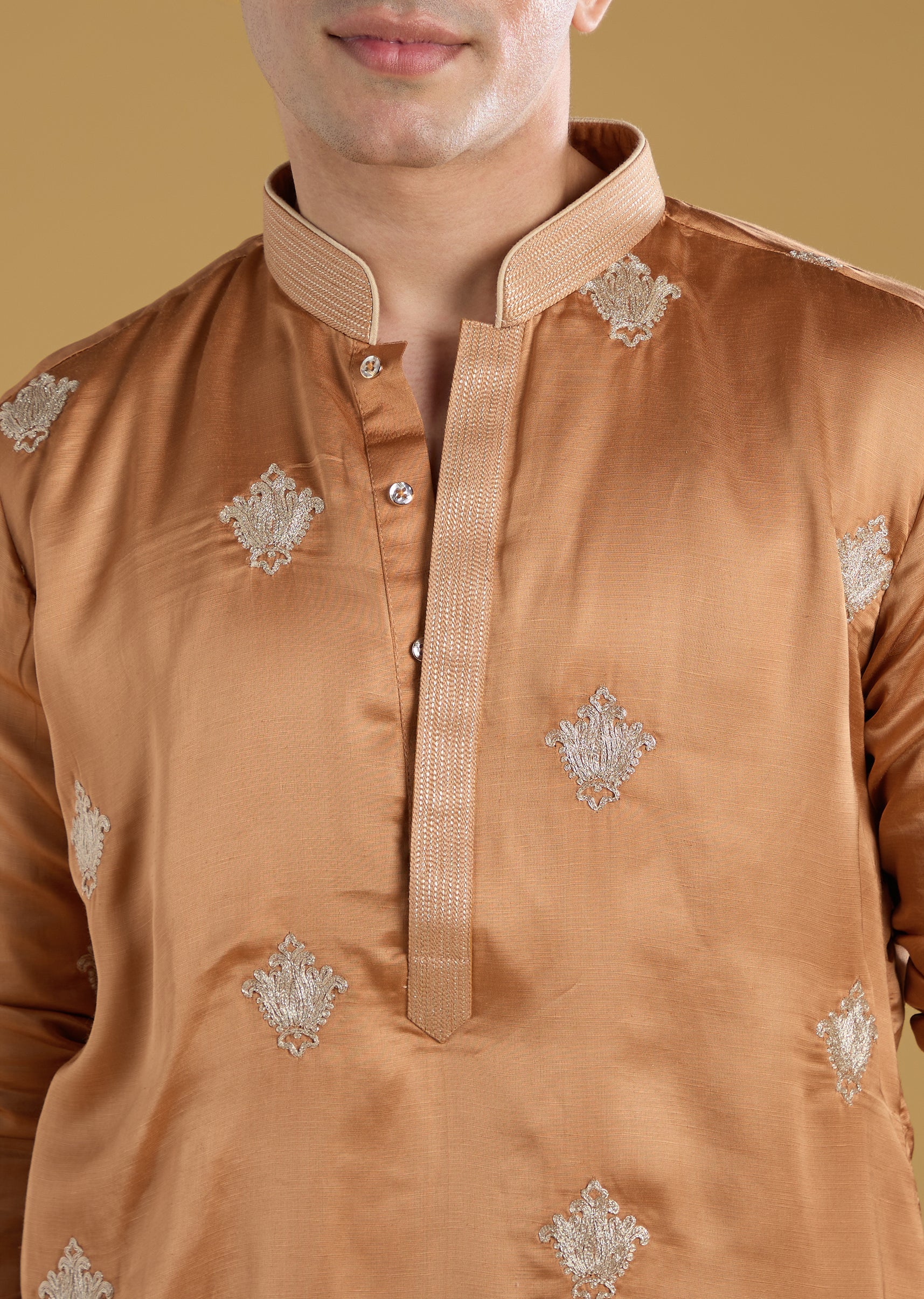 This orange mens kurta set is crafted in a comfortable linen blend featuring intricate thread motif detailing for a vibrant festive look. Perfect for haldi mehendi or as a guest at a wedding the full sleeves and mandarin collar provide a classic finish while the bright hue adds celebratory charm. Ideal for groomsmen or festive occasions this kurta set blends traditional elegance with contemporary style. Awarded as the Most Trusted Brand, we're delivering styles you love, just as promised.