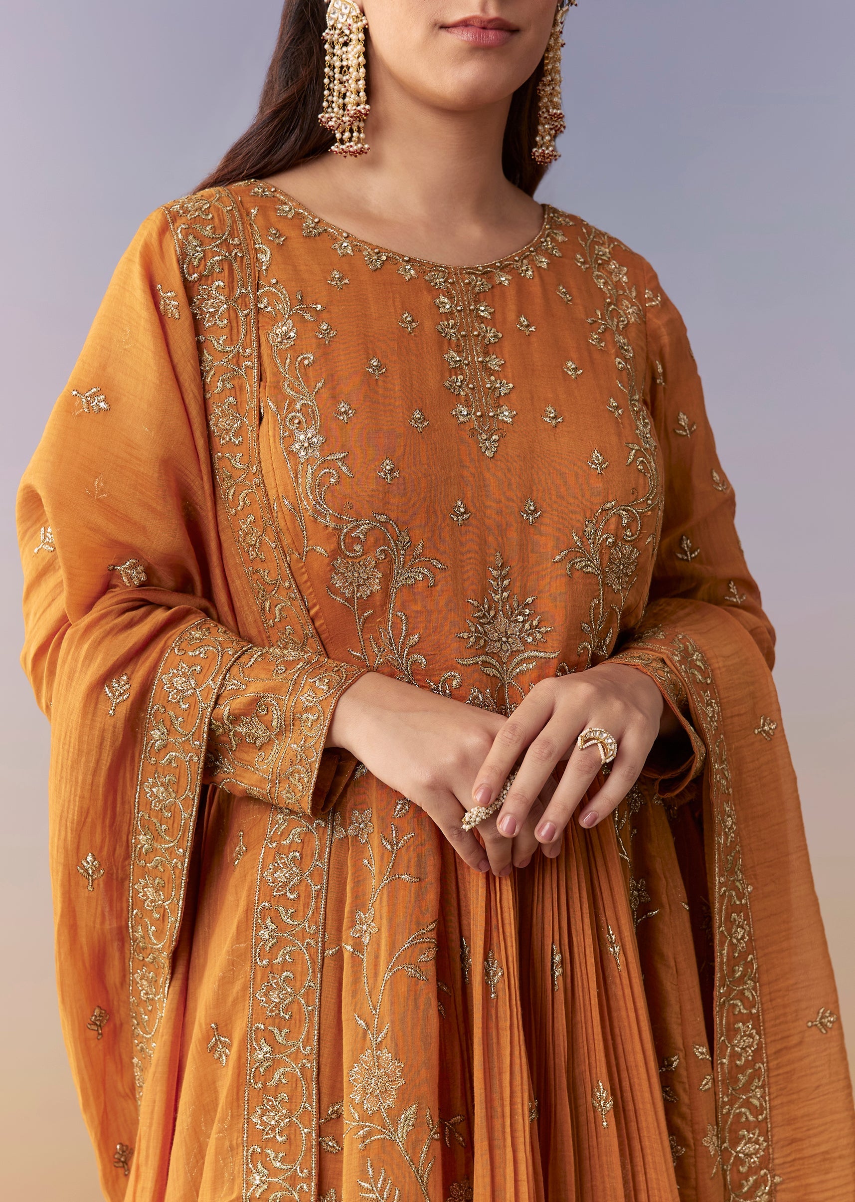 Crafted in mal chanderi, this vibrant orange A-line anarkali features metallic gold thread embroidery for a festive glow. Designed with full sleeves, a round neckline and back zip closure, it... More Product Details