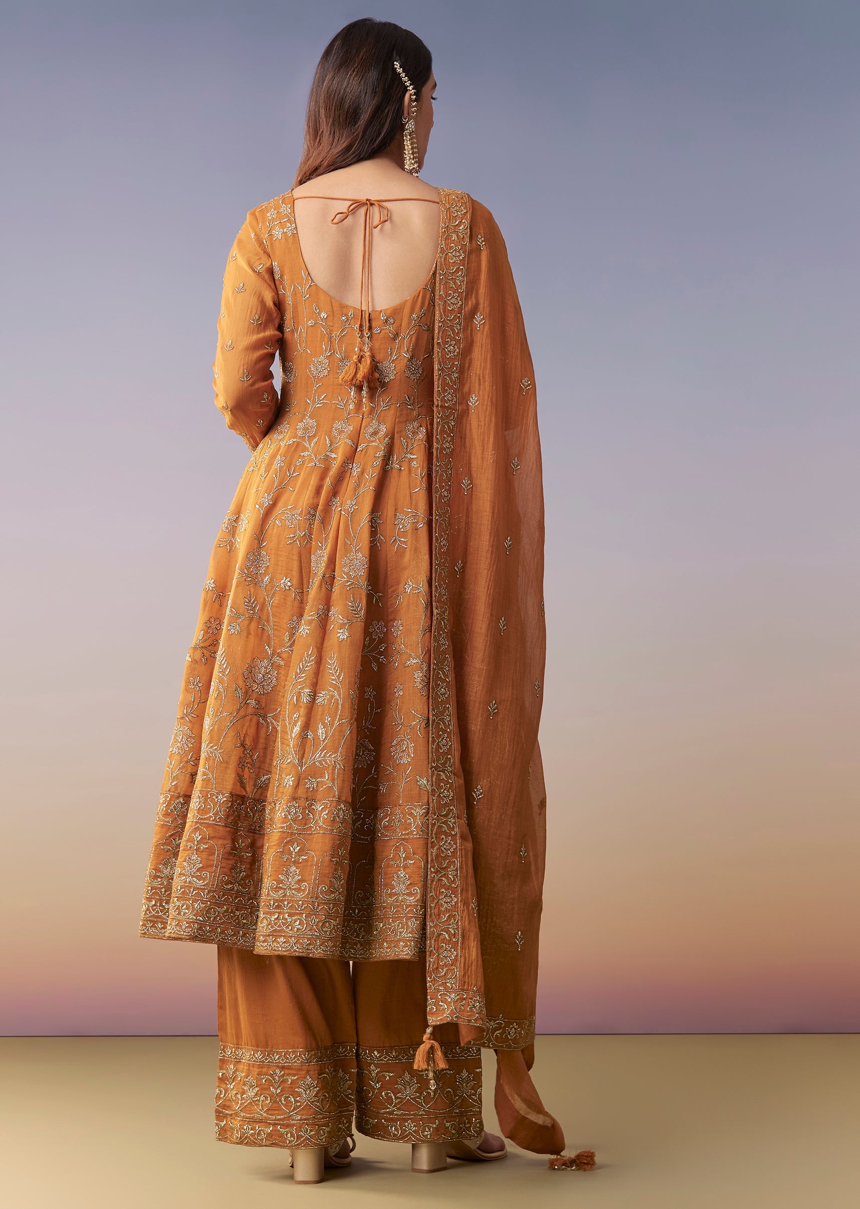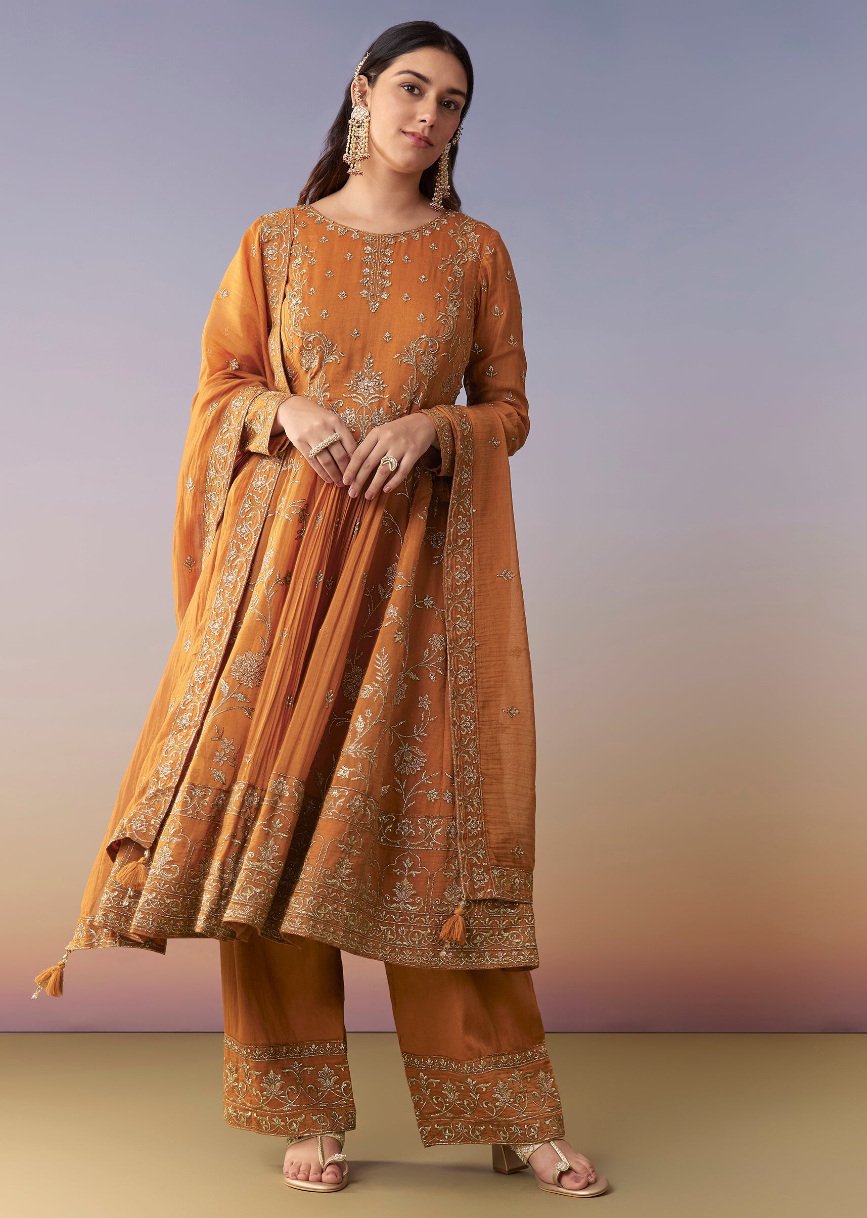 Orange Metallic Embroidered Anarkali Suit Set With Pant And Dupatta