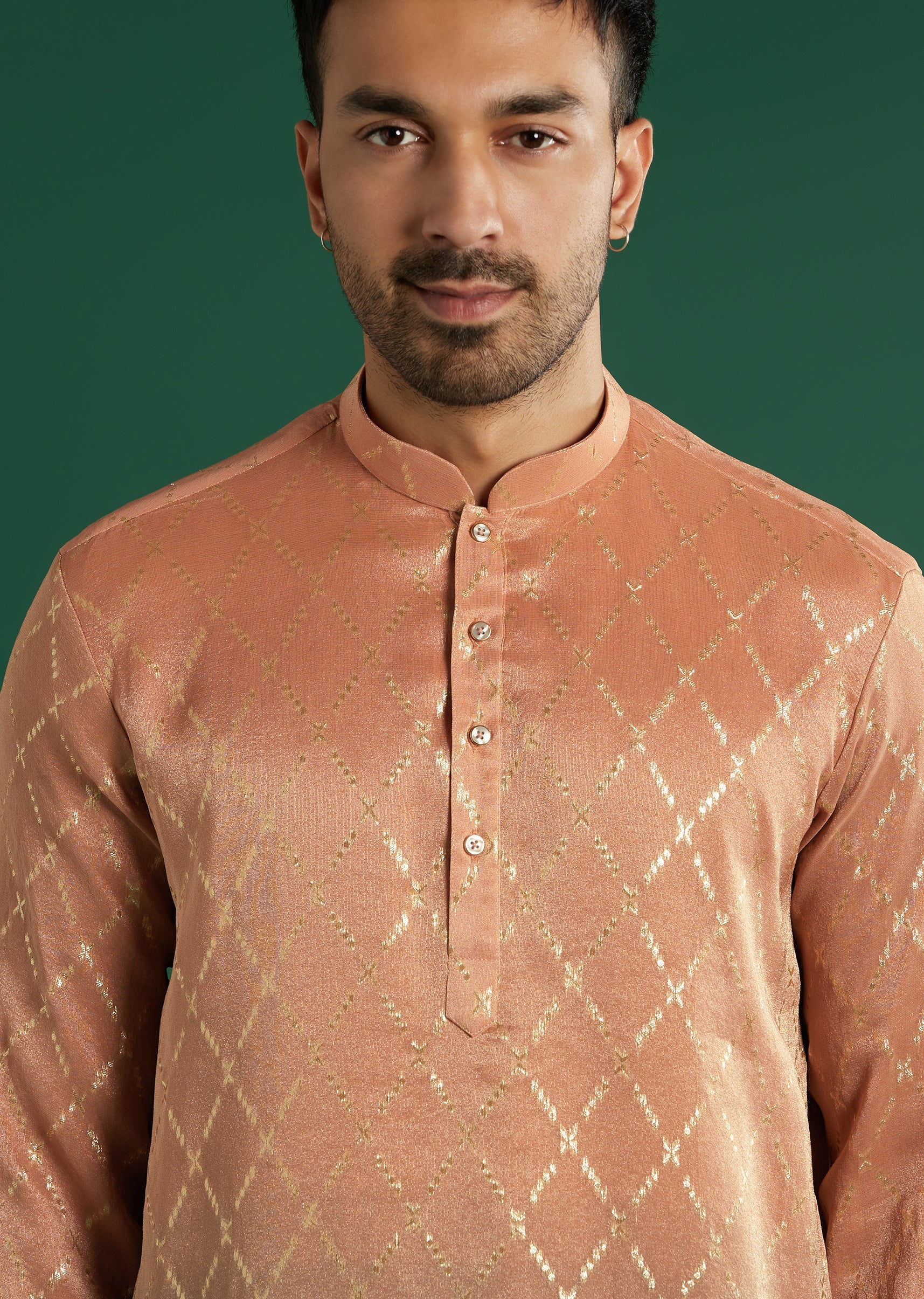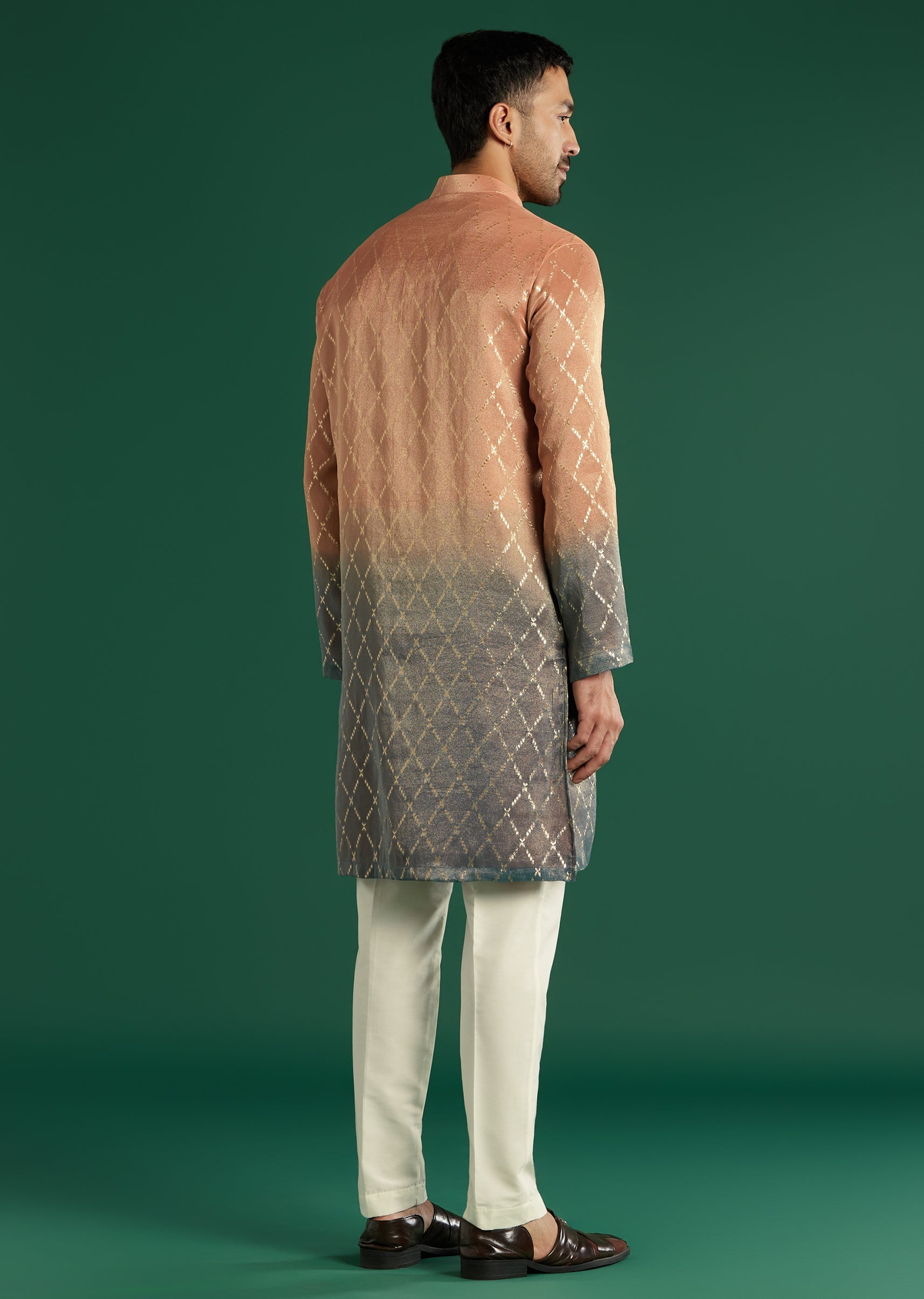 Orange Ombre Silk Kurta Set For Men With Diamond Pattern