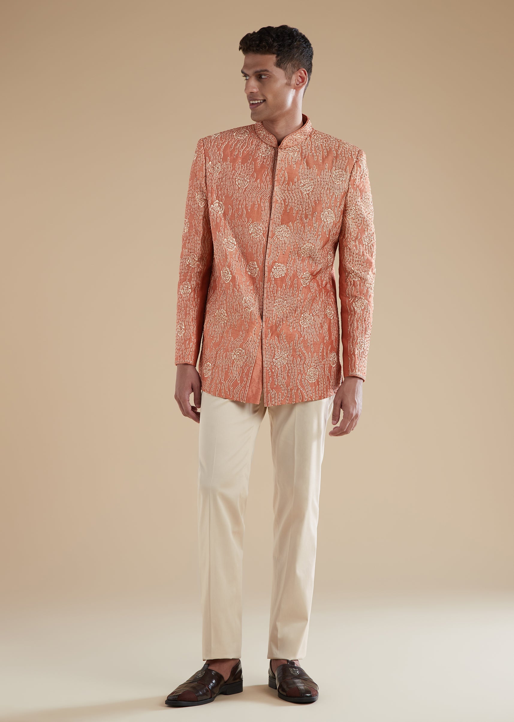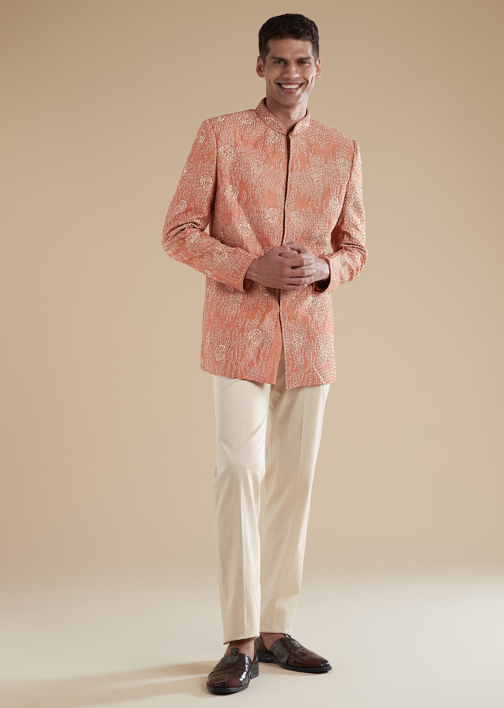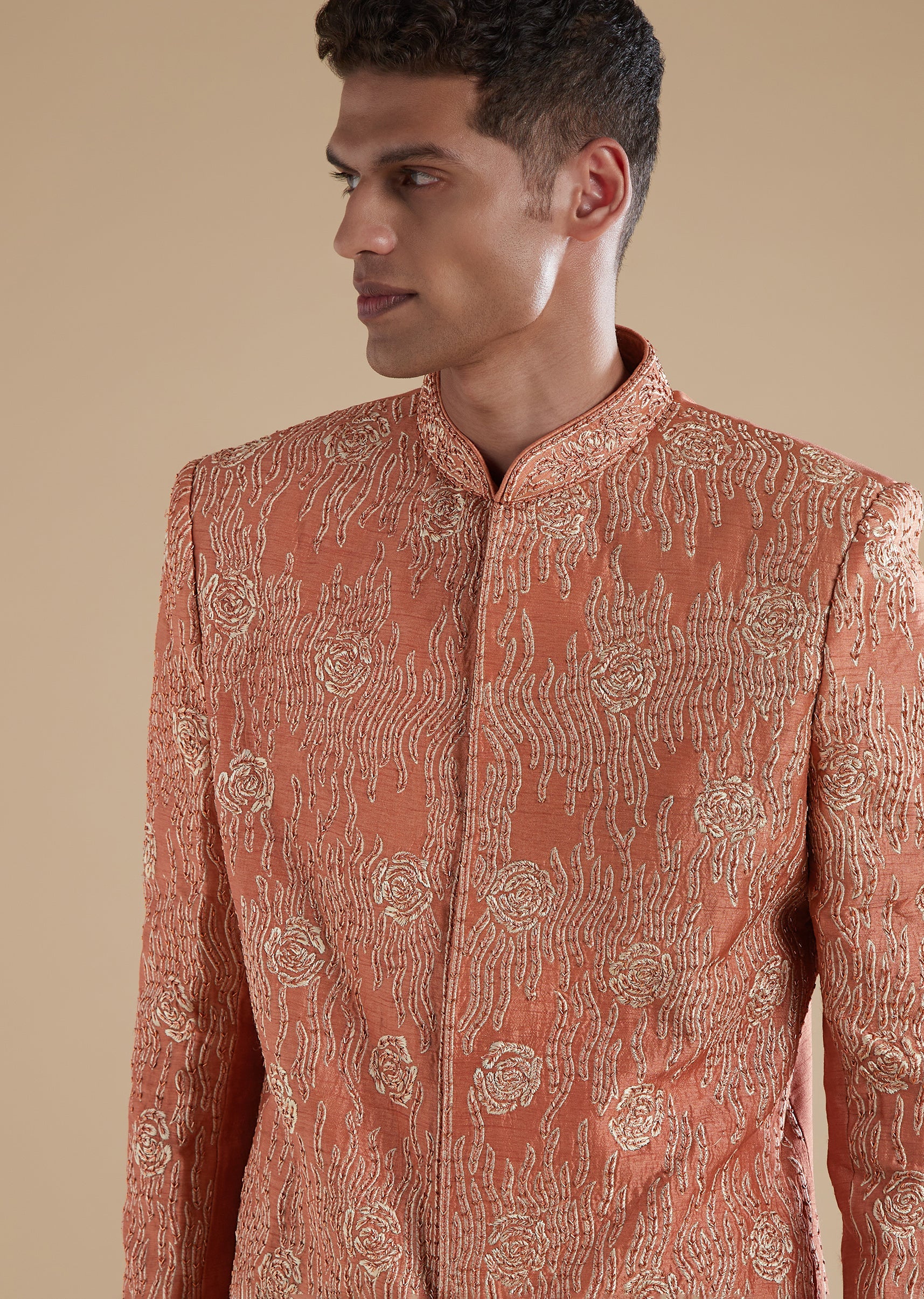This orange rust jodhpuris set blends soft pastel warmth with the richness of raw silk making it ideal for reception and engagement celebrations. The refined thread resham detailing adds subtle festive depth while the mandarin collar and full sleeves maintain a classic regal silhouette. The top closure is finished with a front hook eye and the bottom closure with front buttons ensuring a neat structured fit. Paired with coordinated pants this set is perfect for a grooms father or a groomsman looking for understated elegance.