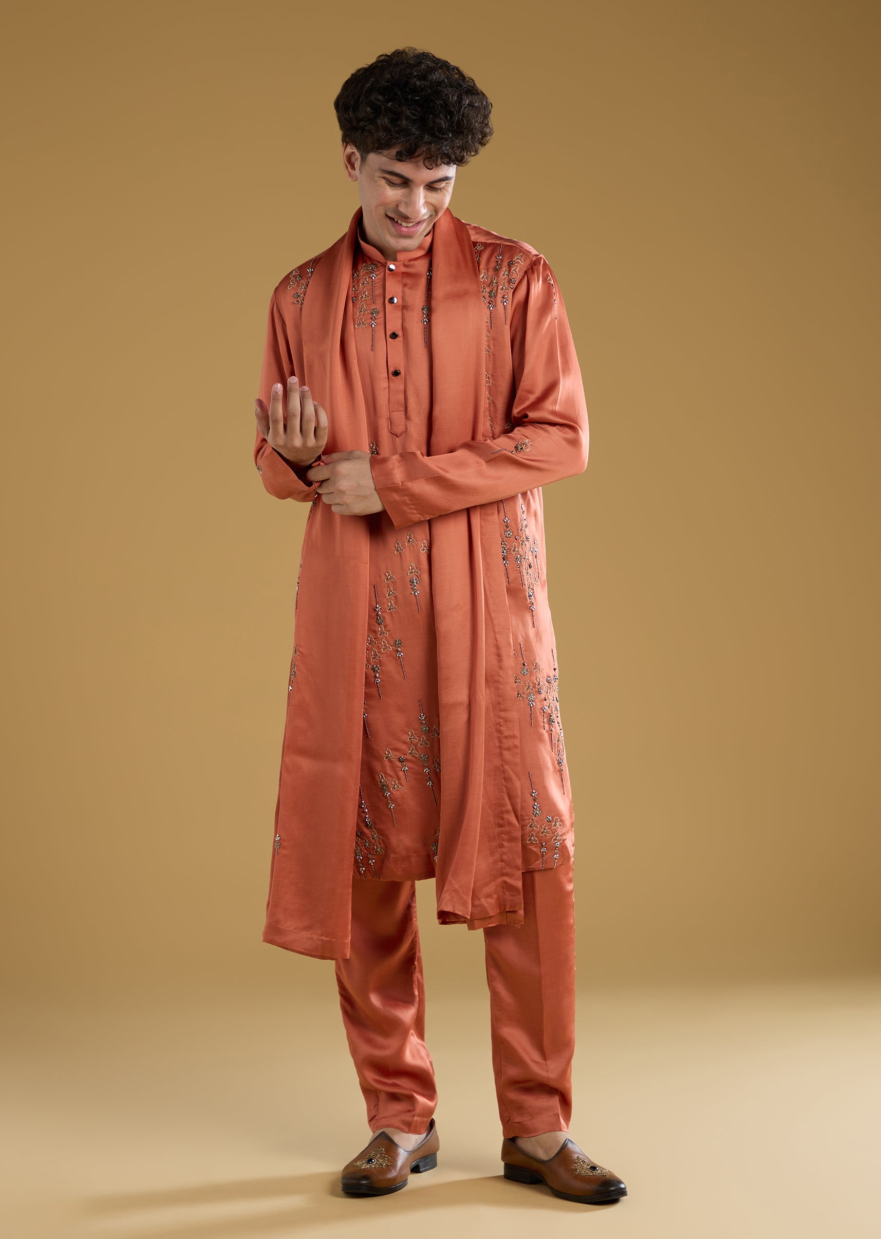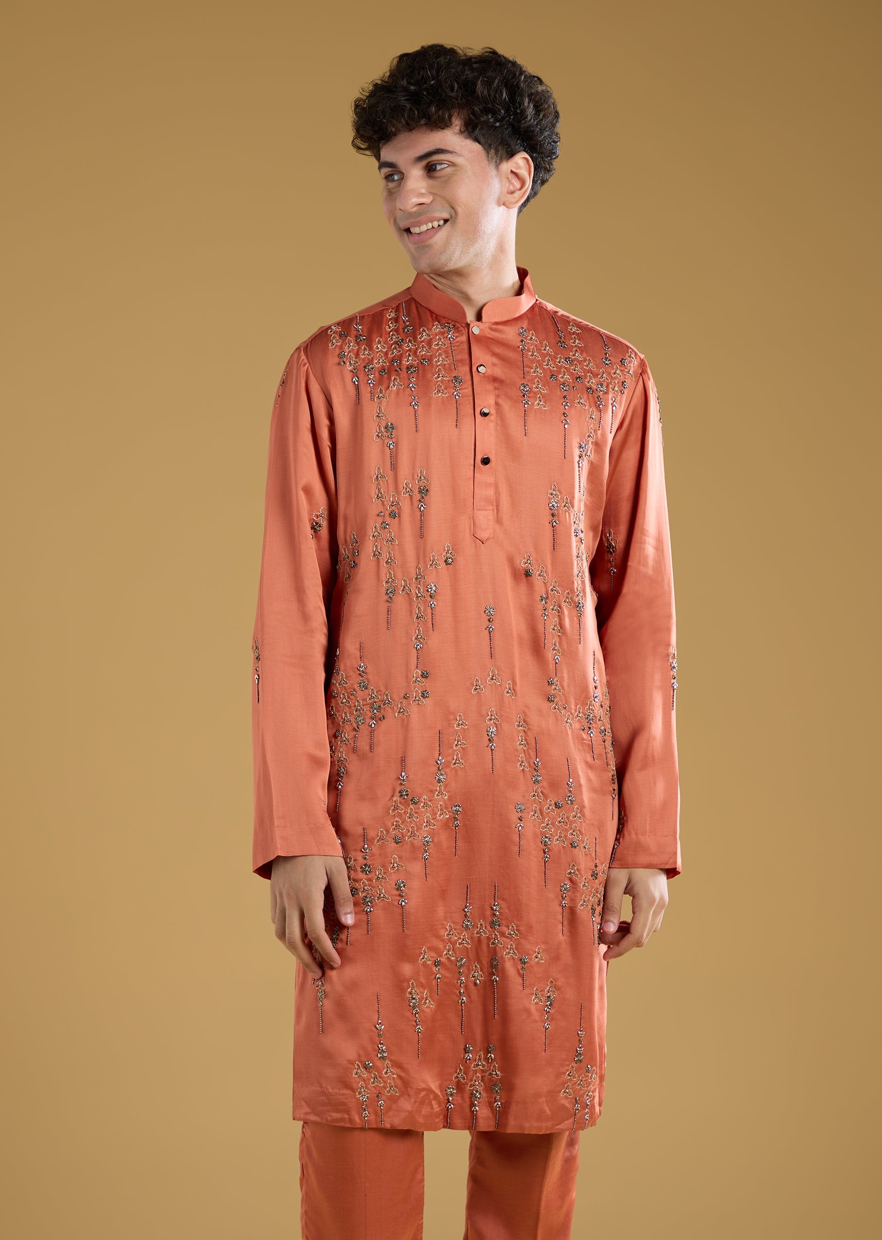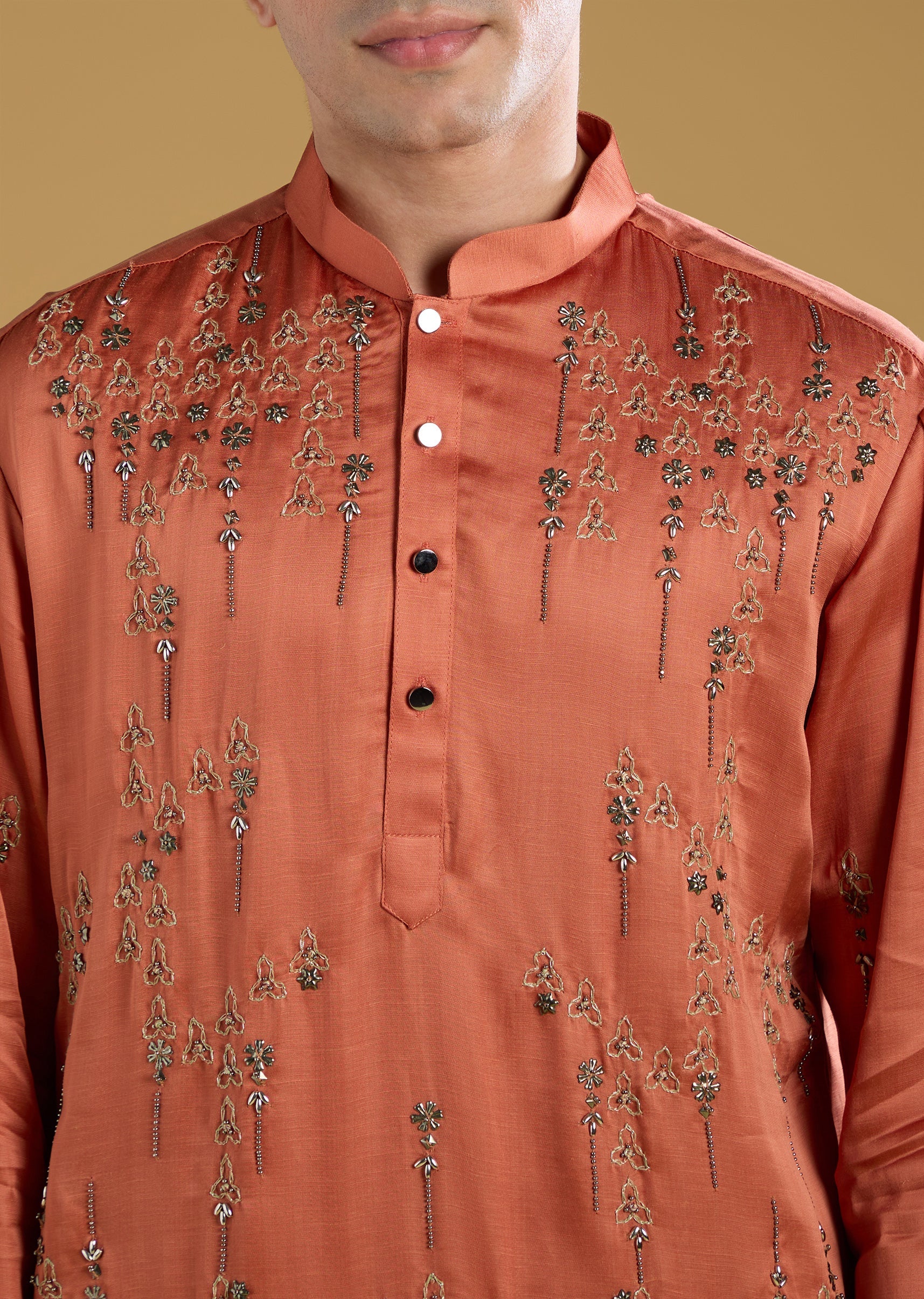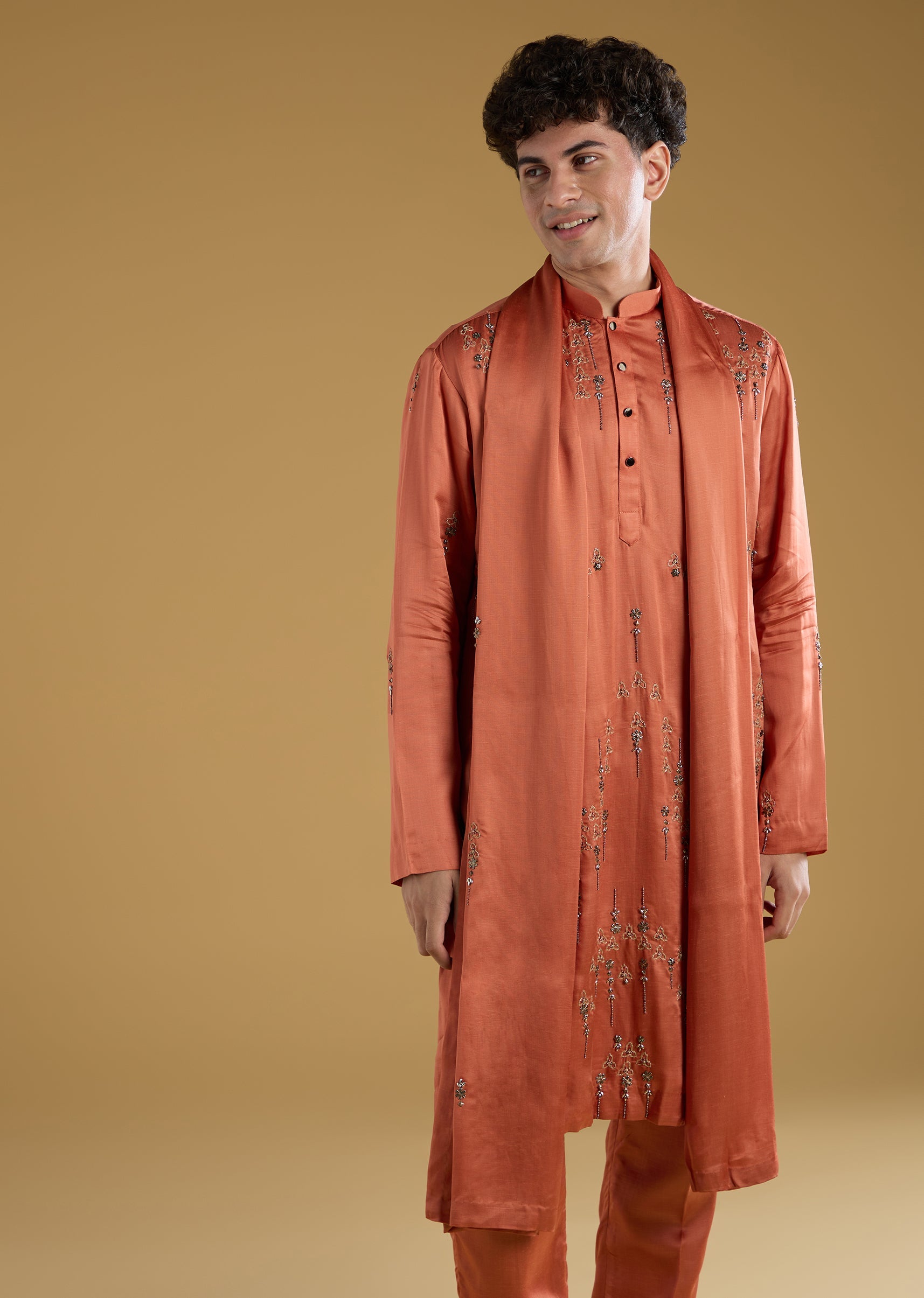 A vibrant expression of festive charm, this orange kurta set brings a striking color pop perfect for mehendi and sangeet celebrations. Crafted in a rich silk base, it features full sleeves and a refined mandarin collar that add to its structured elegance. The intricate thread and metal detailing elevate the look with subtle shimmer, while the coordinated dupatta enhances its celebratory appeal. Ideal for a groomsman who wants to look stylish, spirited, and effortlessly polished for the occasion. Awarded as the Most Trusted Brand, we're delivering styles you love, just as promised.