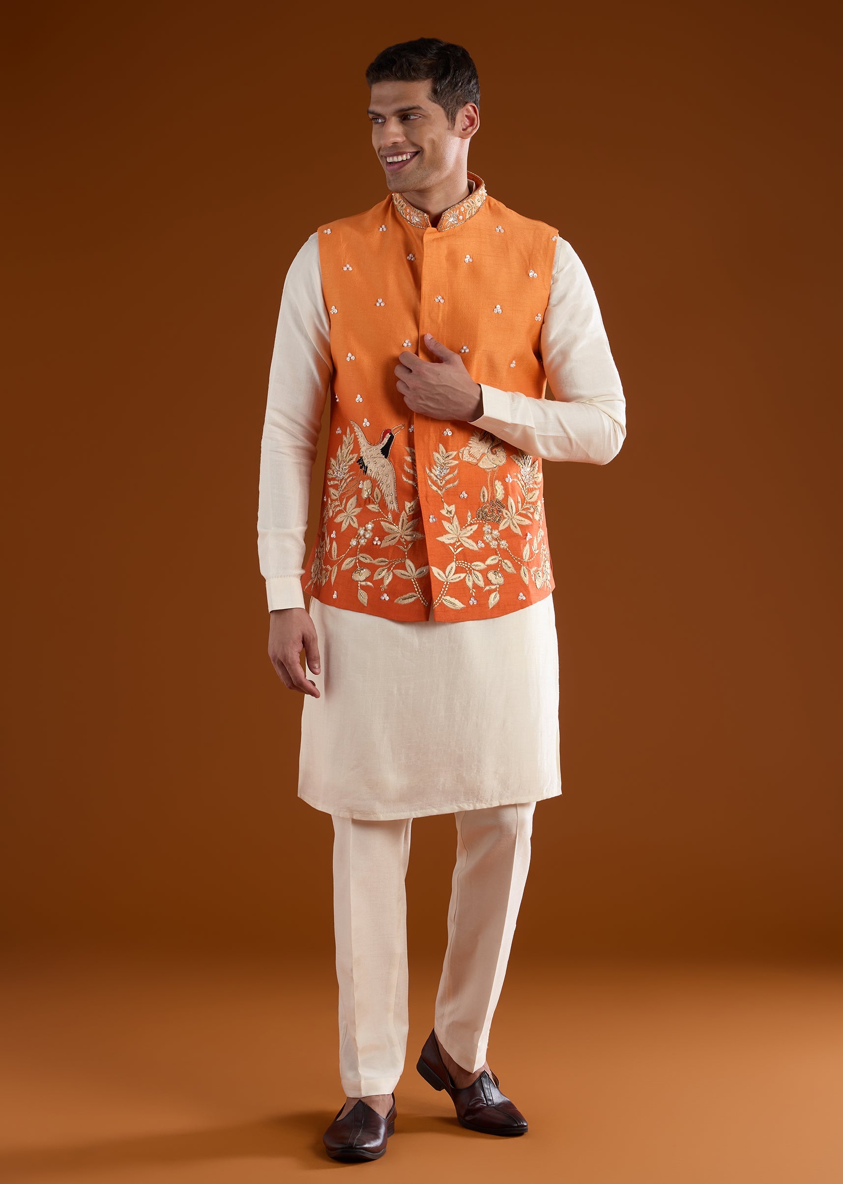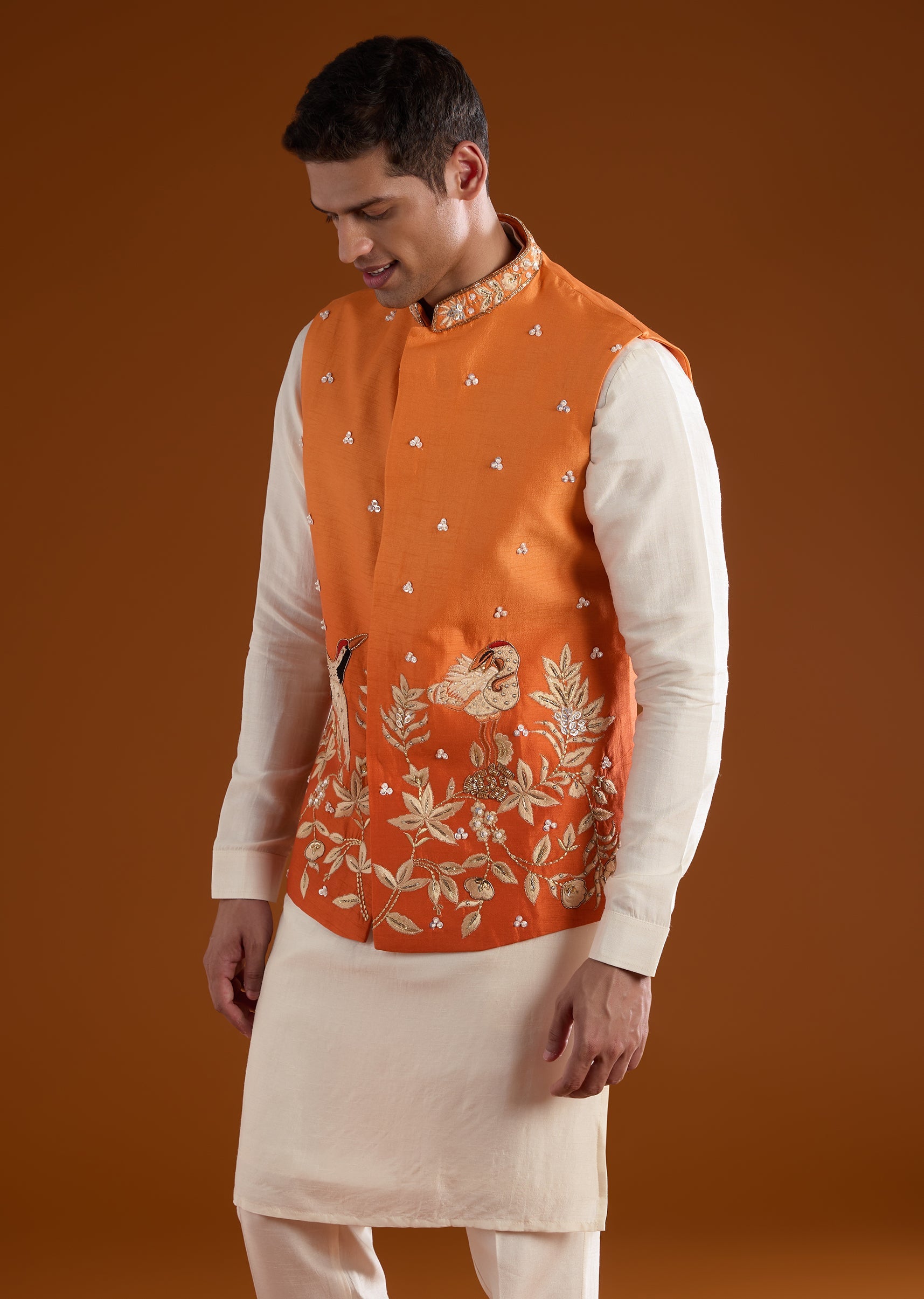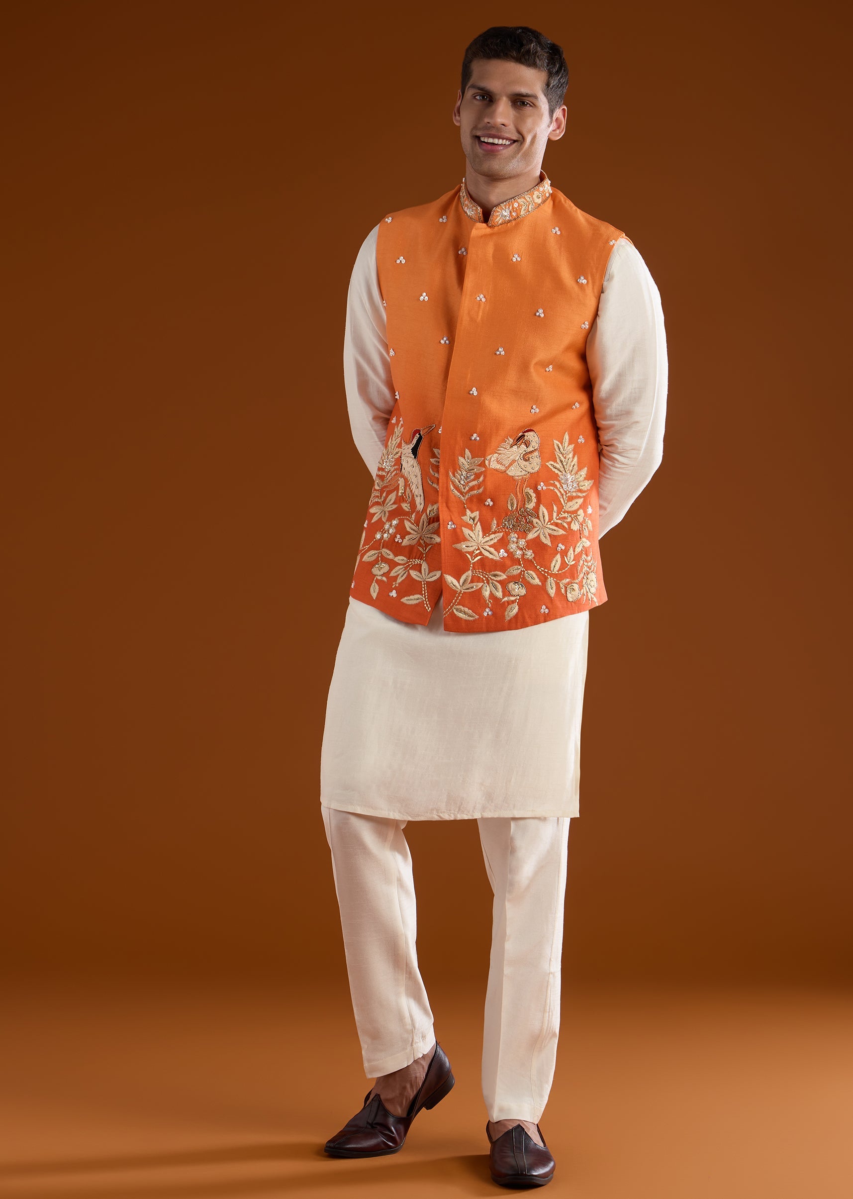 Orange Silk Mens Kurta Jacket Set With Thread Resham And Zardosi Work