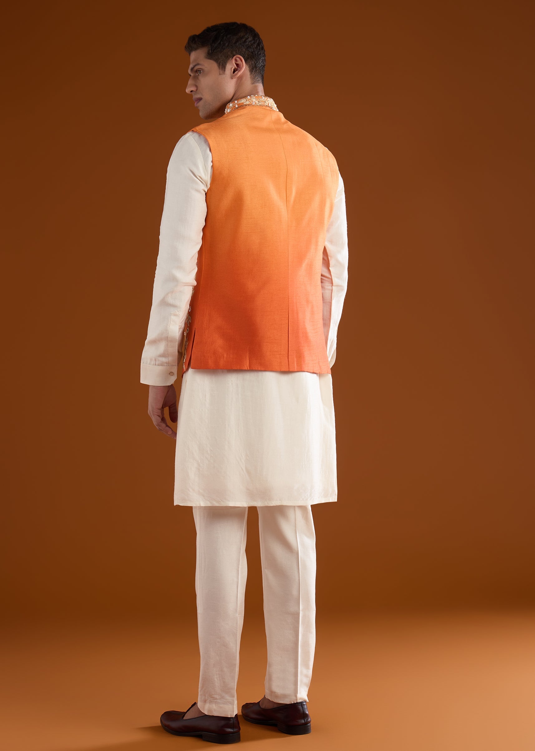 A vibrant orange silk kurta jacket set crafted for mehendi, haldi, and engagement celebrations, perfect for groomsmen and wedding guests. Enhanced with intricate thread, resham, and zardosi work, it exudes festive elegance while maintaining a structured silhouette. The full sleeves and mandarin collar provide a polished and regal look ideal for traditional wedding occasions. Awarded as the Most Trusted Brand, we're delivering styles you love, just as promised.