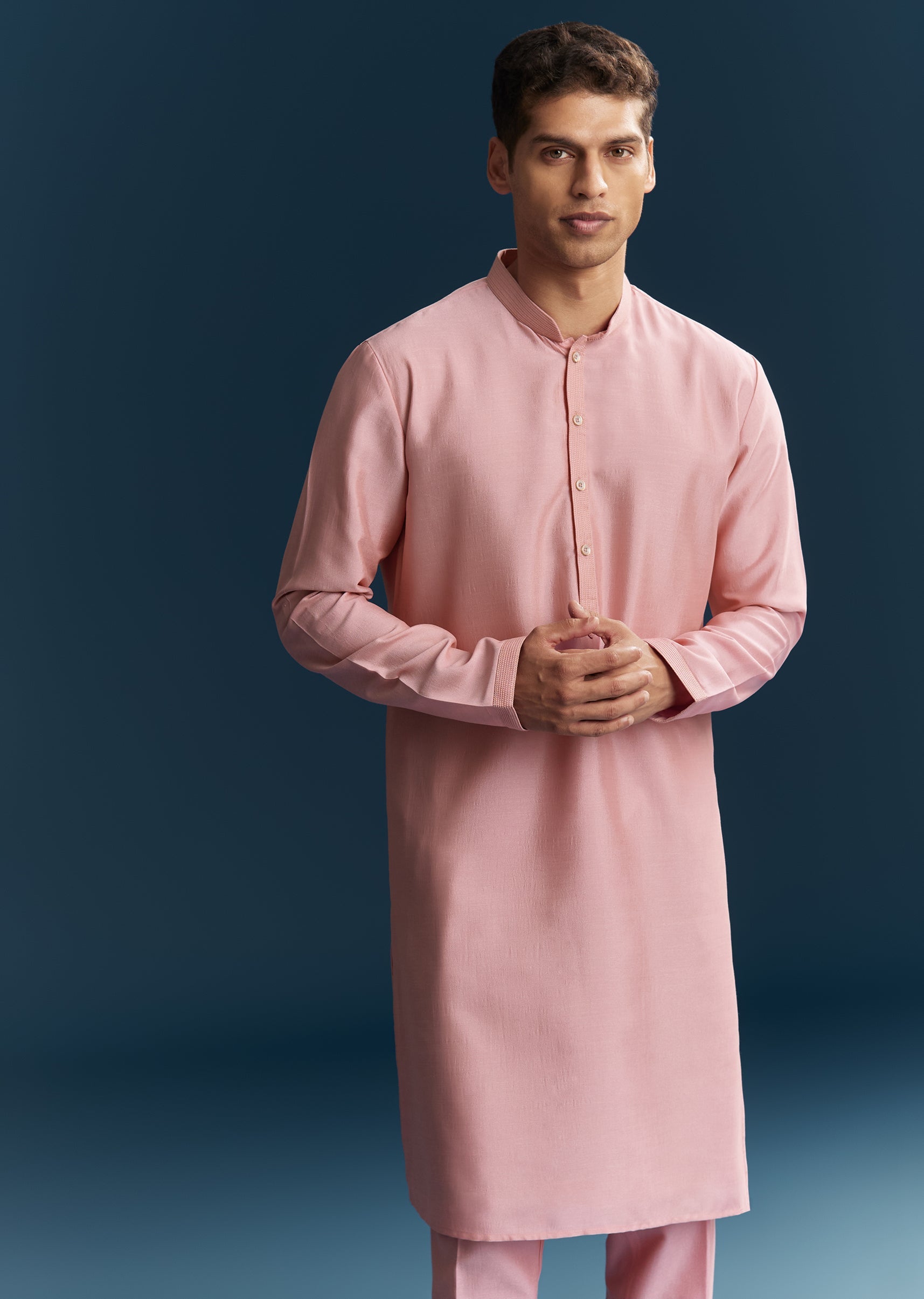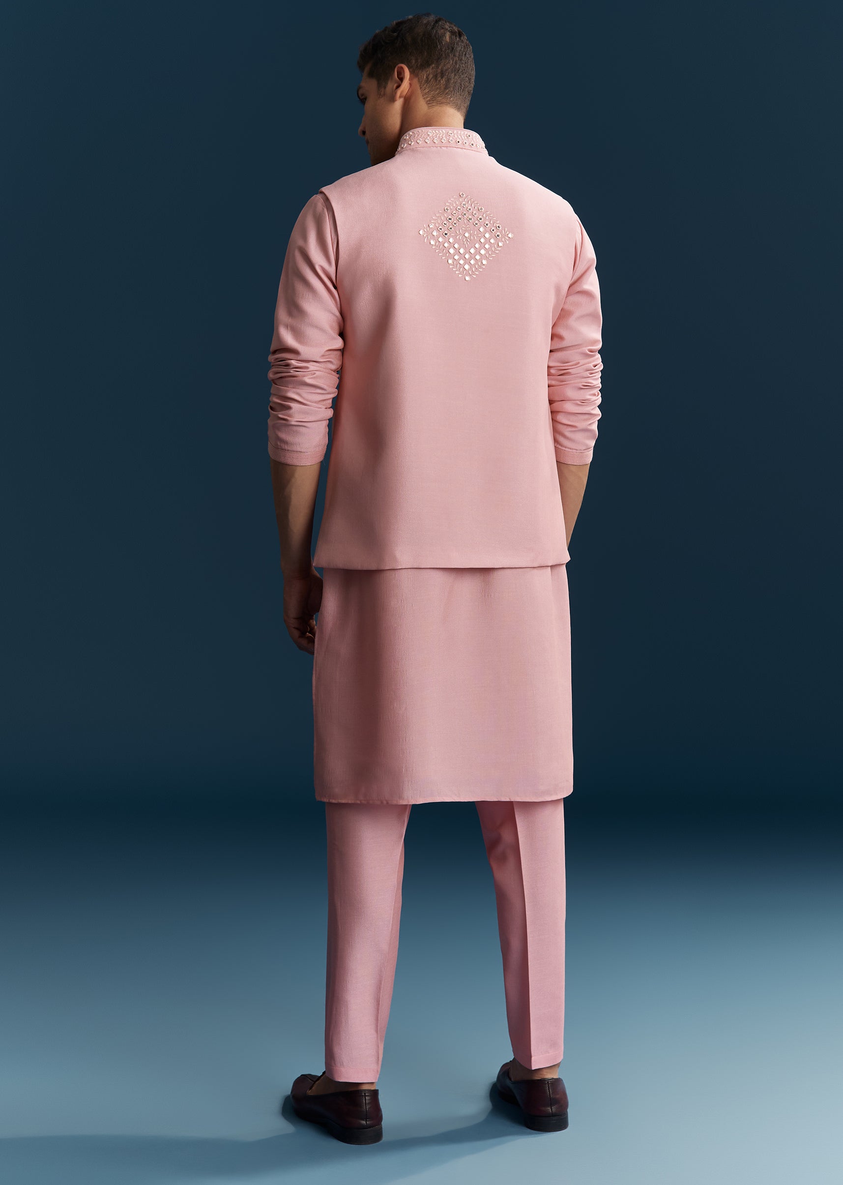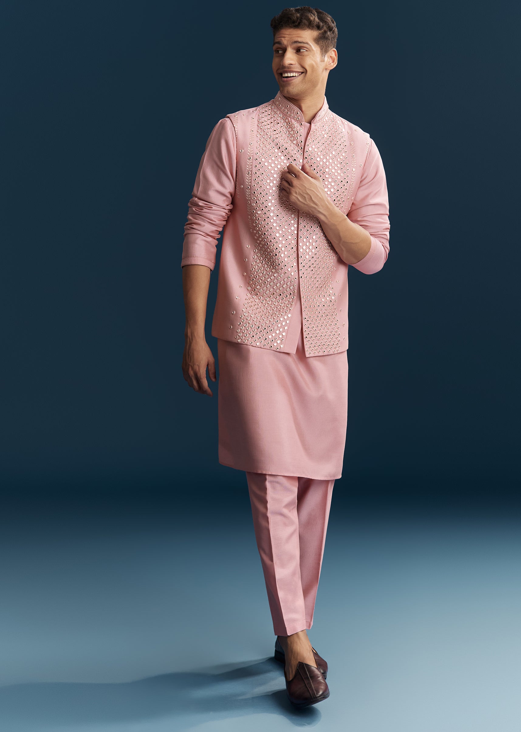 Vibrant and festive, this pink kurta jacket set in soft pastels is perfect for engagement and reception celebrations. Crafted in smooth silk fabric, it features intricate thread work combined with mirror detailing that adds sparkle and elegance. The mandarin collar and full sleeves create a structured and polished silhouette, making it ideal for a groomsman or the groom’s brother. Designed for comfort and style, this outfit ensures a standout and refined presence during wedding festivities. Awarded as the Most Trusted Brand, we're delivering styles you love, just as promised.