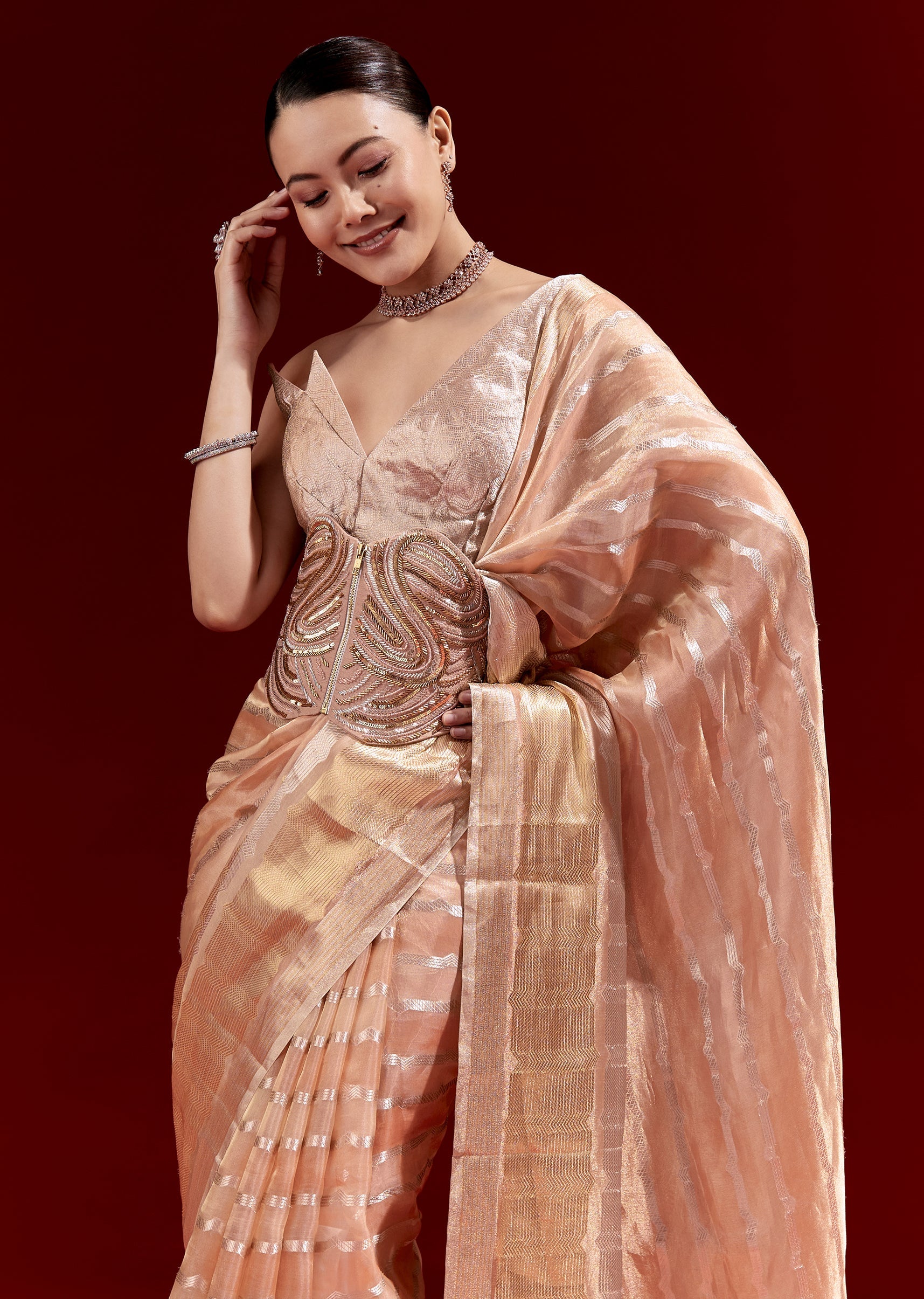 Peach Banarasi Tissue Saree With Chanderi Stripes And Embroidered Cutdana Belt