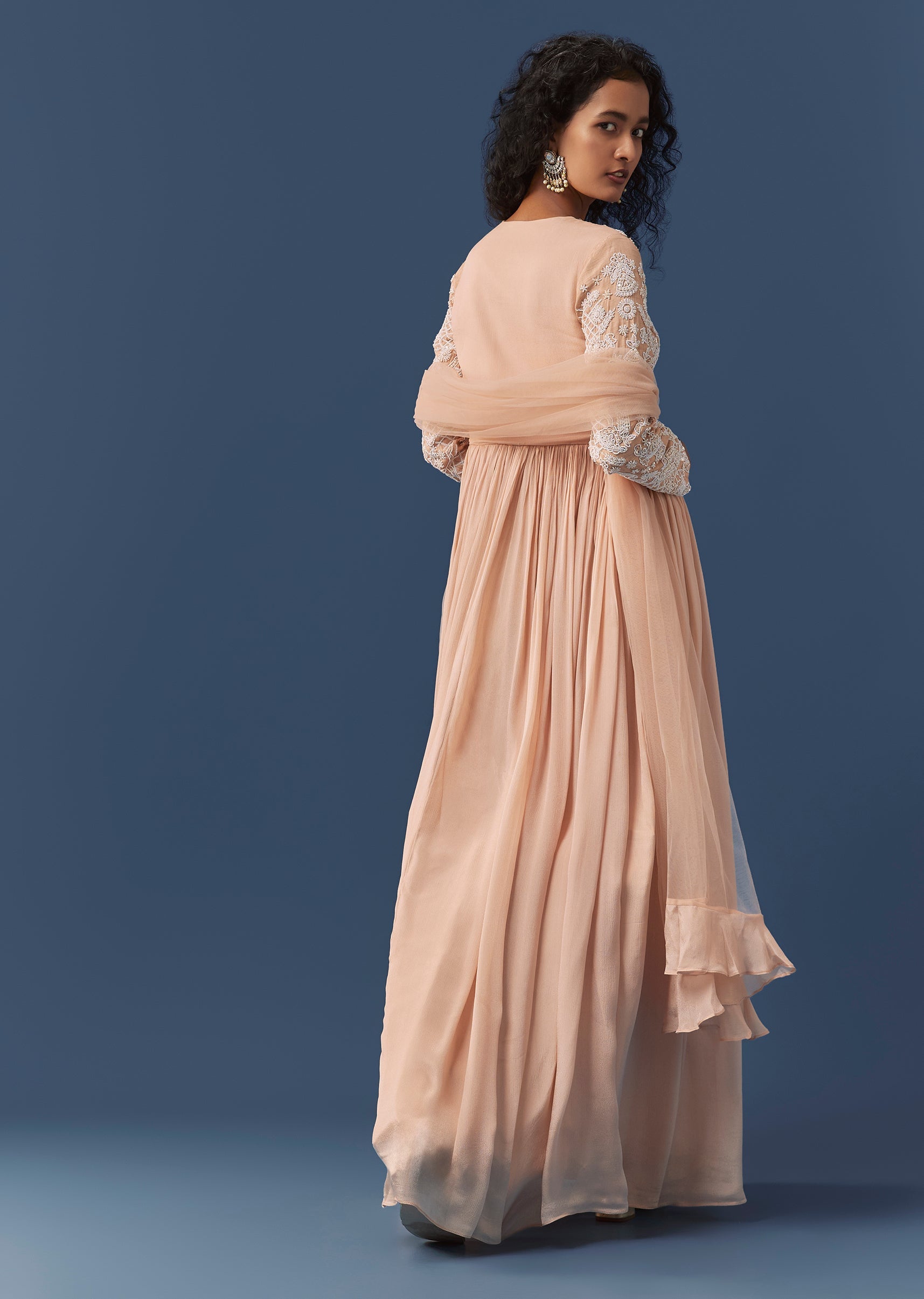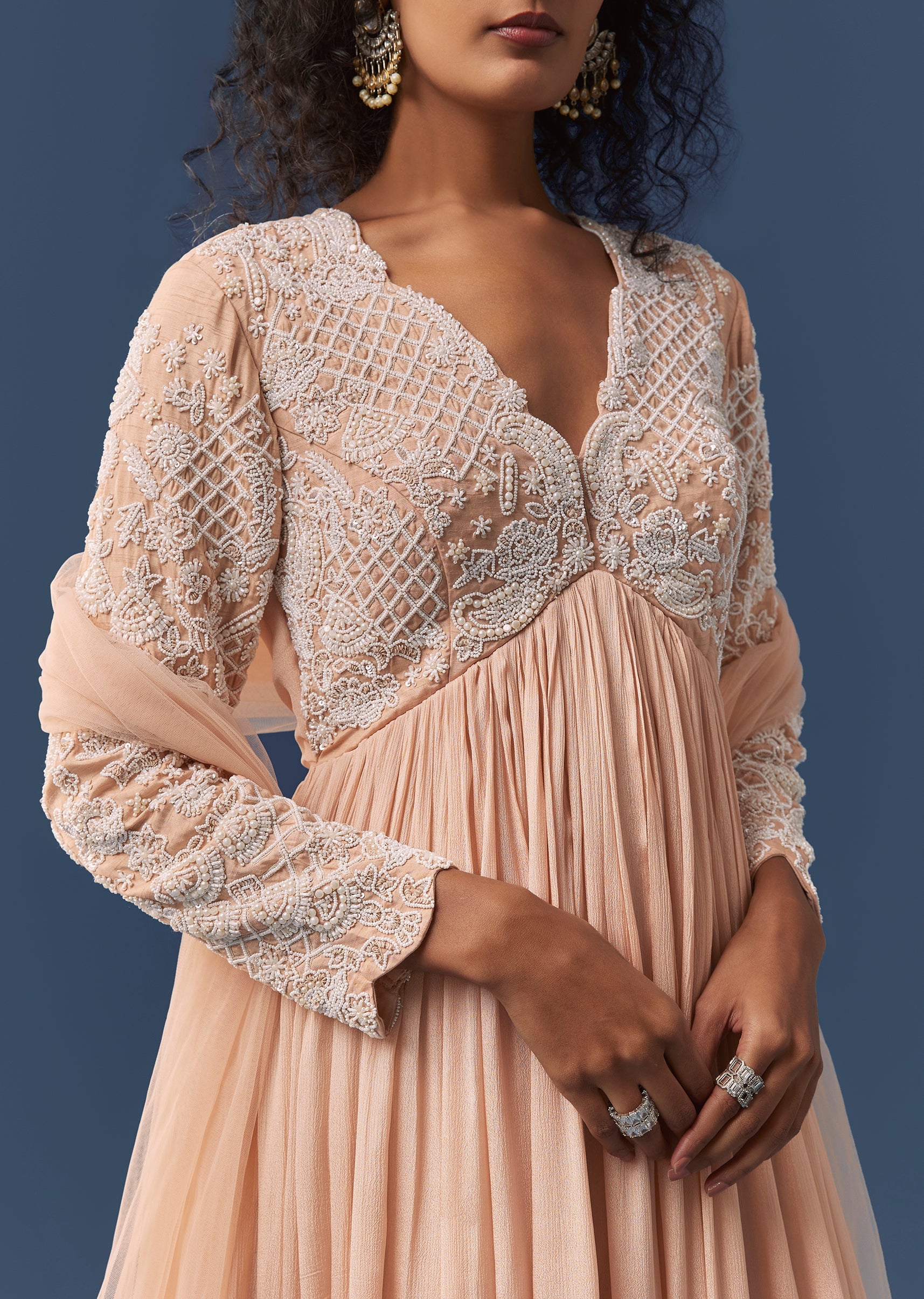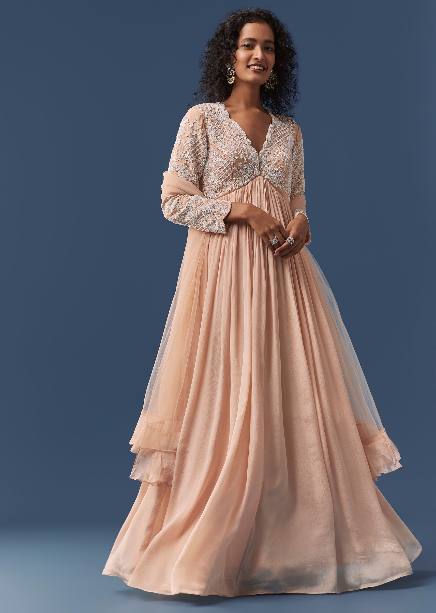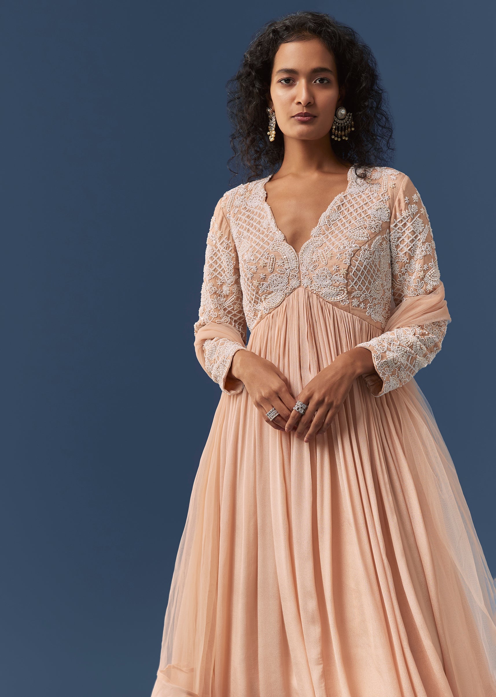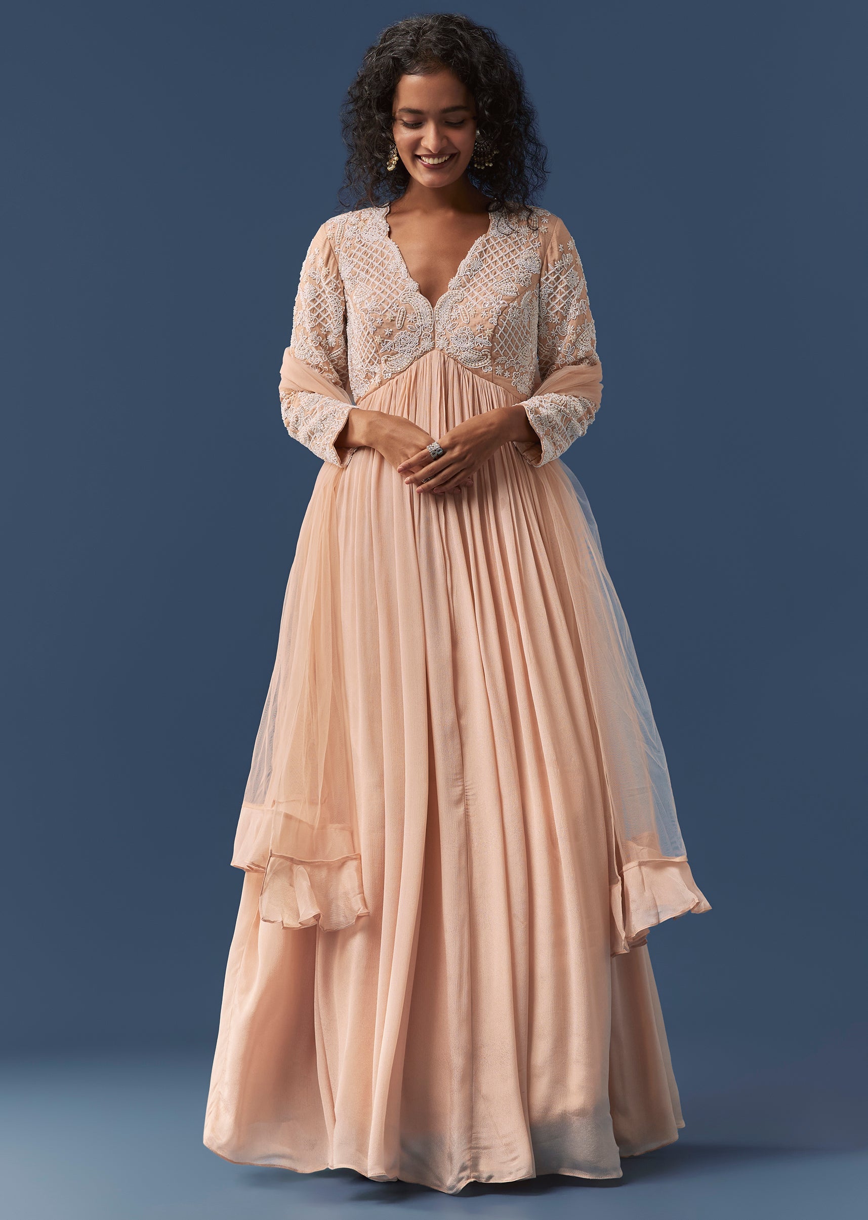 Soft, graceful, and effortlessly refined, this peach moti and sequins work chinon anarkali exudes understated elegance. The V neckline and 3/4th sleeves are delicately highlighted with subtle moti embellishments, adding... More Product Details