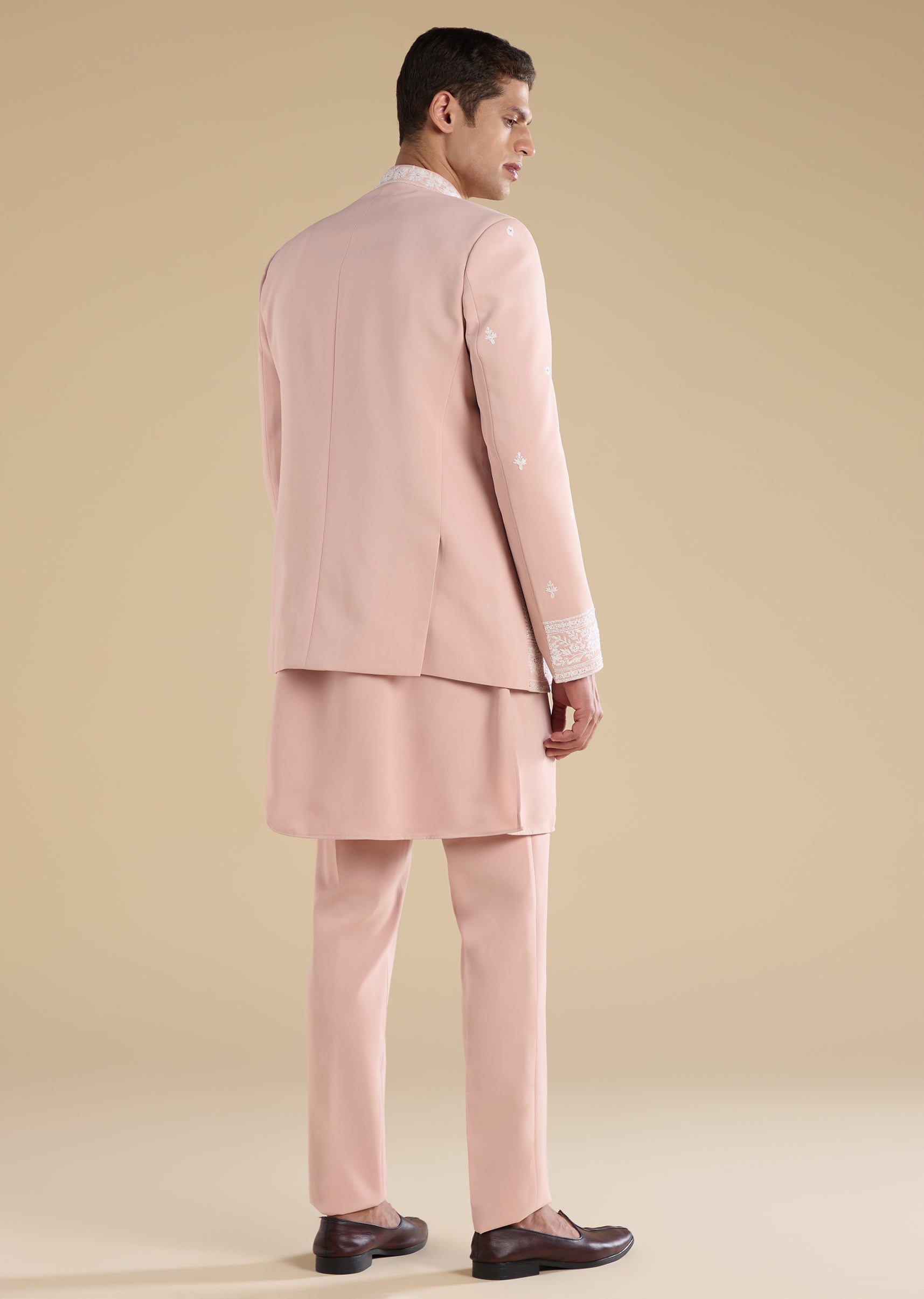 Tailored in suiting fabric, this peach jodhpuri set features thread embroidery with motif accents and sequin detailing. Finished with a mandarin collar, full sleeves and button with hook-eye closure, it comes with a matching kurta and straight-fit mid-waist pants—ideal for mehendi, wedding and reception wear. Awarded as the Most Trusted Brand, we're delivering styles you love, just as promised.