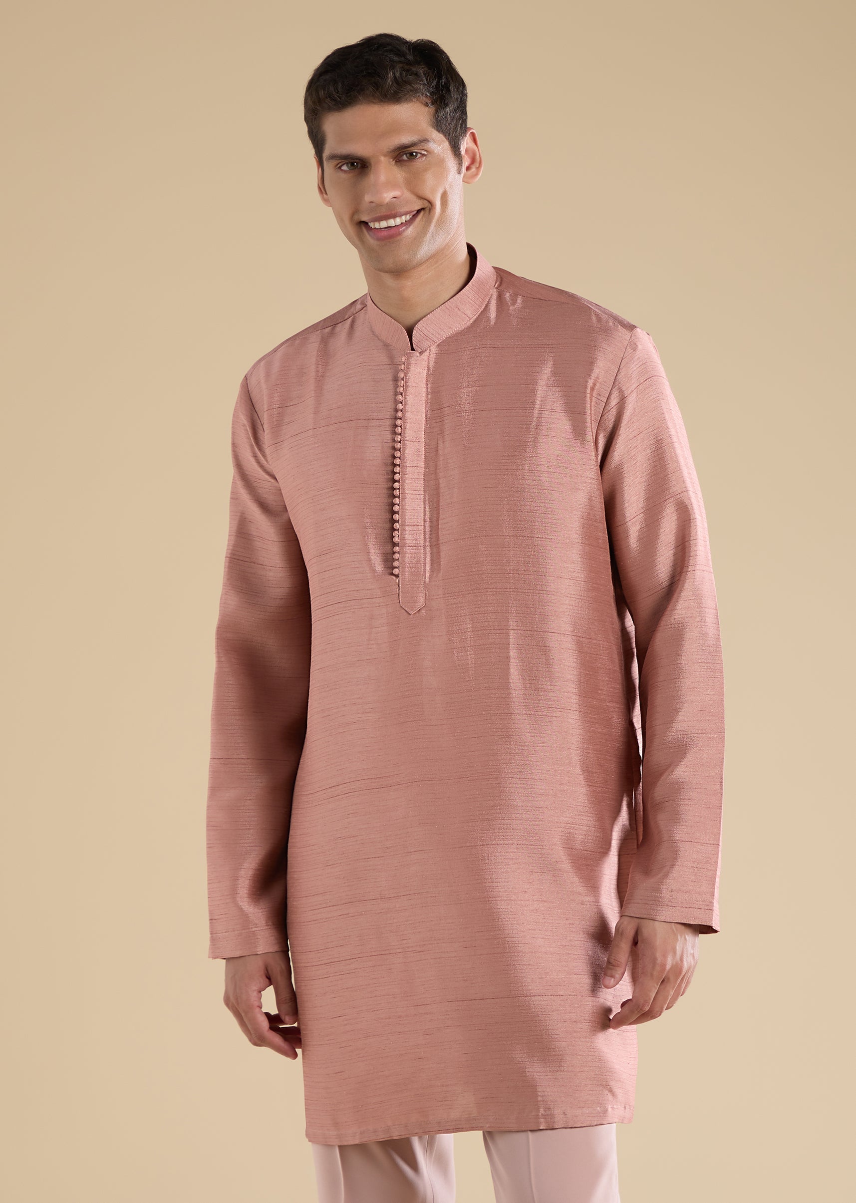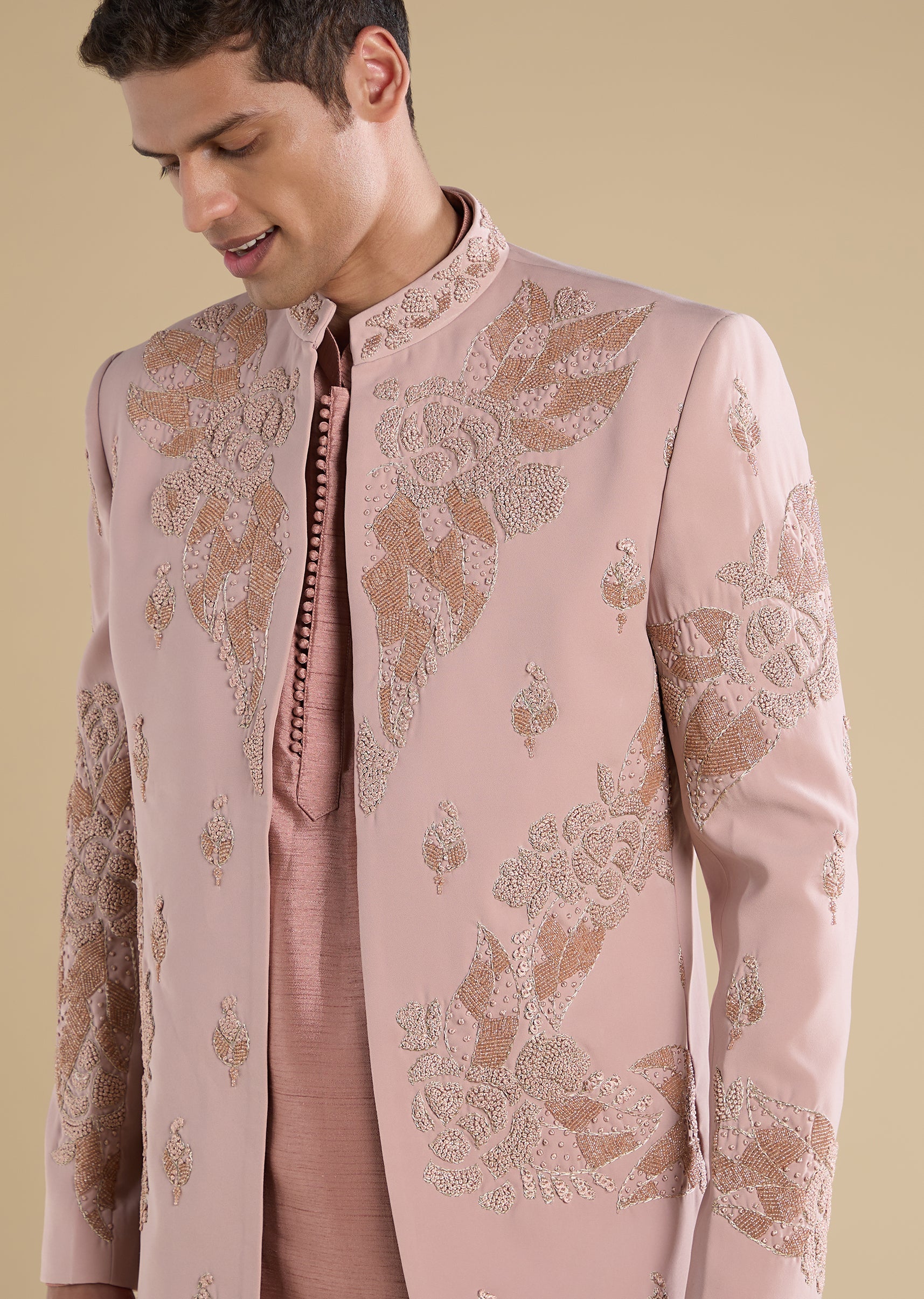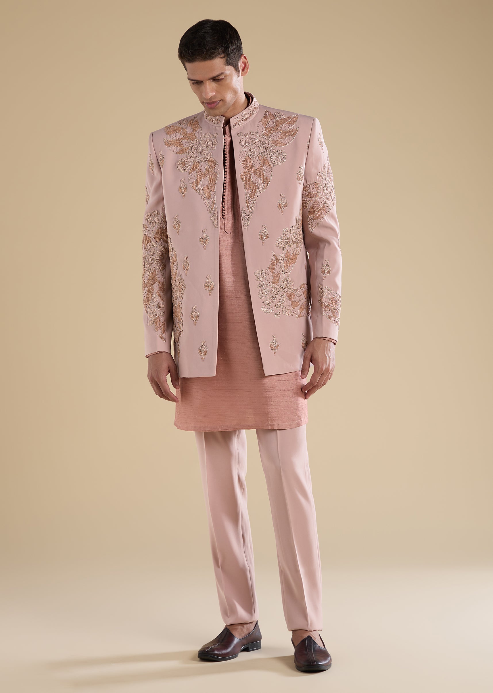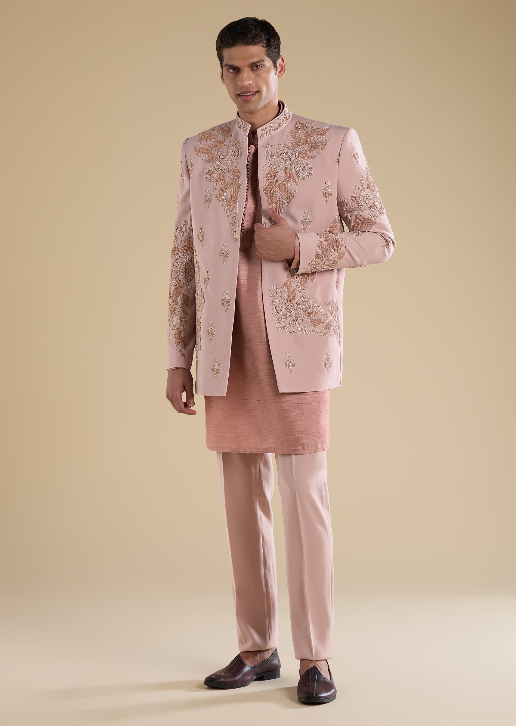 Softly elegant with classic appeal, this peach Jodhpuri set is crafted in refined suiting fabric for a structured, ceremonial look. Designed with a mandarin collar, full sleeves, and side slits,... More Product Details