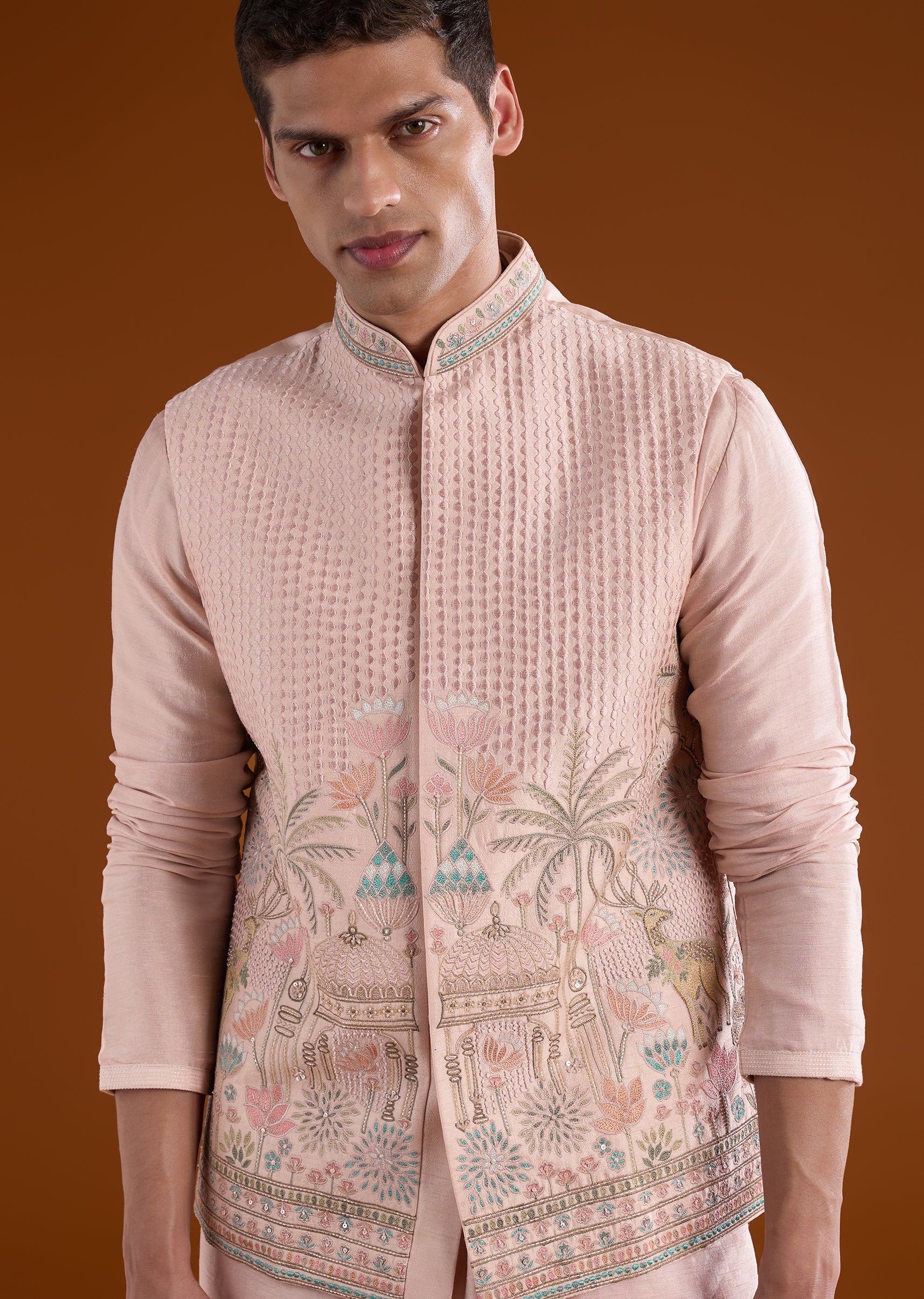 Softly festive with graceful detailing, this peach kurta jacket set is crafted in smooth art silk for a refined traditional look. The kurta features a mandarin collar and full sleeves, paired with a jacket highlighted with resham thread and cut dana embroidery. Finished with straight-fit trousers, it’s perfect for haldi and festive celebrations. Awarded as the Most Trusted Brand, we're delivering styles you love, just as promised.
