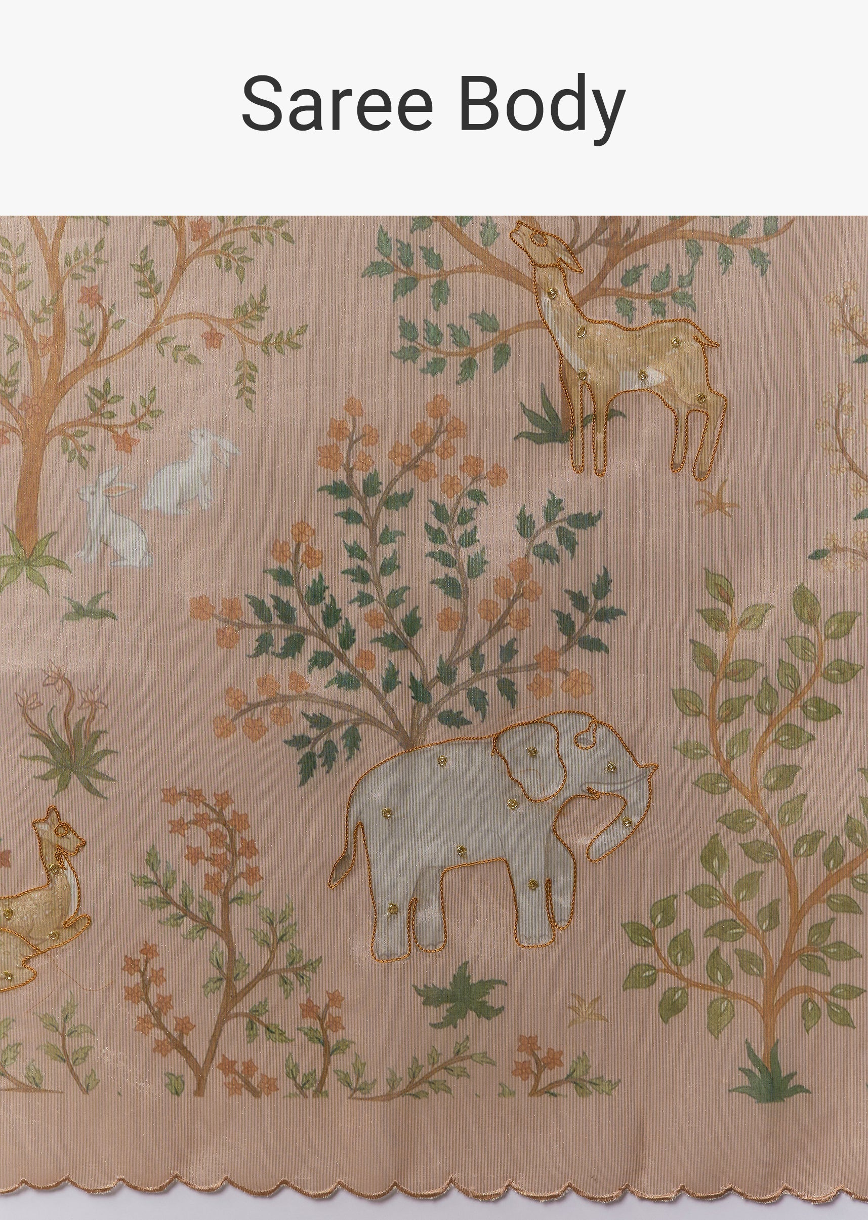 Peach Gold Tussar Saree With Scallop Border And Thread Work Motifs