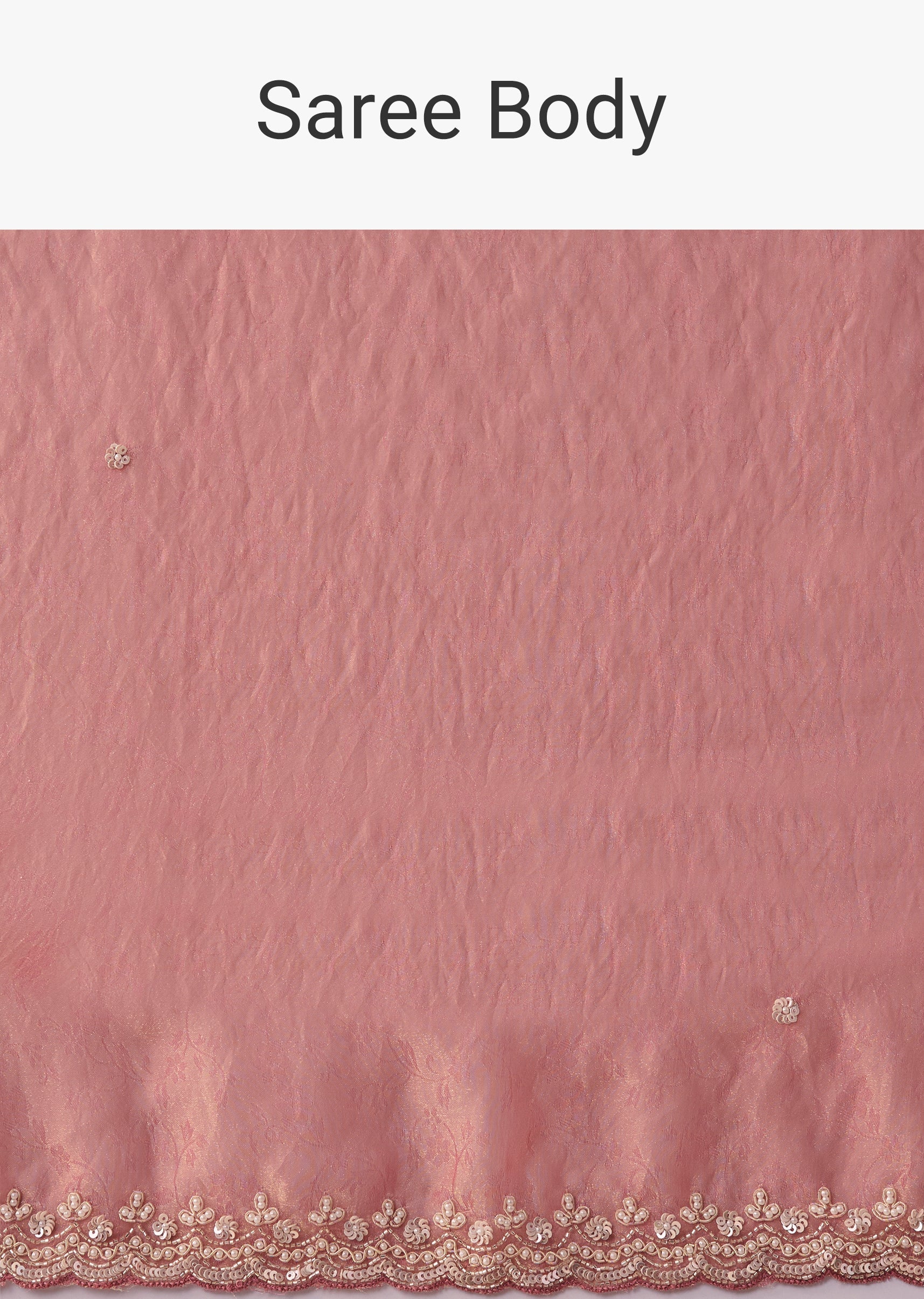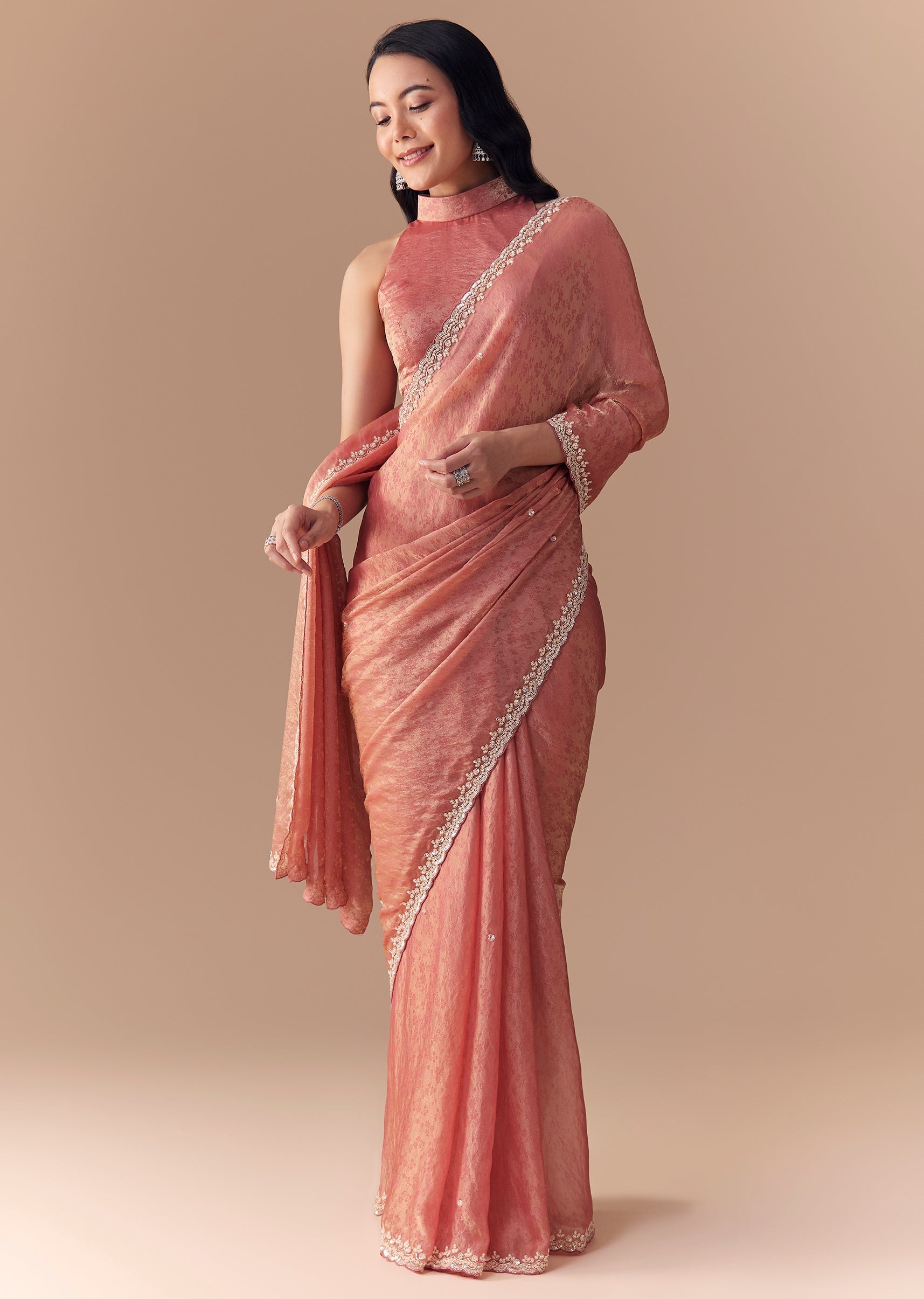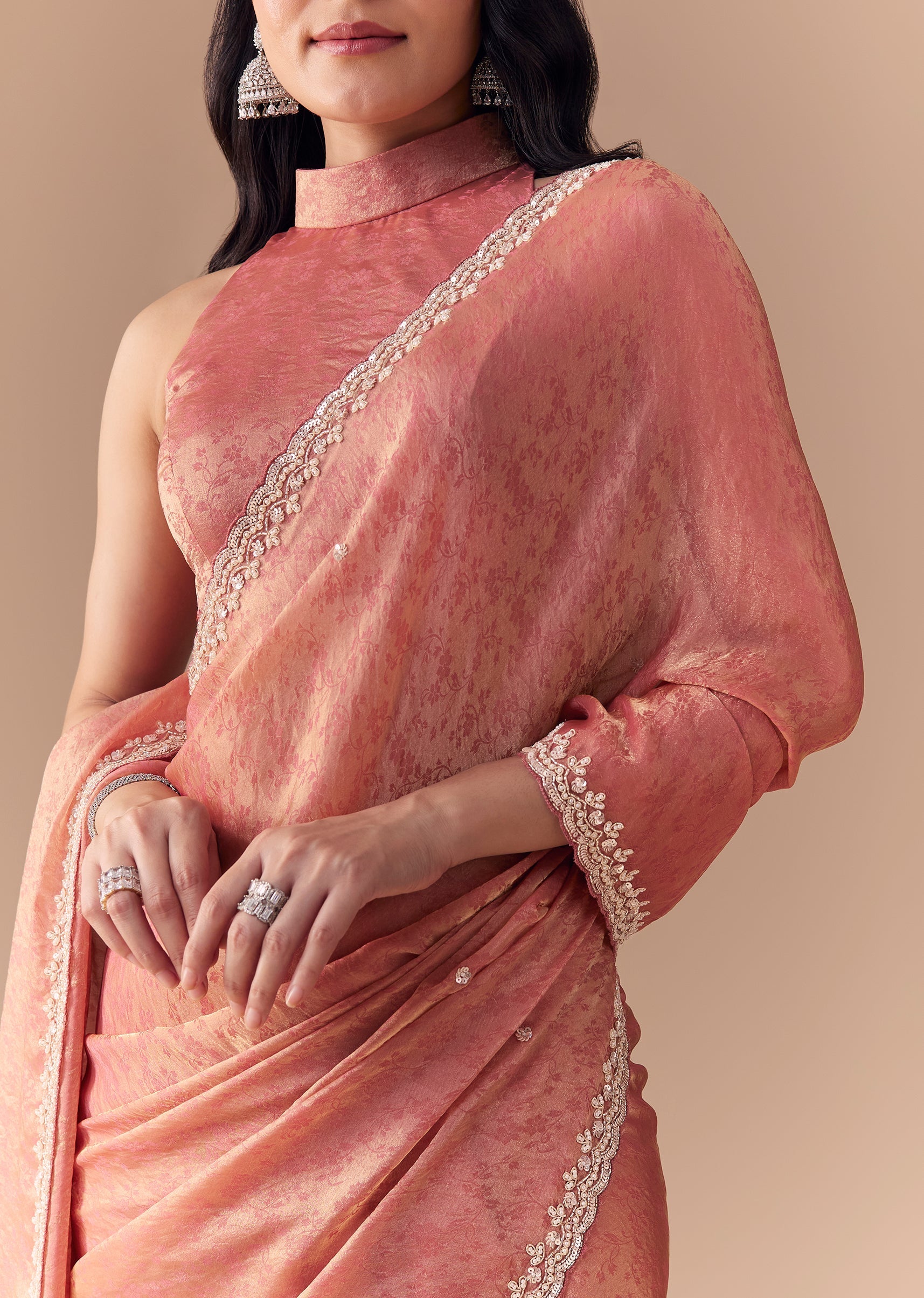 Peach Jacquard Print Tissue Saree with Unstitched Blouse