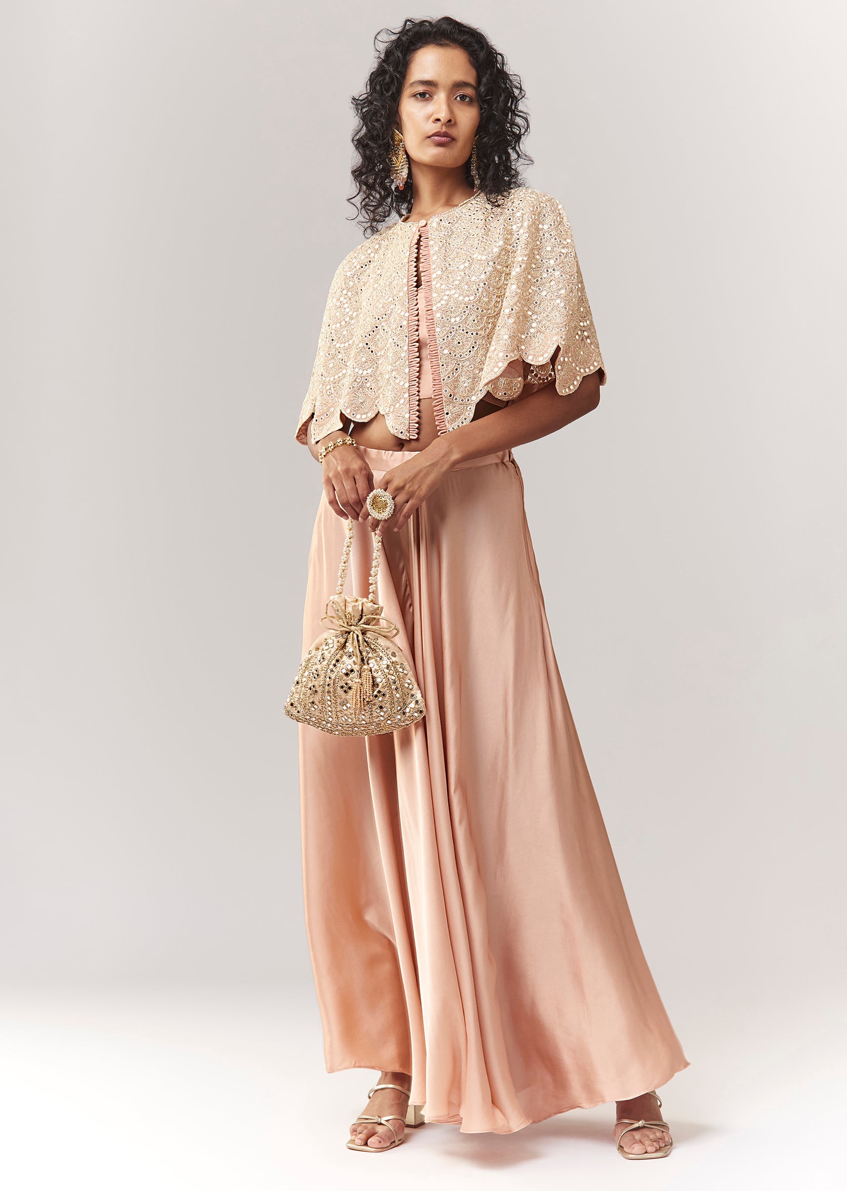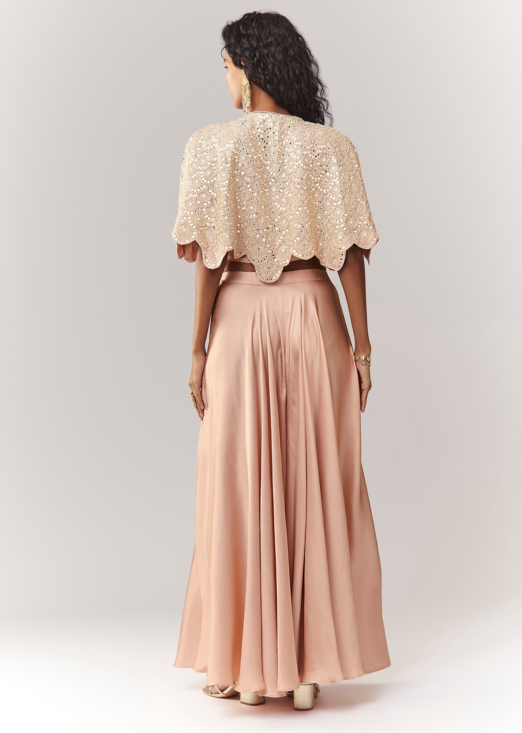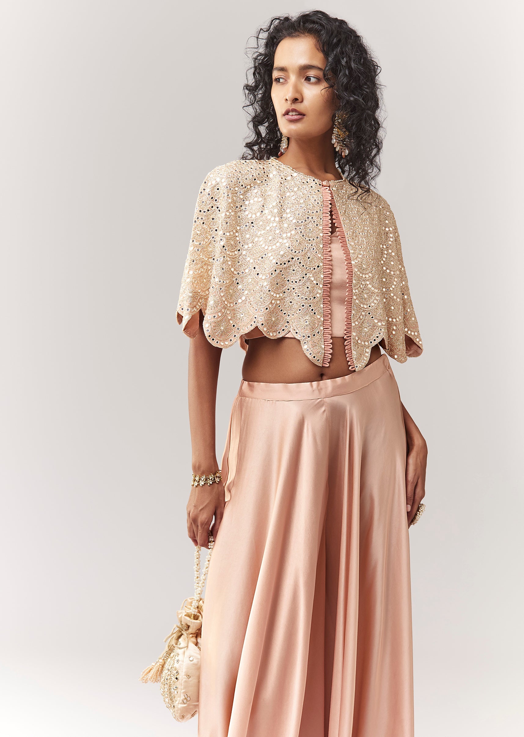 Peach Mirror And Cutdana Work Cape Set With Palazzo