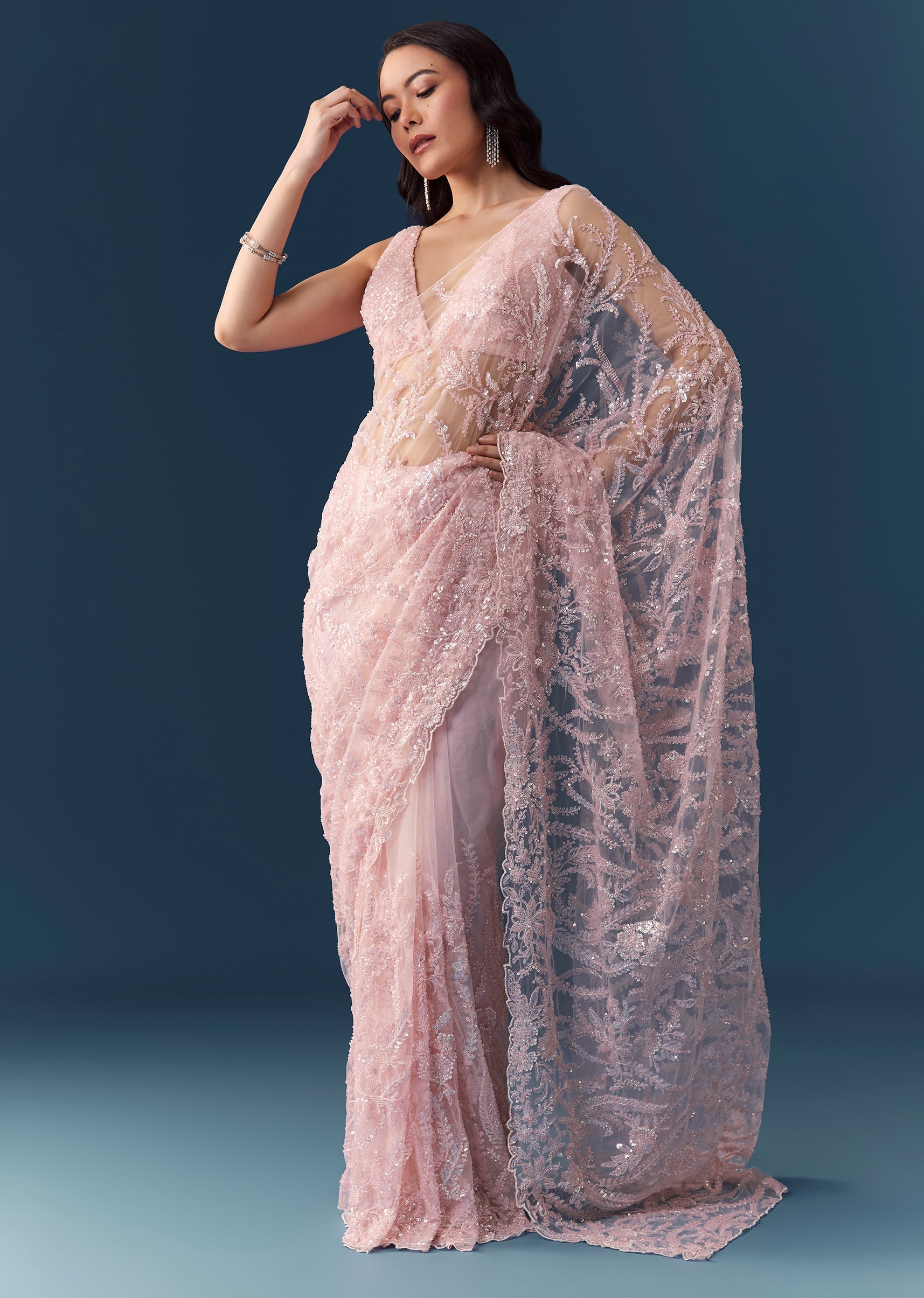 Embrace ethereal beauty with this peach heavy embroidered net saree, showcasing an intricate floral jaal design all over, embellished with delicate cutdana, sequins, and bead work. The elegant cutwork border... More Product Details