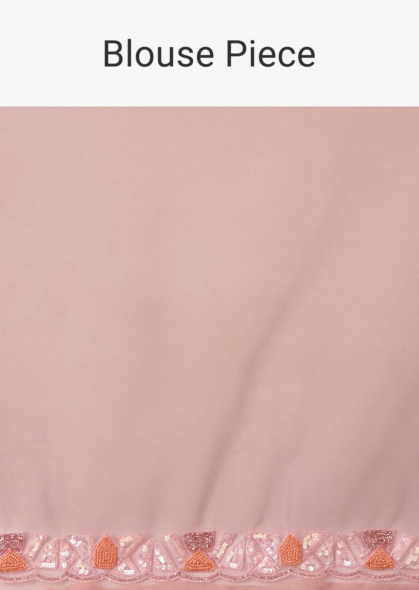 Bathed in a gentle pastel hue, this peach net saree glistens with all-over sequin detailing that catches light with every step. The scalloped border is delicately embroidered with sequins and... More Product Details