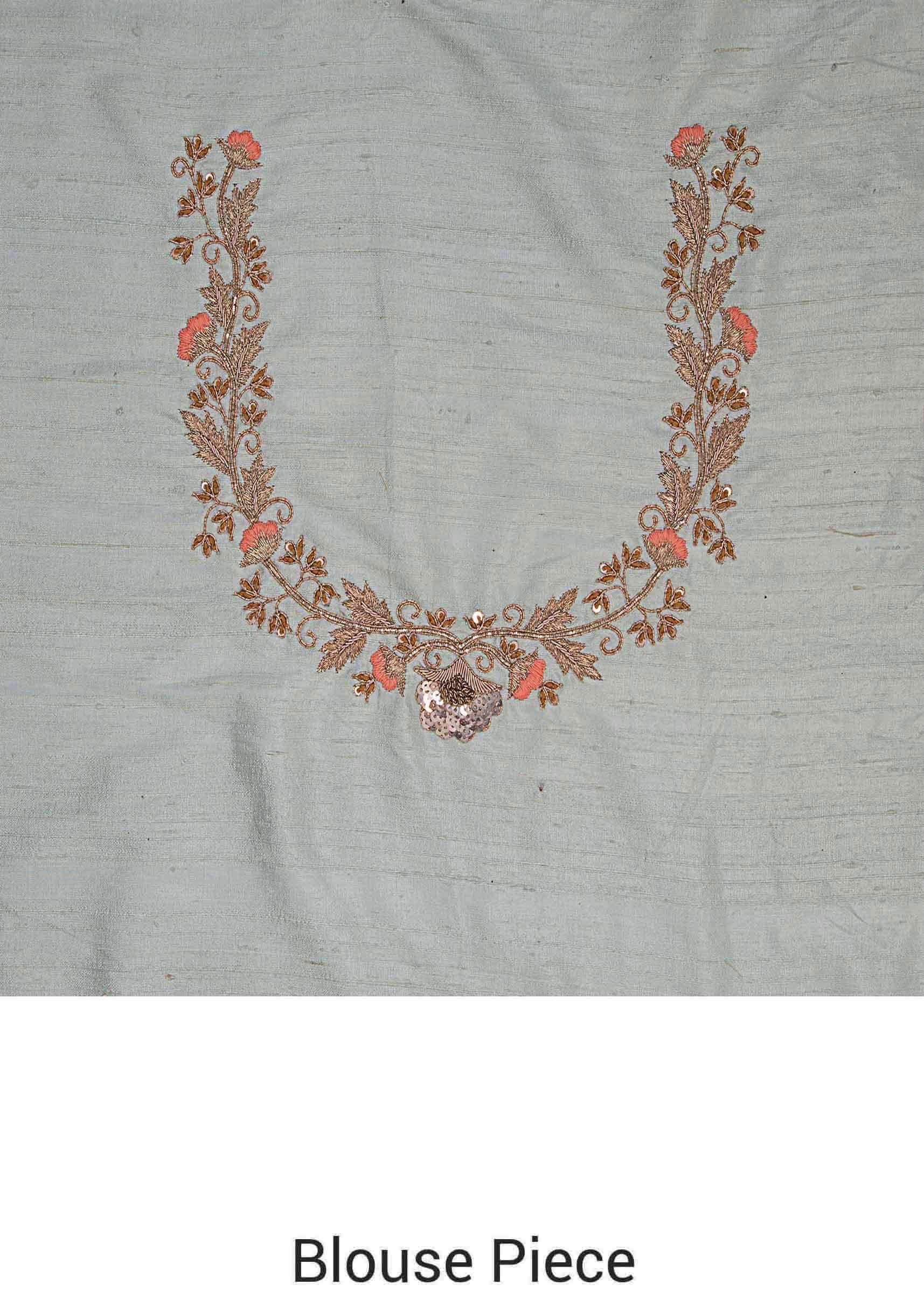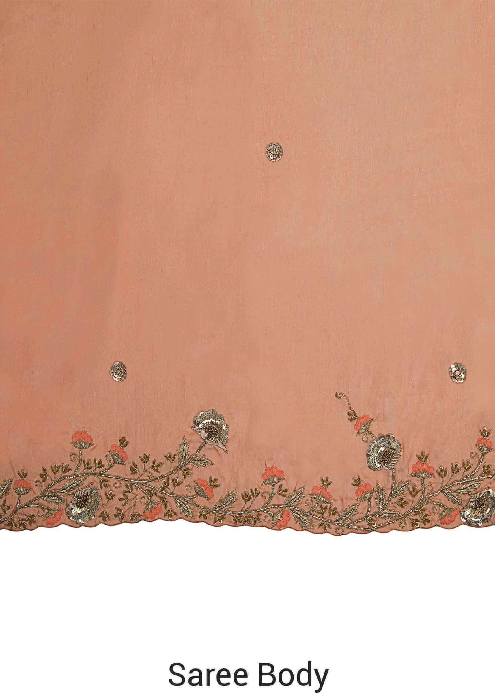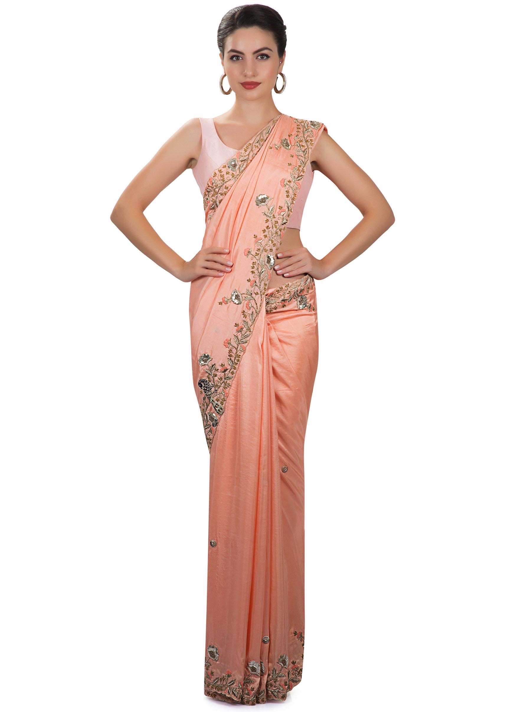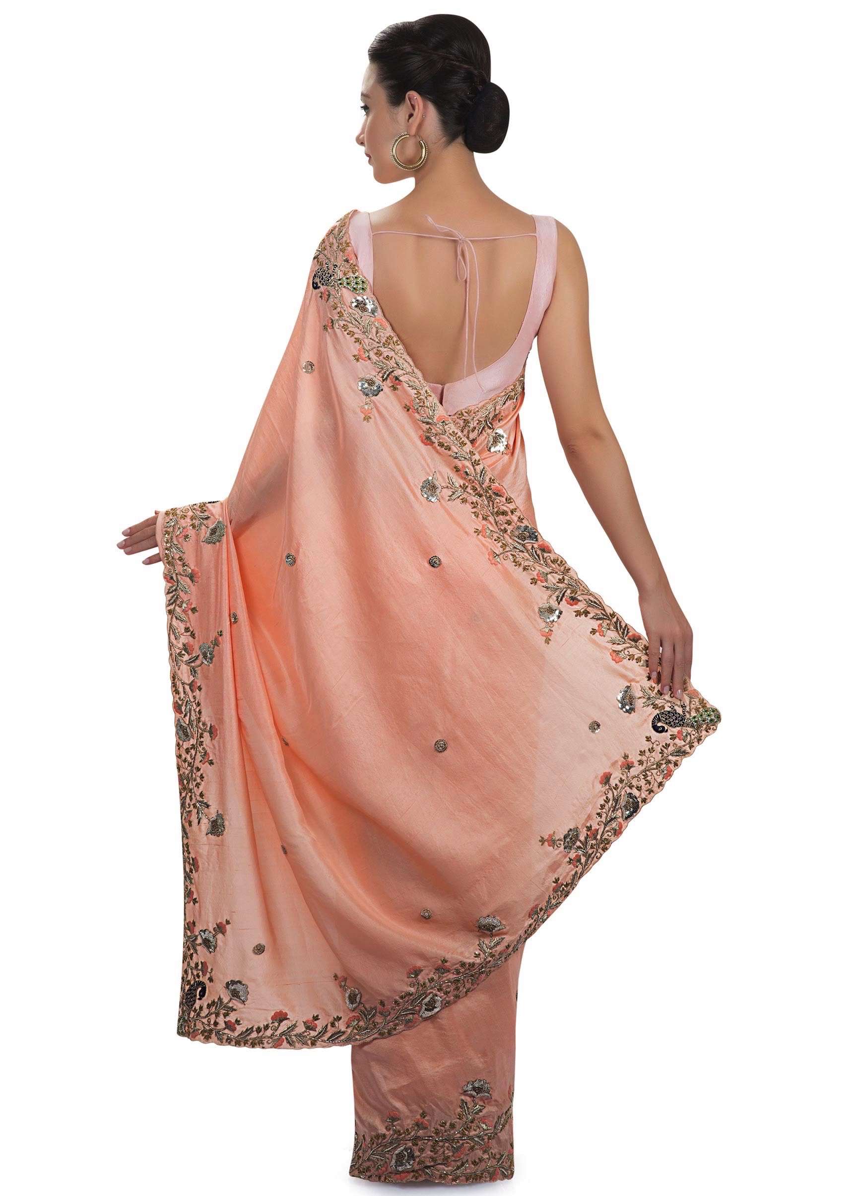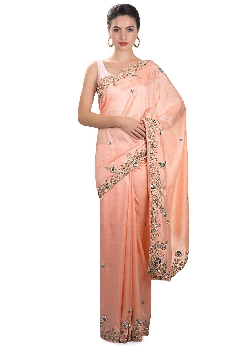 Peach satin chiffon saree with floral motif embellished with zari and sequins only on Kalki